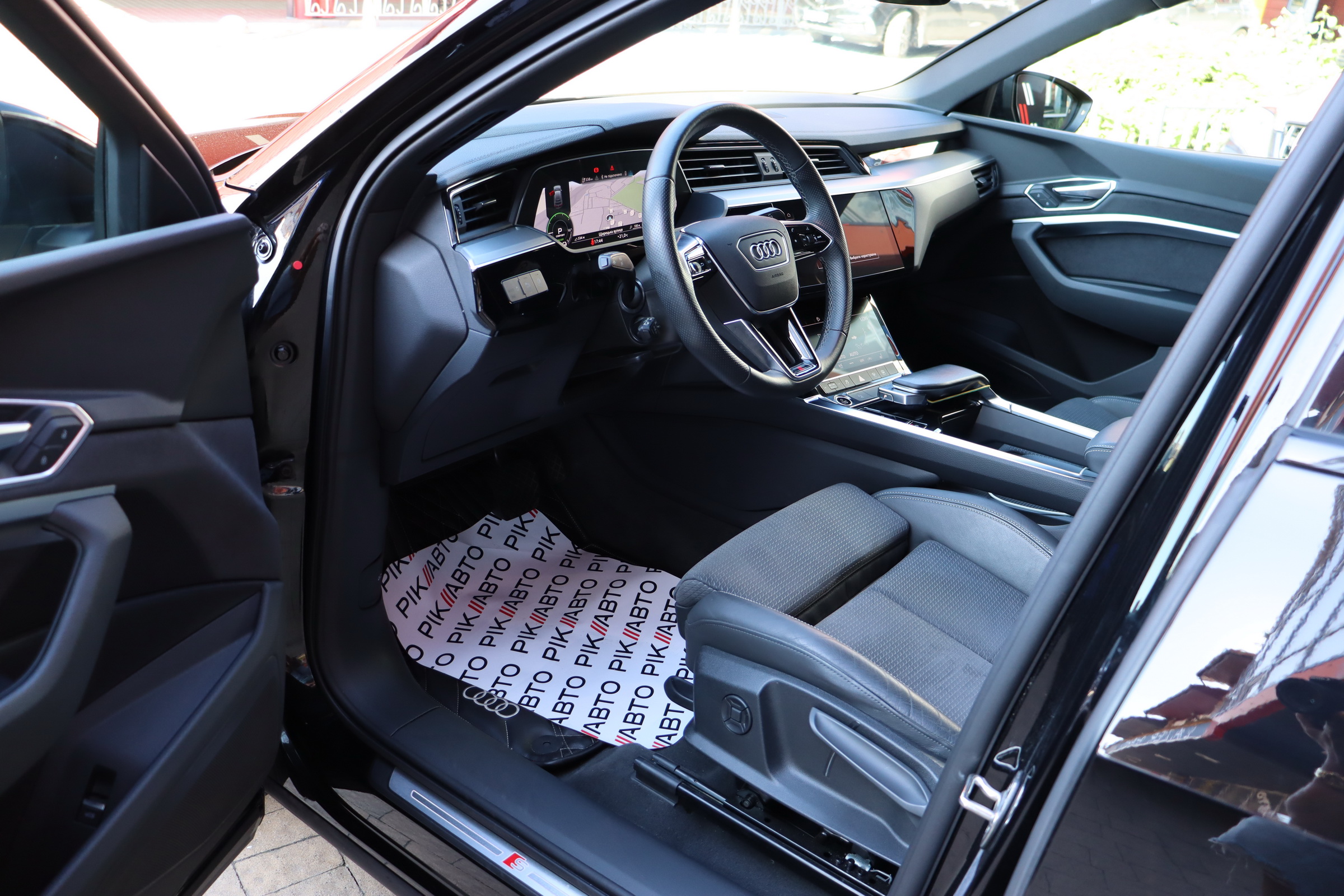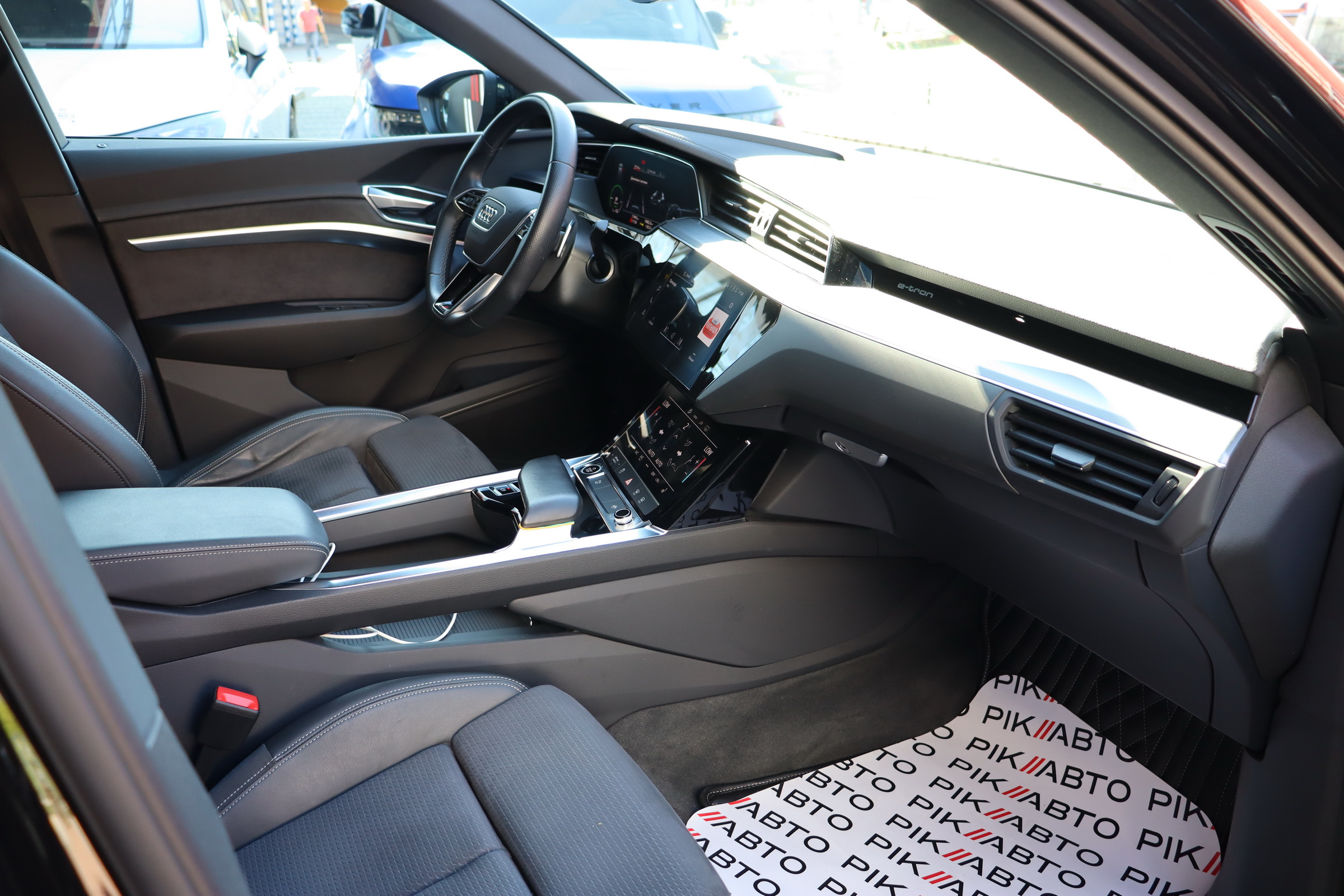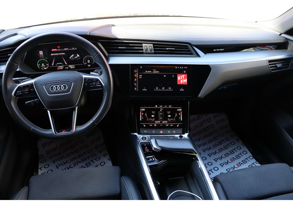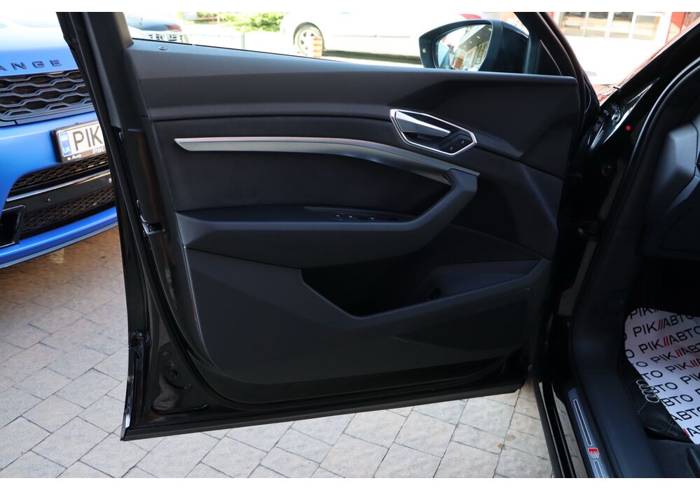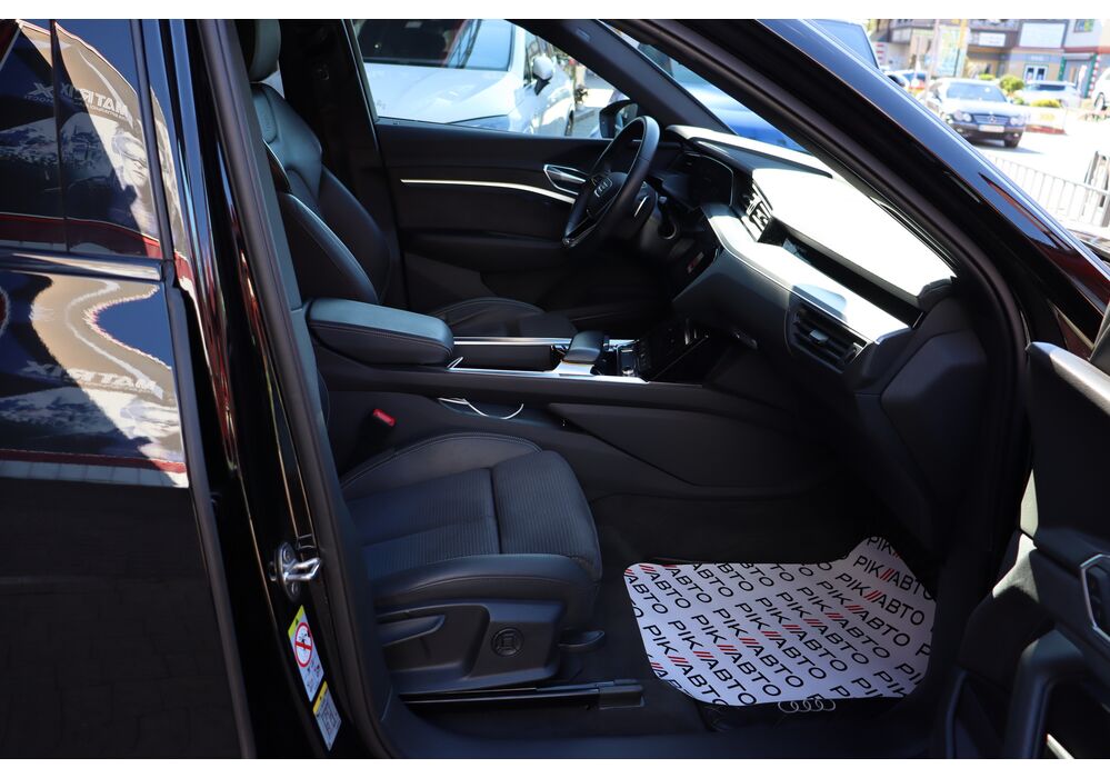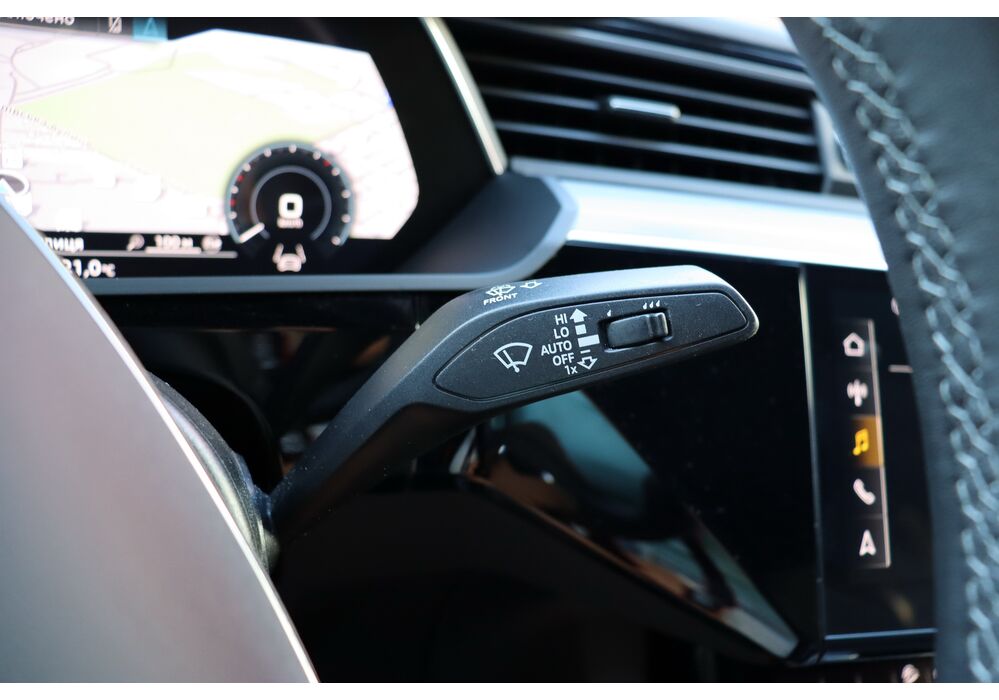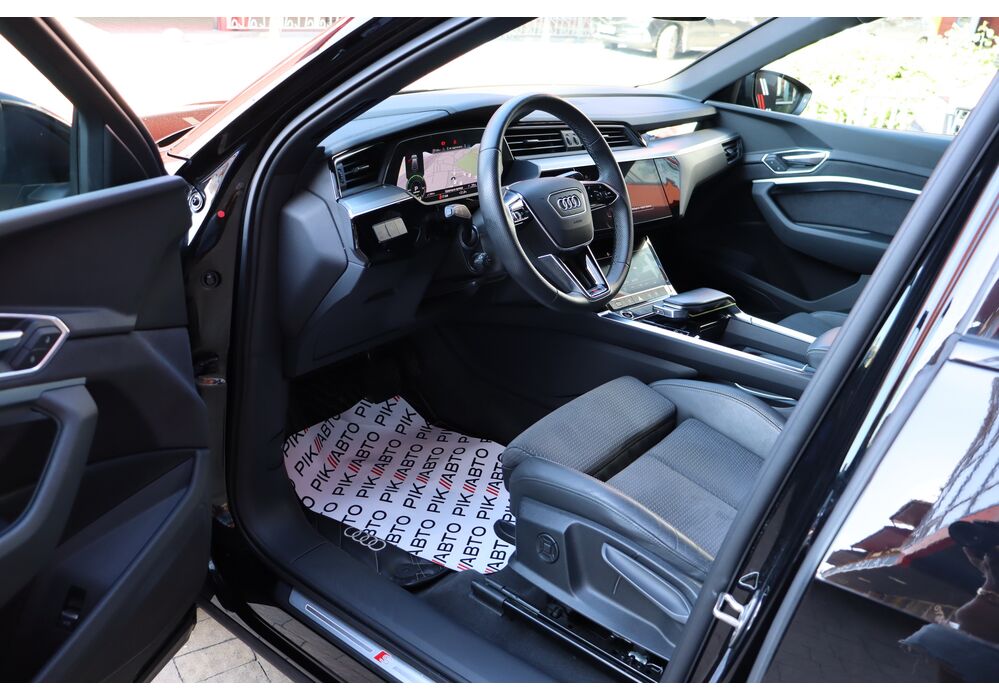 У салоні - вже відомі нам по інших моделях марки два дисплея системи MMI в центрі, а також 12.3-дюймова віртуальна панель приладів c можливістю кастомізації. Відмінною особливістю є оформлення центрального тунелю, а також «селектор КПП», який насправді реалізований як упор під руку, а перемикання режимів їзди здійснюється великим пальцем. Що стосується багажника, то його обсяг становить 600 л під полицею (+1700 л зі складеним в рівну підлогу заднім рядом), але ще один відсік доступний і спереду (frunk - тобто front trunk - має в своєму розпорядженні 60 літрами обсягу, там зручно зберігати кабелі для зарядки ).