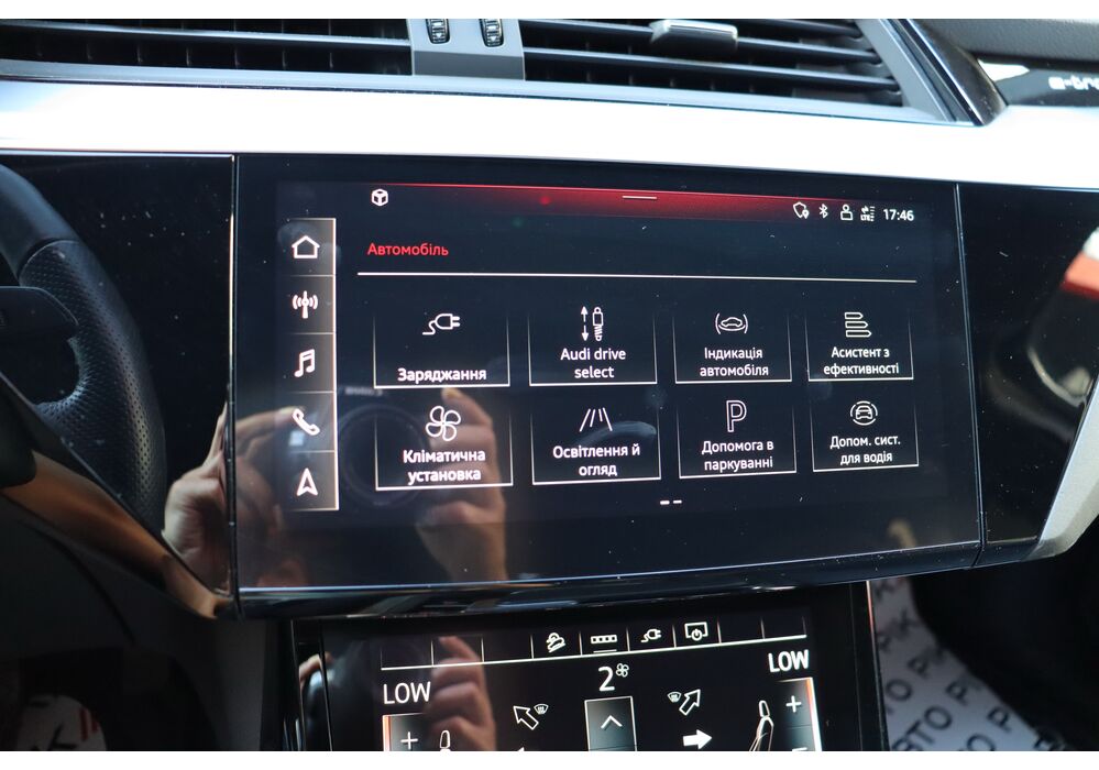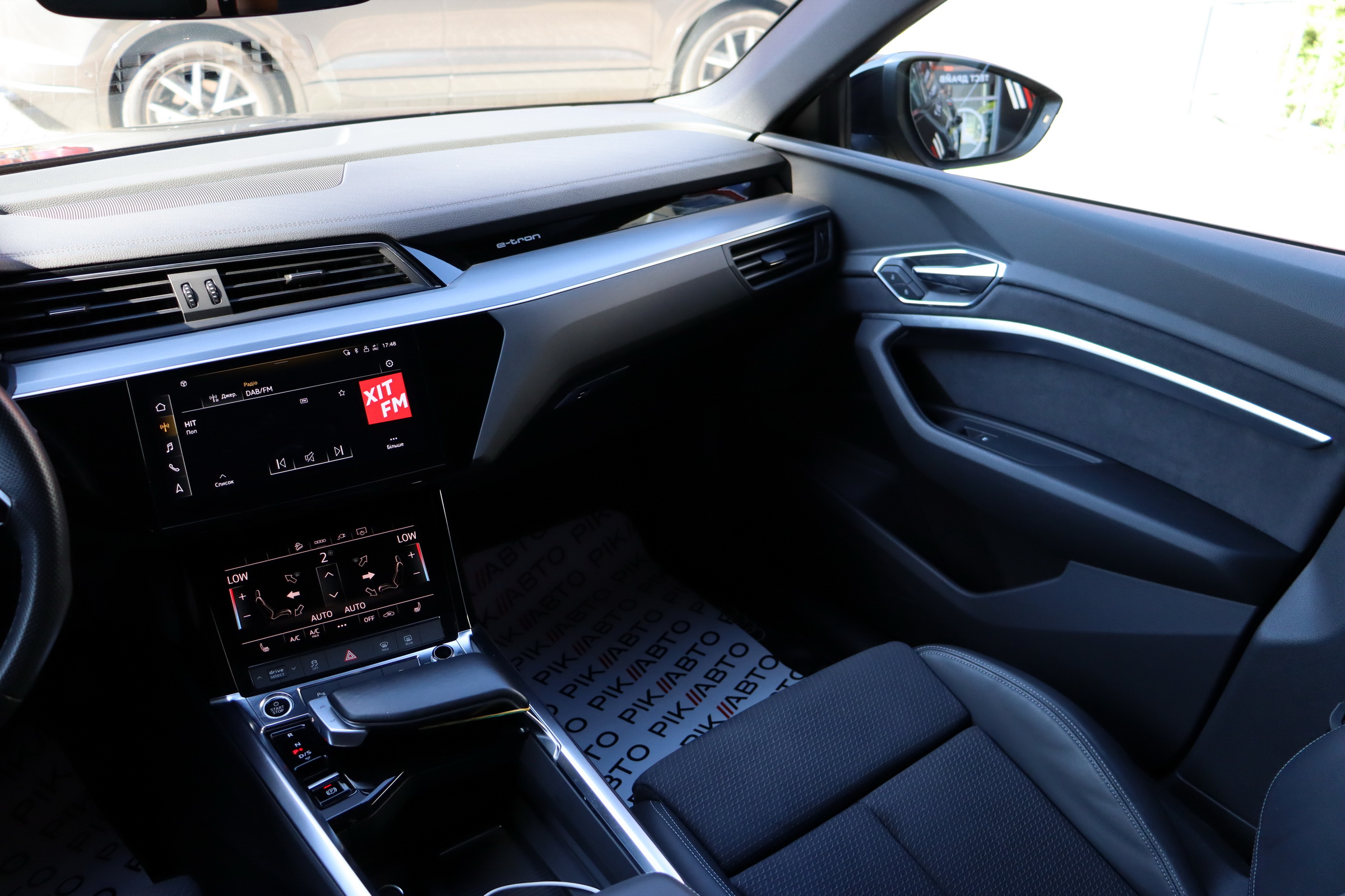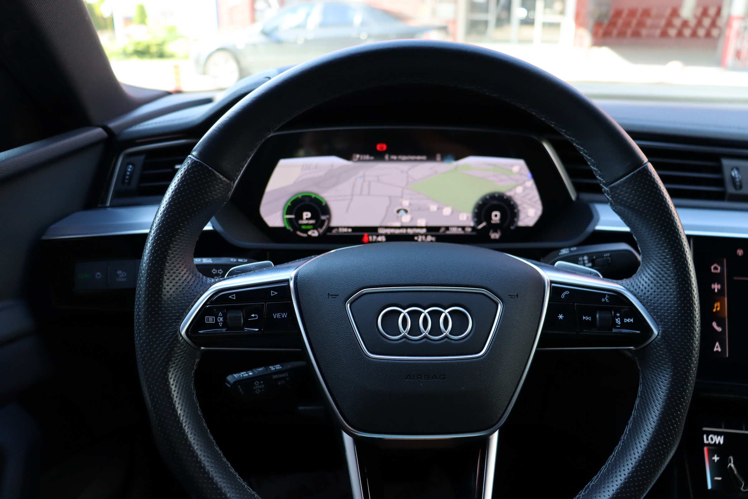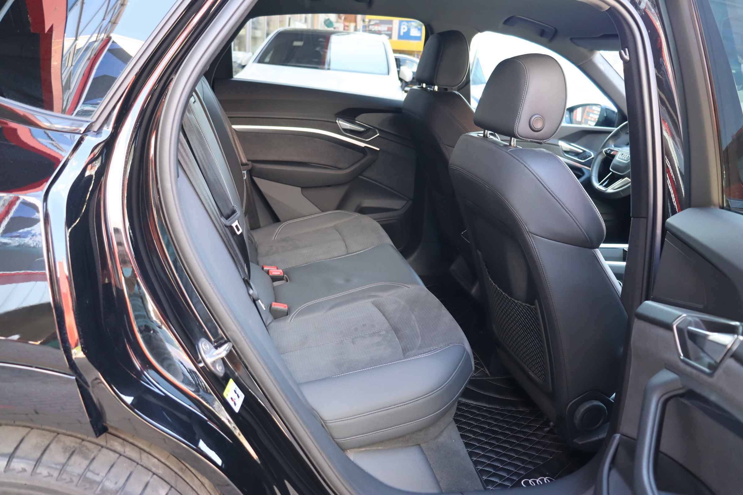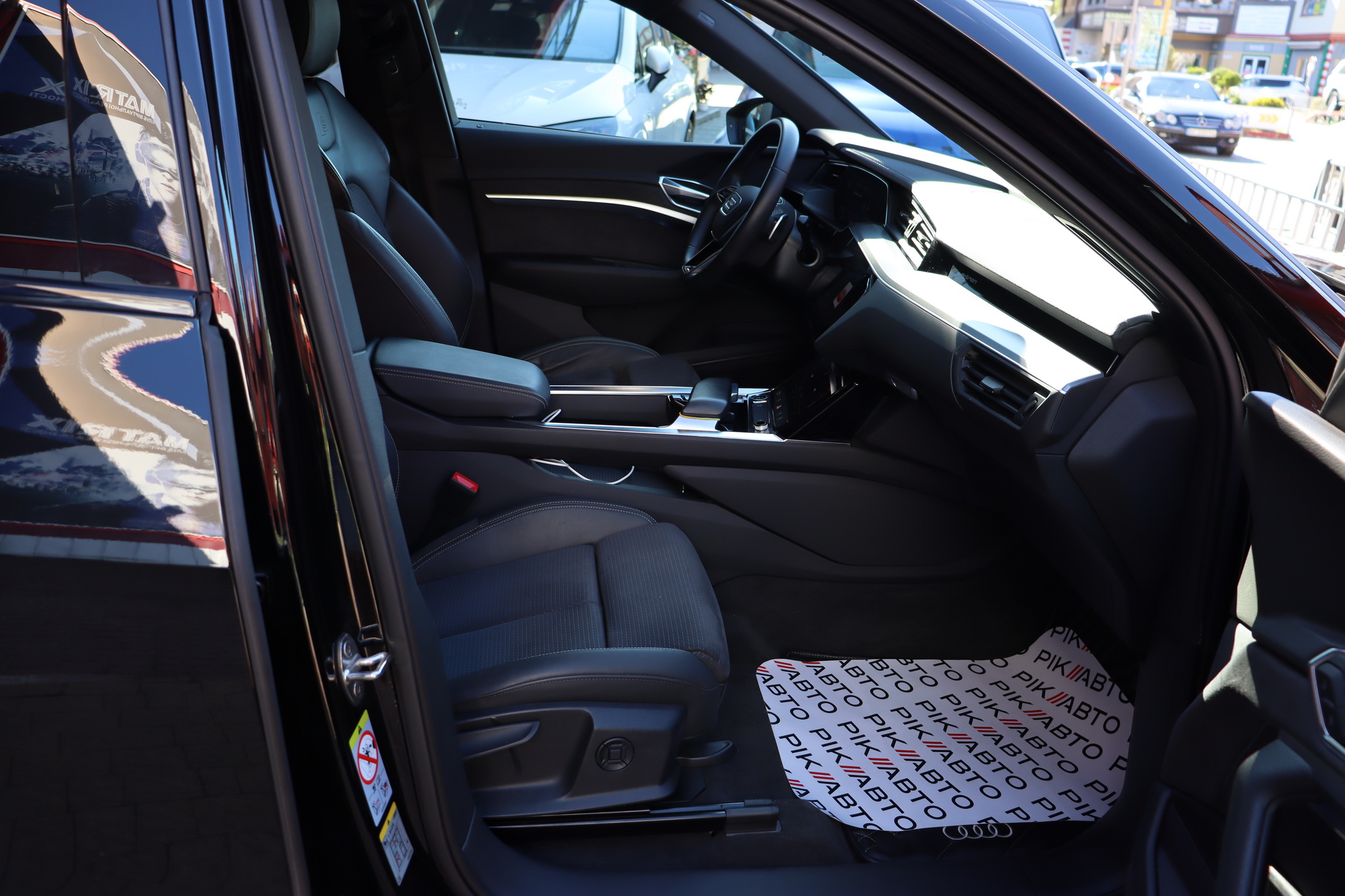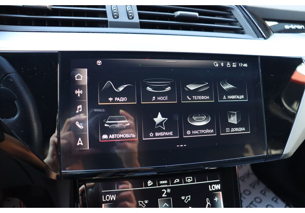 У салоні - вже відомі нам по інших моделях марки два дисплея системи MMI в центрі, а також 12.3-дюймова віртуальна панель приладів c можливістю кастомізації. Відмінною особливістю є оформлення центрального тунелю, а також «селектор КПП», який насправді реалізований як упор під руку, а перемикання режимів їзди здійснюється великим пальцем. Що стосується багажника, то його обсяг становить 600 л під полицею (+1700 л зі складеним в рівну підлогу заднім рядом), але ще один відсік доступний і спереду (frunk - тобто front trunk - має в своєму розпорядженні 60 літрами обсягу, там зручно зберігати кабелі для зарядки ).