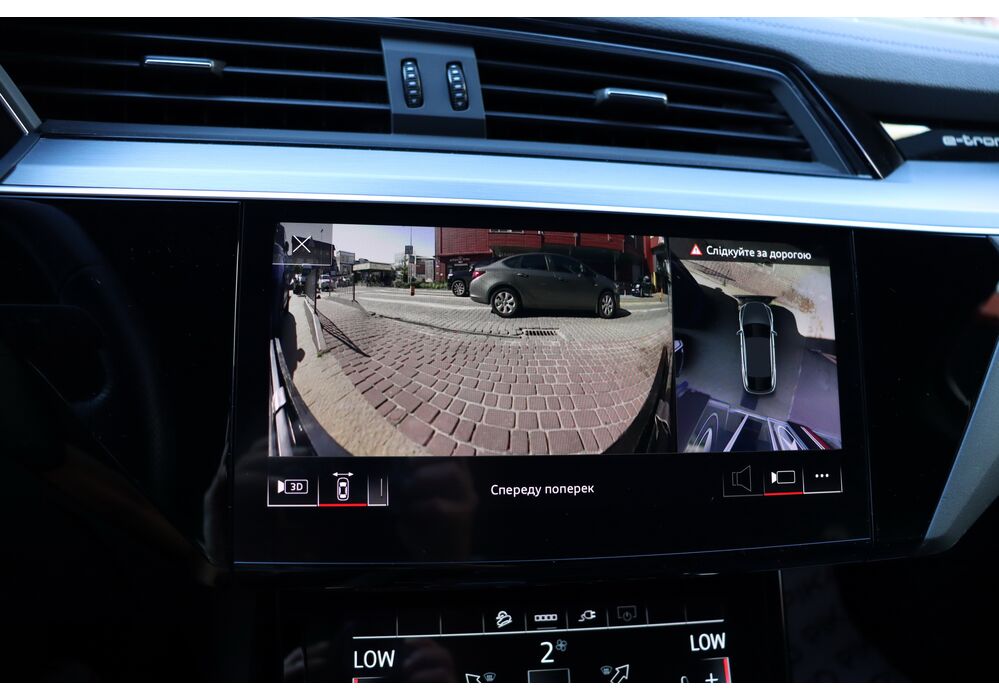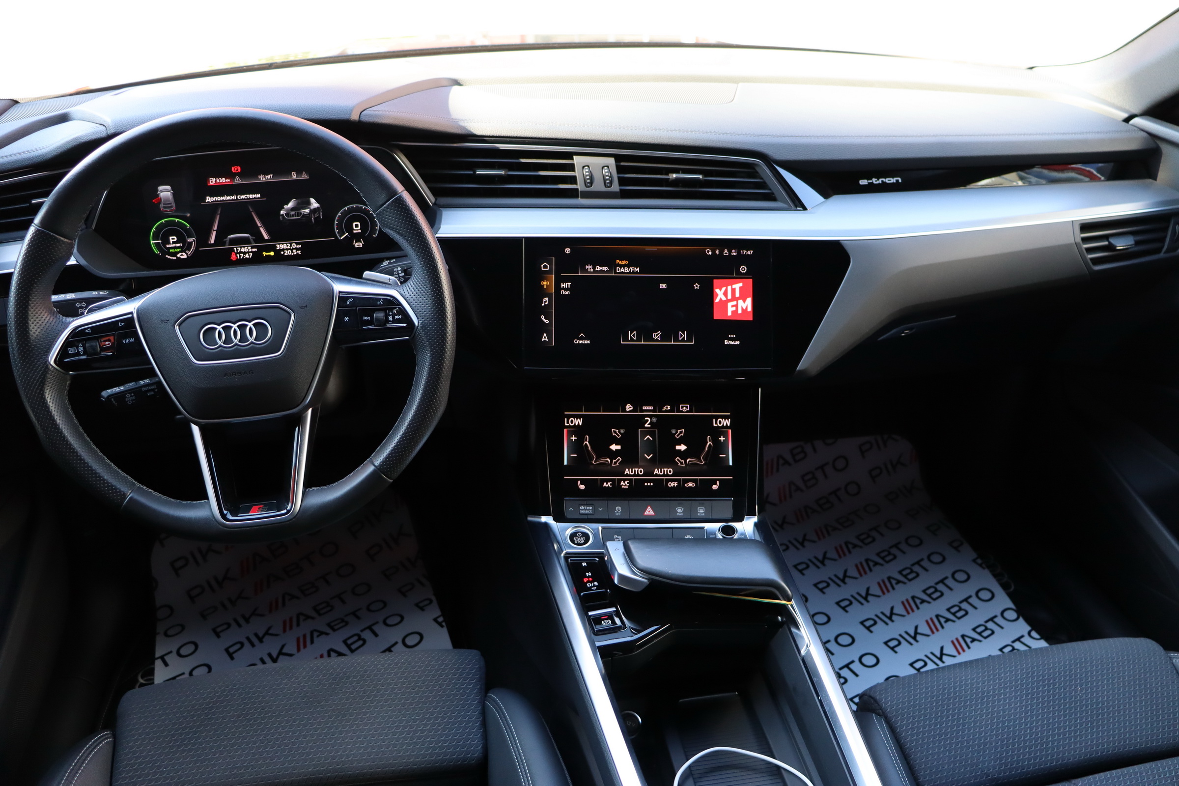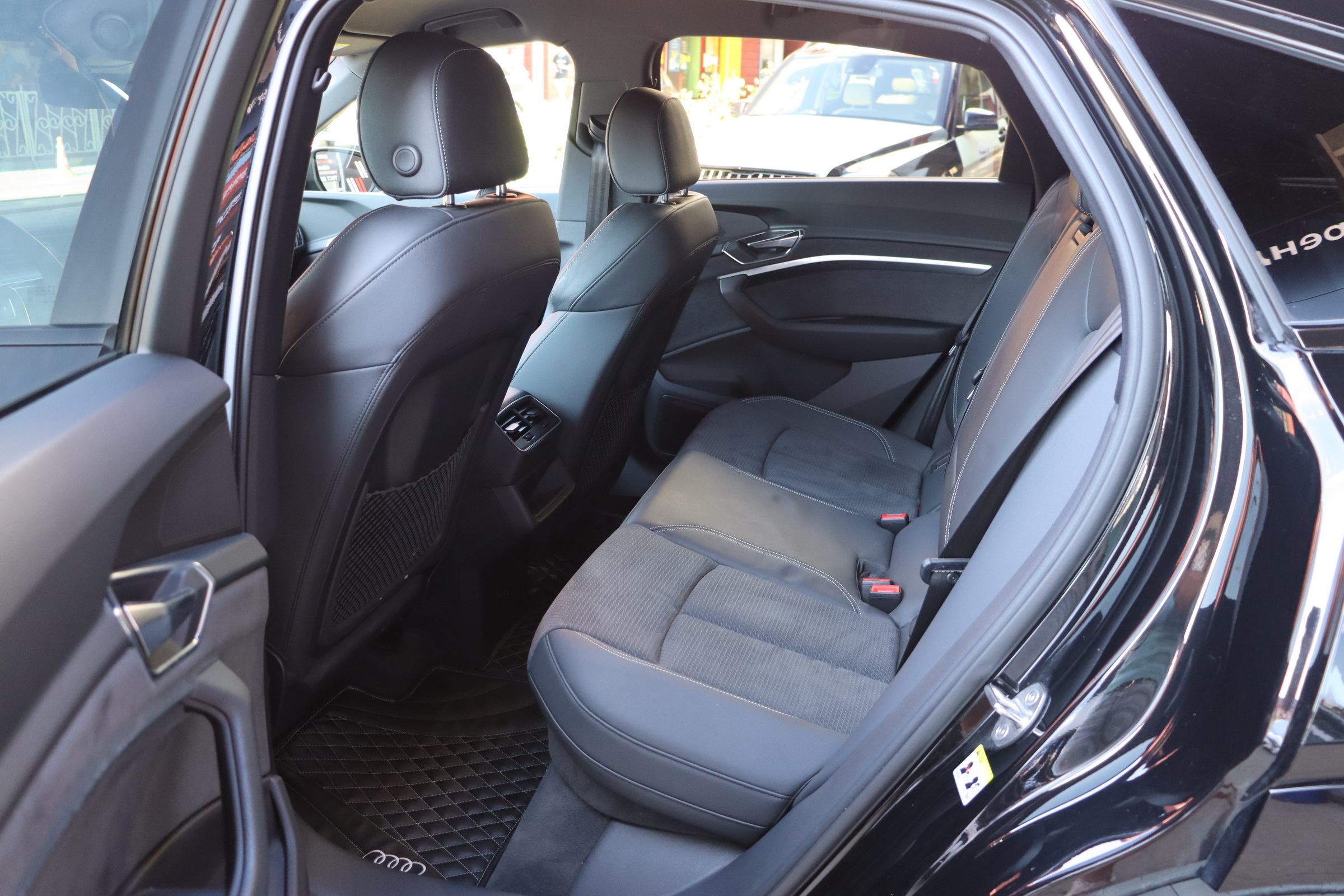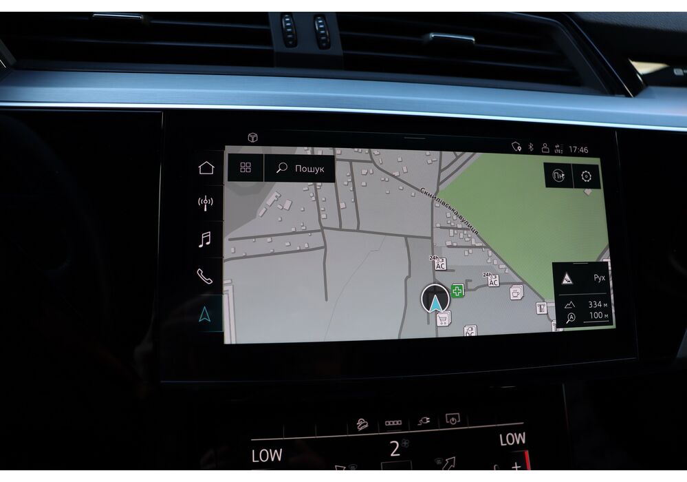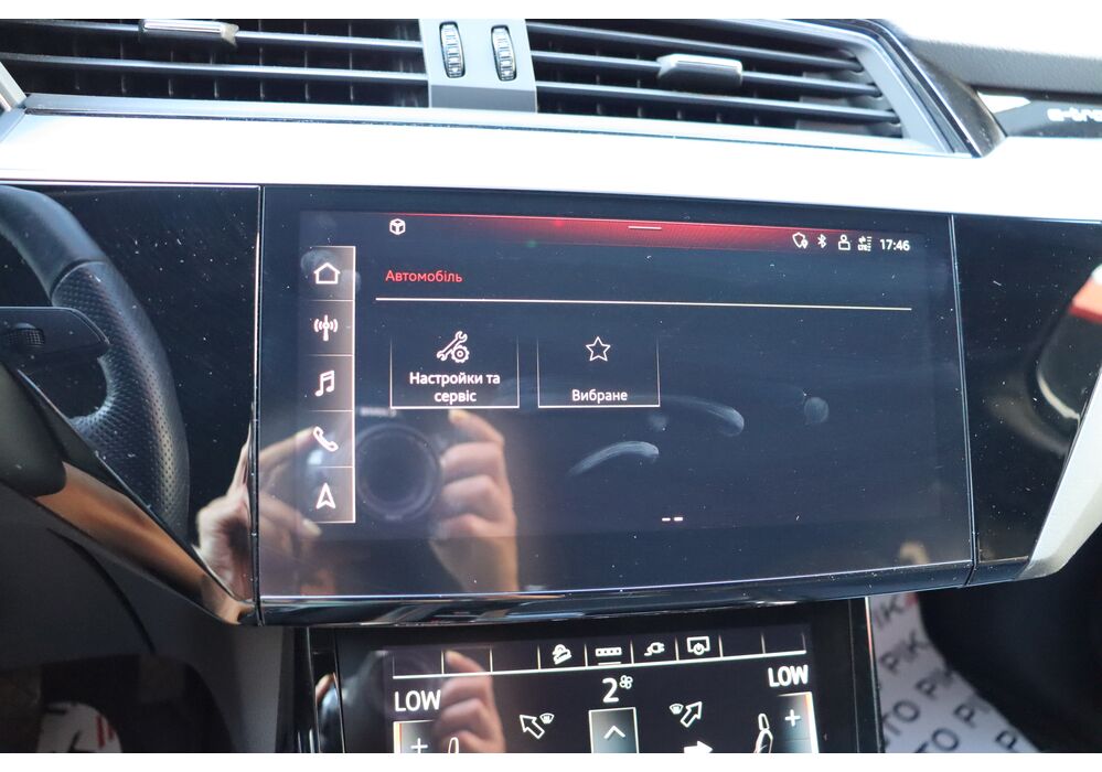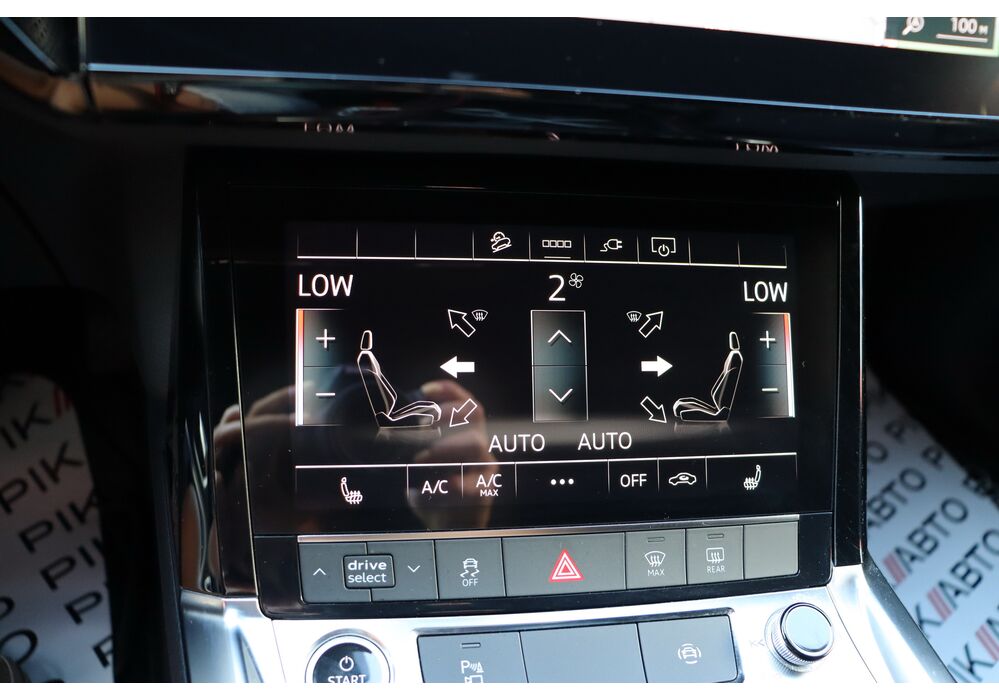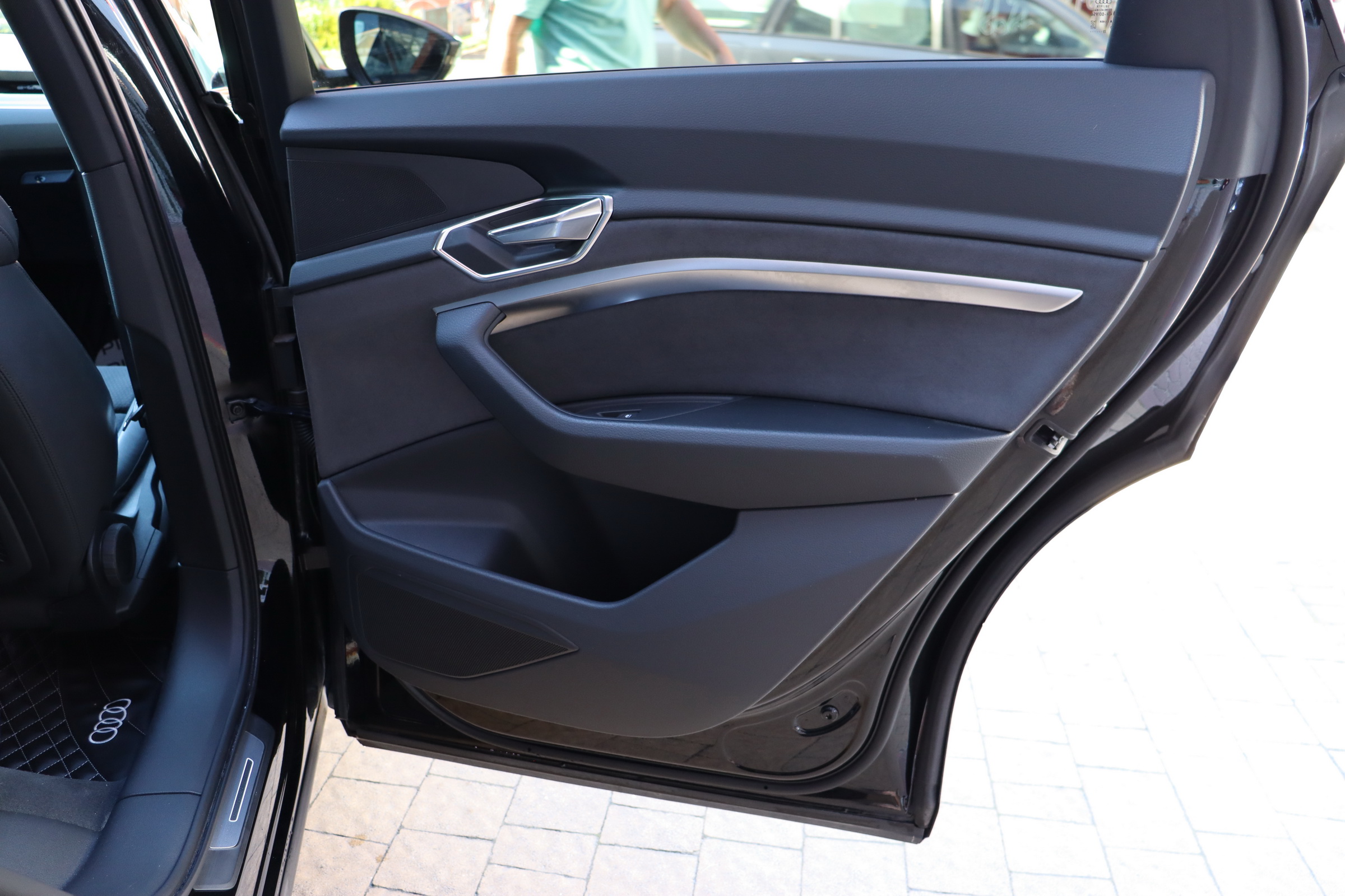 У салоні - вже відомі нам по інших моделях марки два дисплея системи MMI в центрі, а також 12.3-дюймова віртуальна панель приладів c можливістю кастомізації. Відмінною особливістю є оформлення центрального тунелю, а також «селектор КПП», який насправді реалізований як упор під руку, а перемикання режимів їзди здійснюється великим пальцем. Що стосується багажника, то його обсяг становить 600 л під полицею (+1700 л зі складеним в рівну підлогу заднім рядом), але ще один відсік доступний і спереду (frunk - тобто front trunk - має в своєму розпорядженні 60 літрами обсягу, там зручно зберігати кабелі для зарядки ).