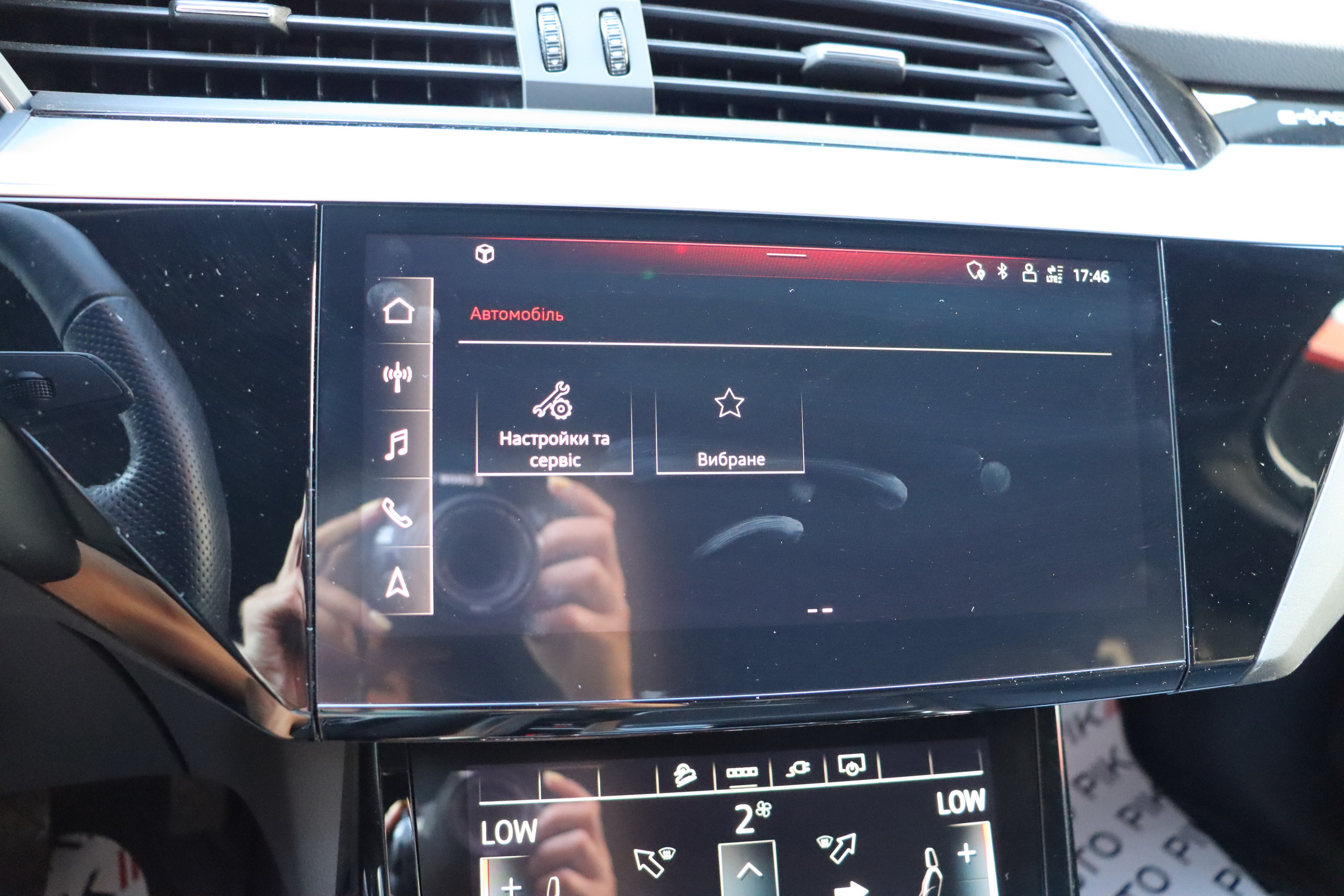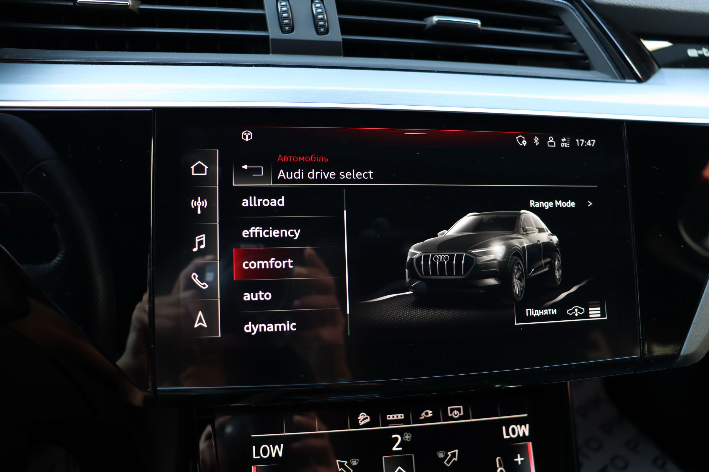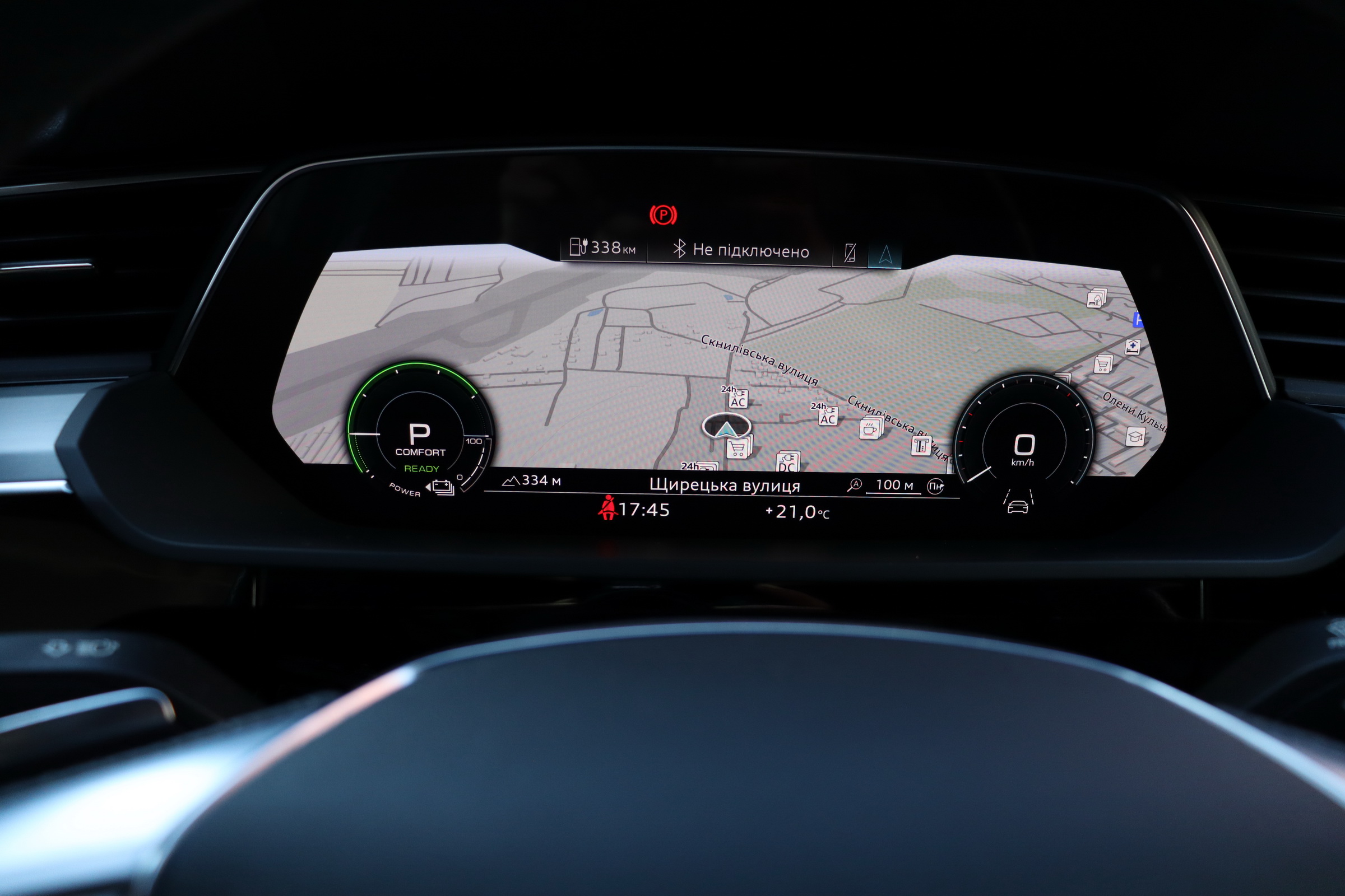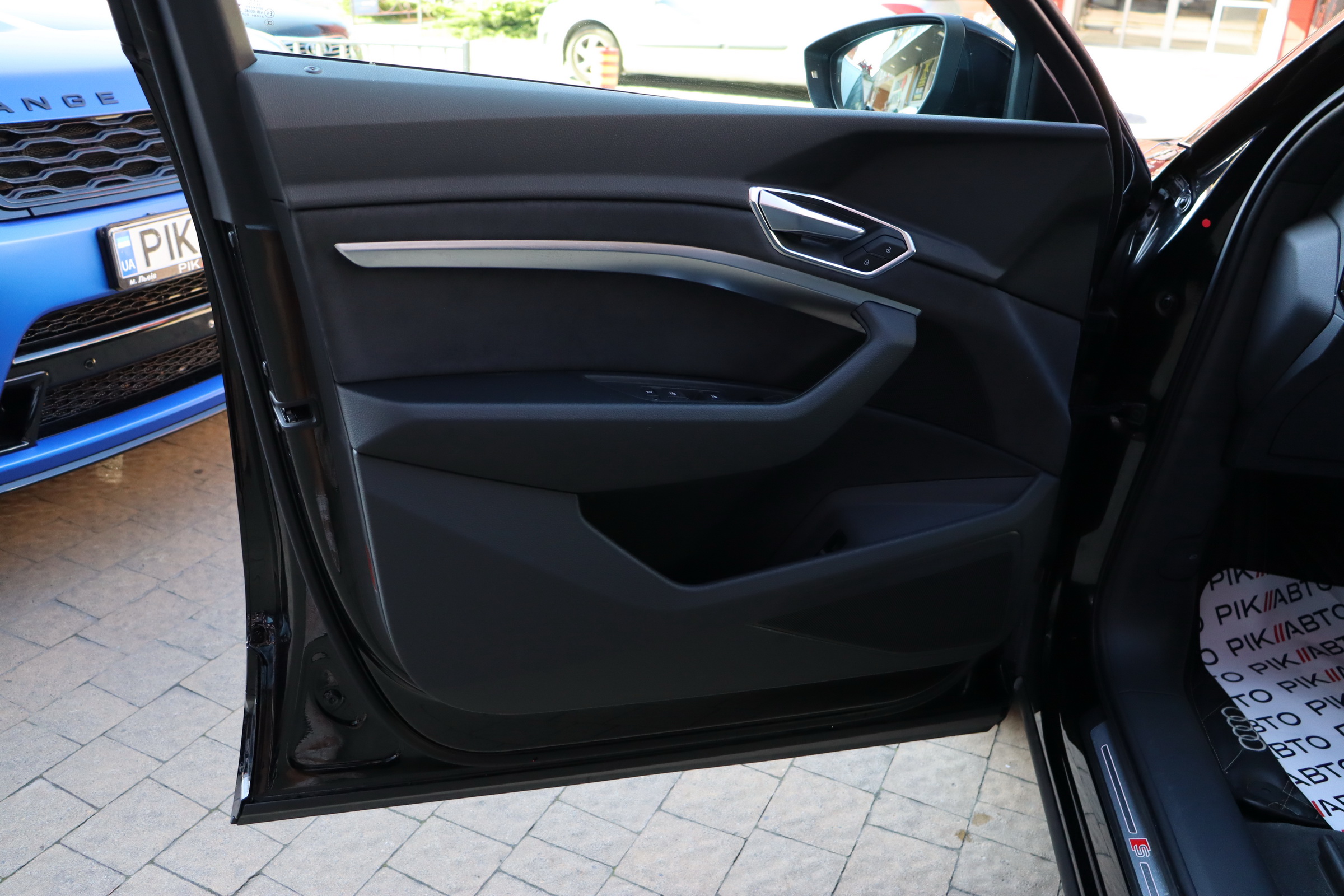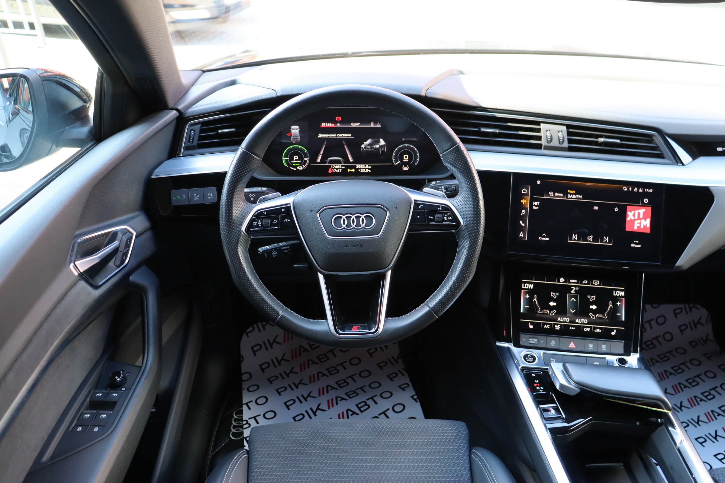 У салоні - вже відомі нам по інших моделях марки два дисплея системи MMI в центрі, а також 12.3-дюймова віртуальна панель приладів c можливістю кастомізації. Відмінною особливістю є оформлення центрального тунелю, а також «селектор КПП», який насправді реалізований як упор під руку, а перемикання режимів їзди здійснюється великим пальцем. Що стосується багажника, то його обсяг становить 600 л під полицею (+1700 л зі складеним в рівну підлогу заднім рядом), але ще один відсік доступний і спереду (frunk - тобто front trunk - має в своєму розпорядженні 60 літрами обсягу, там зручно зберігати кабелі для зарядки ).