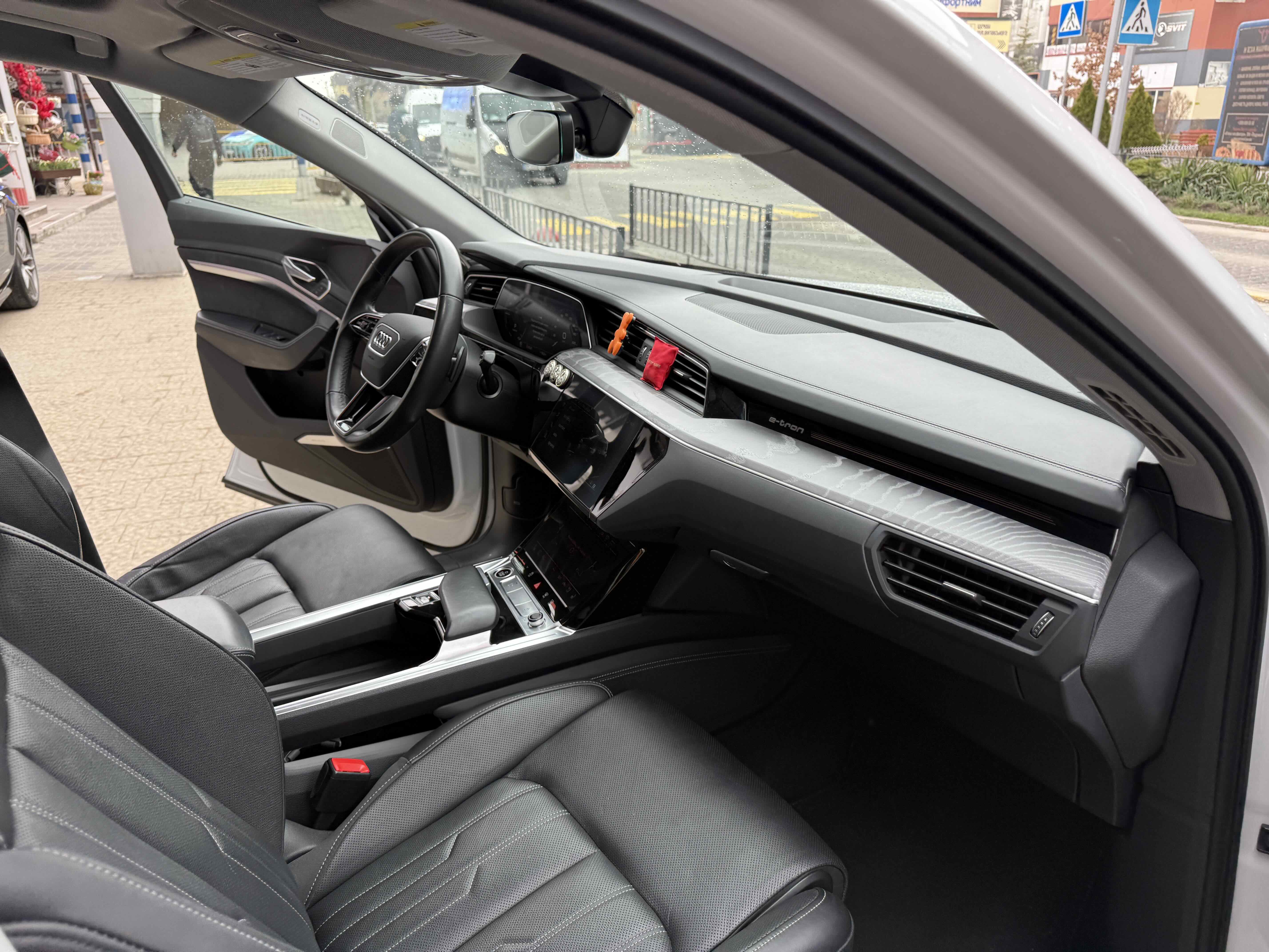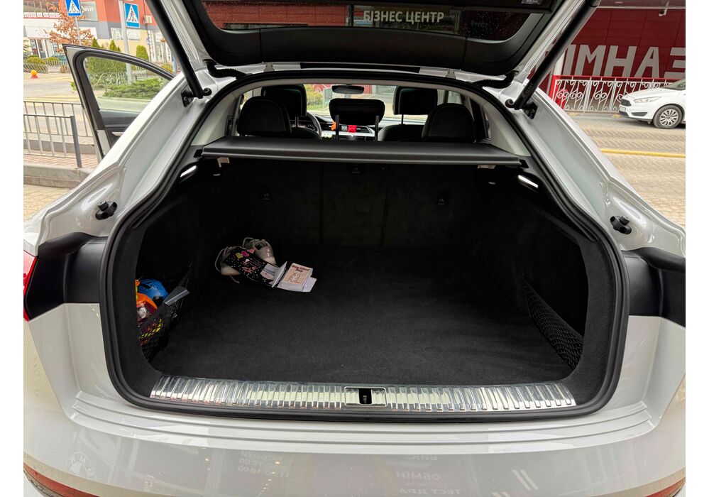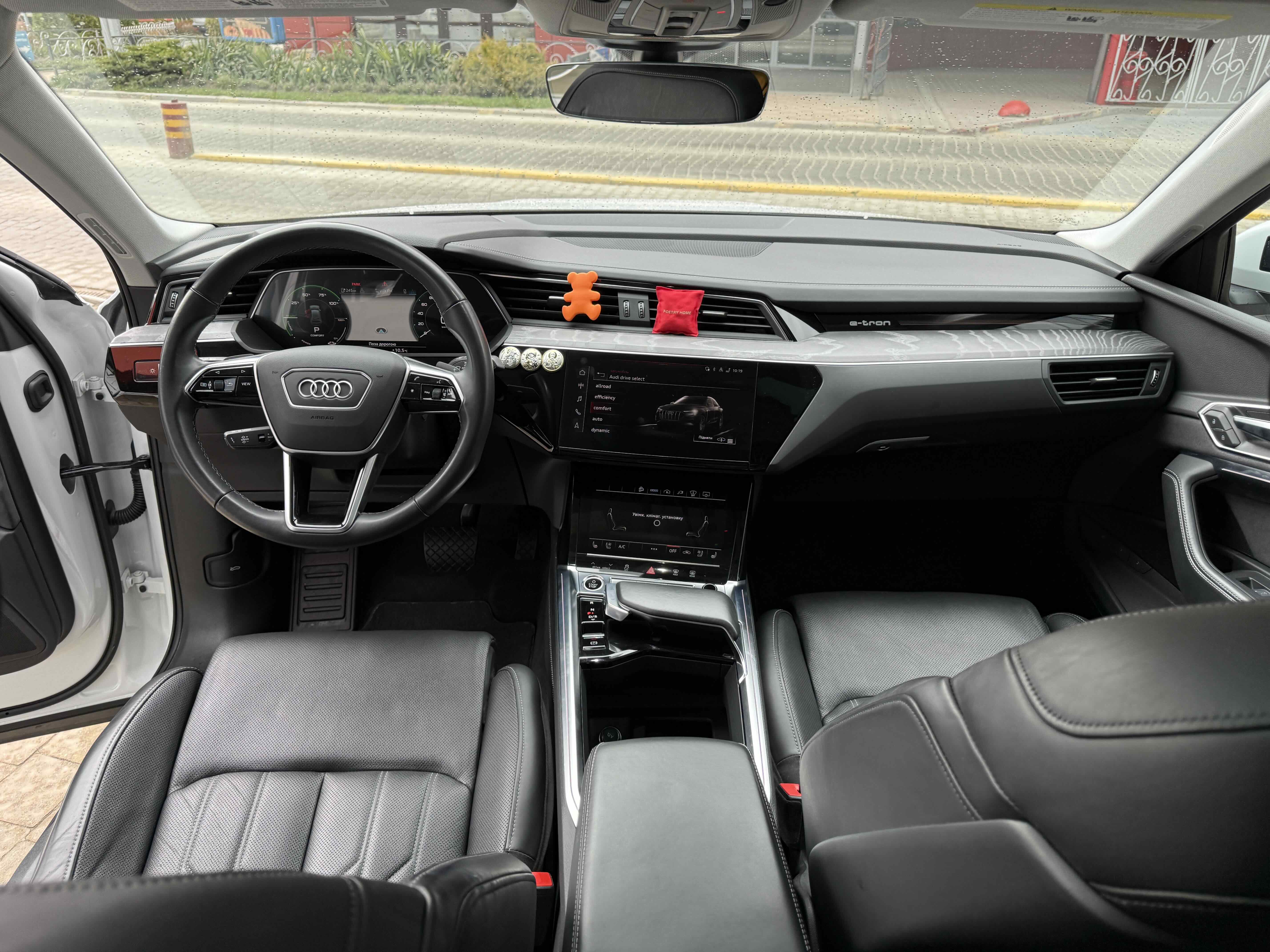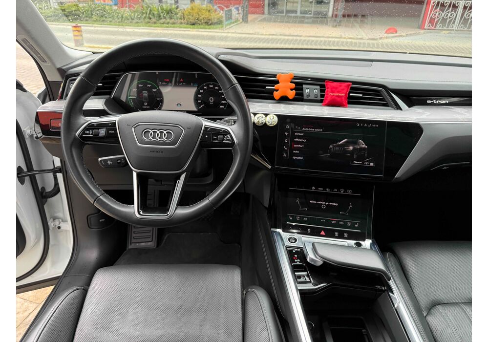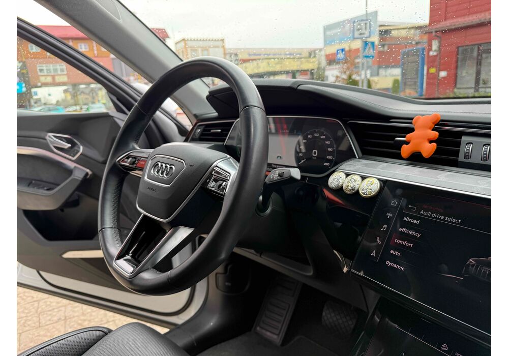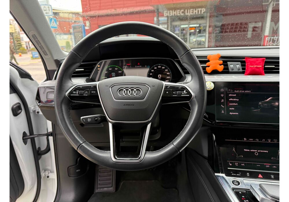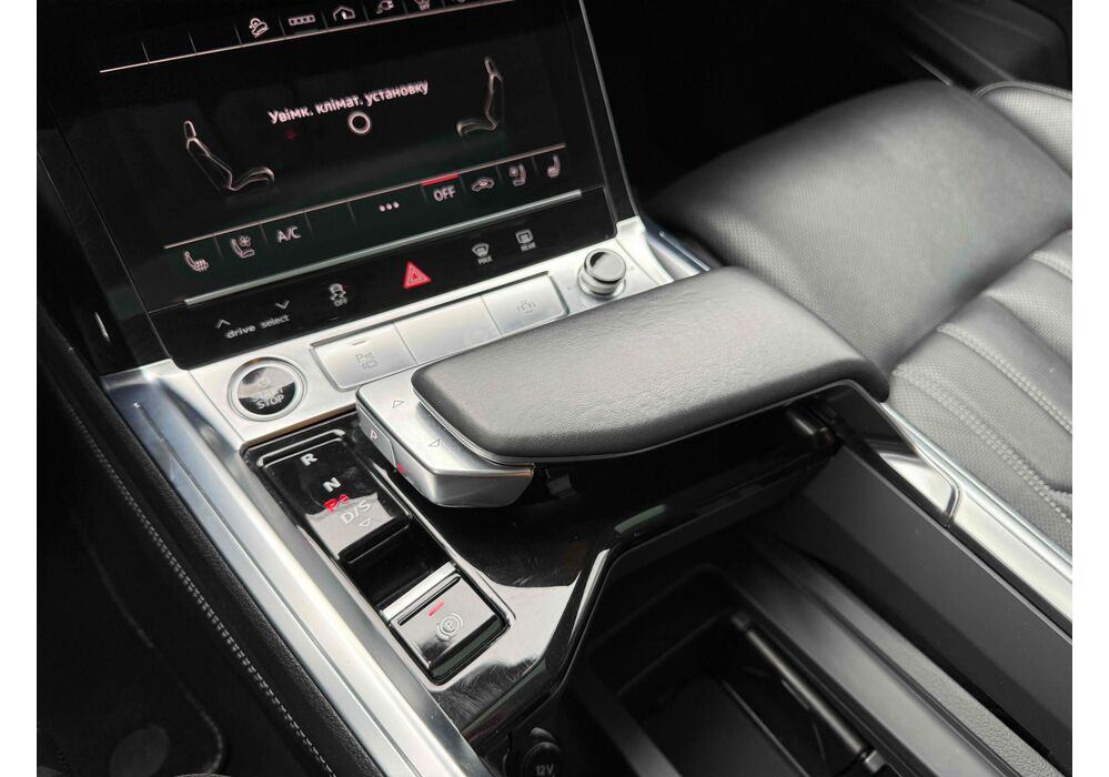 У салоні - вже відомі нам по інших моделях марки два дисплея системи MMI в центрі, а також 12.3-дюймова віртуальна панель приладів c можливістю кастомізації. Відмінною особливістю є оформлення центрального тунелю, а також «селектор КПП», який насправді реалізований як упор під руку, а перемикання режимів їзди здійснюється великим пальцем. Що стосується багажника, то його обсяг становить 600 л під полицею (+1700 л зі складеним в рівну підлогу заднім рядом), але ще один відсік доступний і спереду (frunk - тобто front trunk - має в своєму розпорядженні 60 літрами обсягу, там зручно зберігати кабелі для зарядки ).
