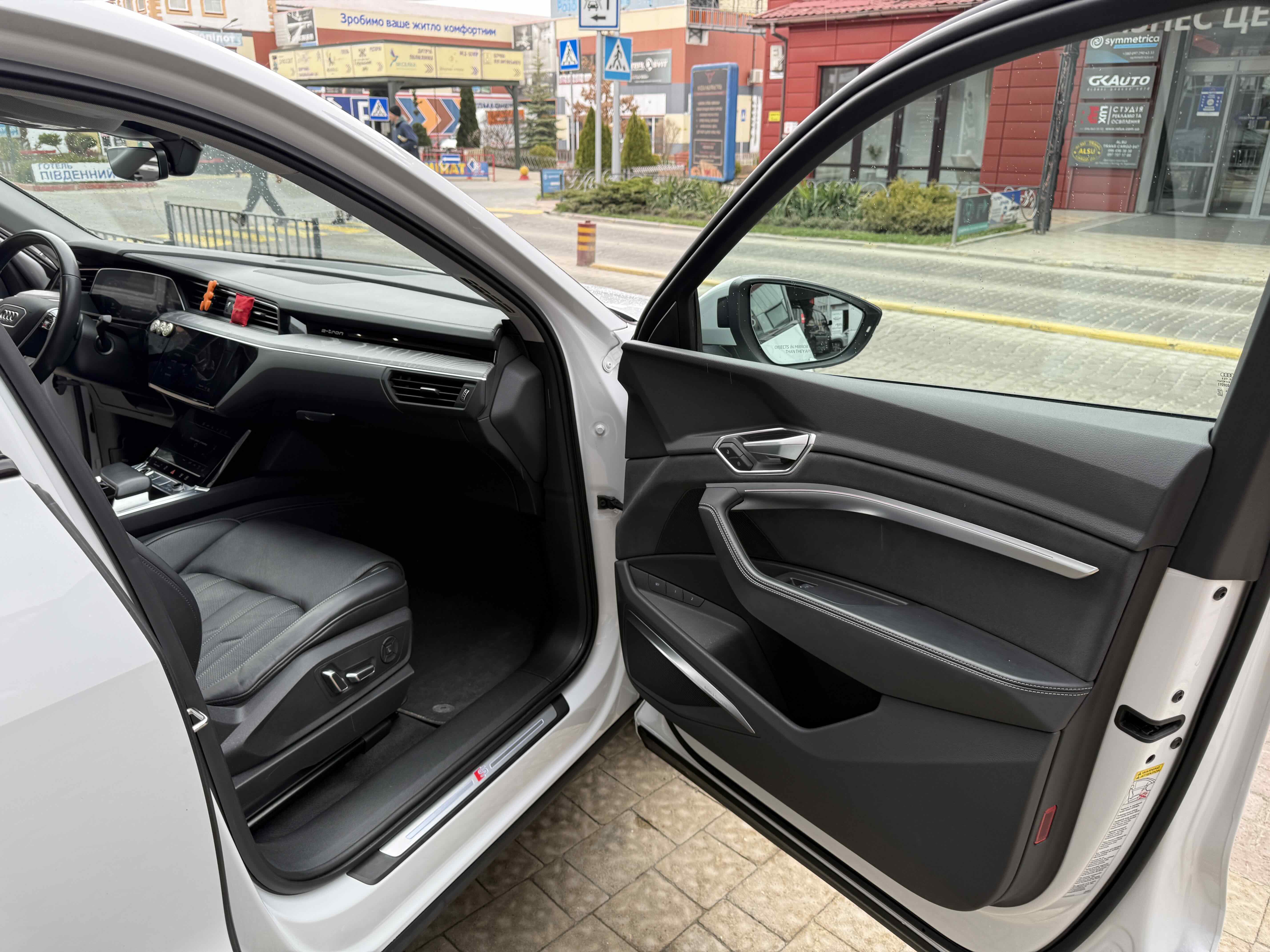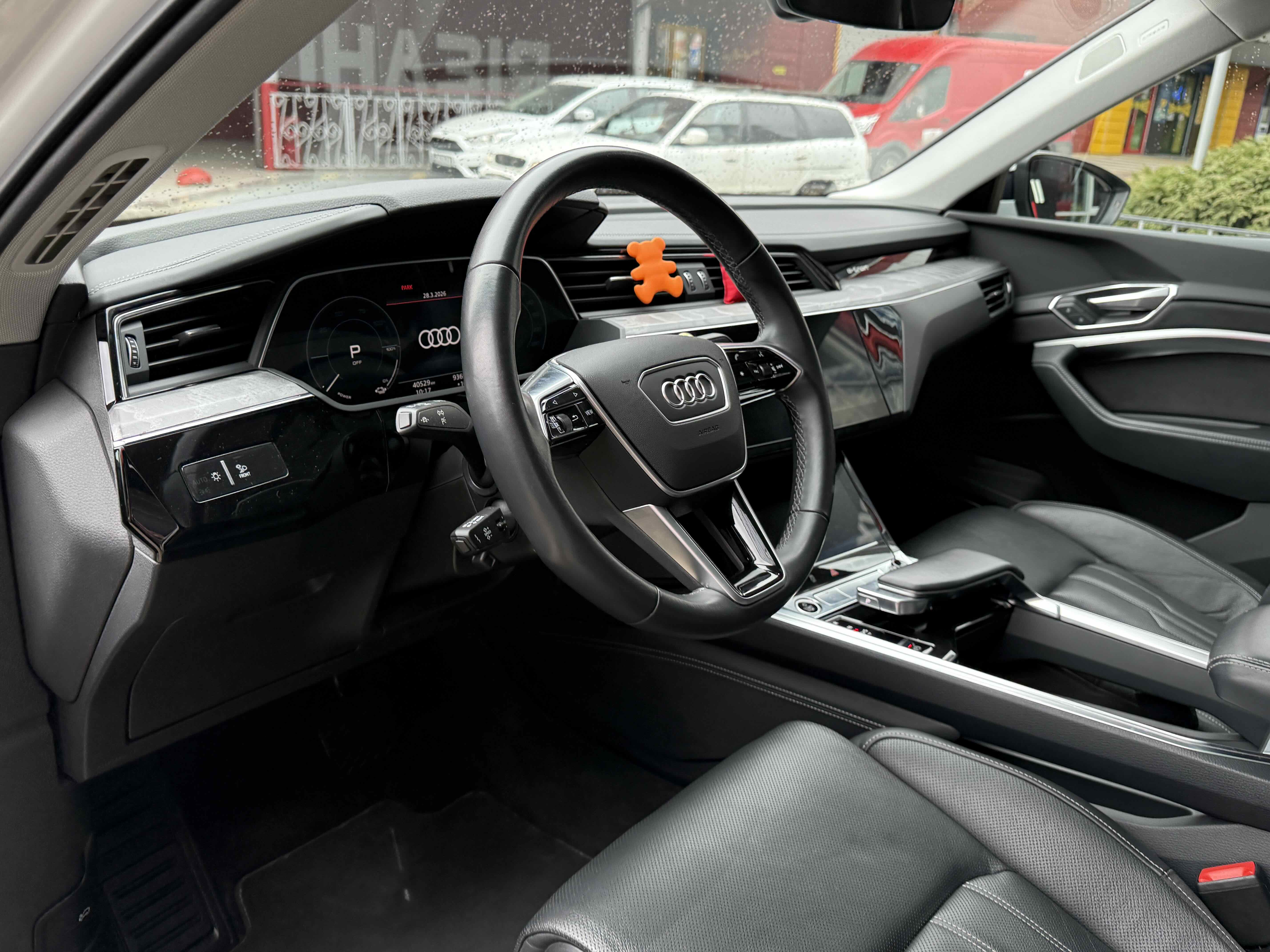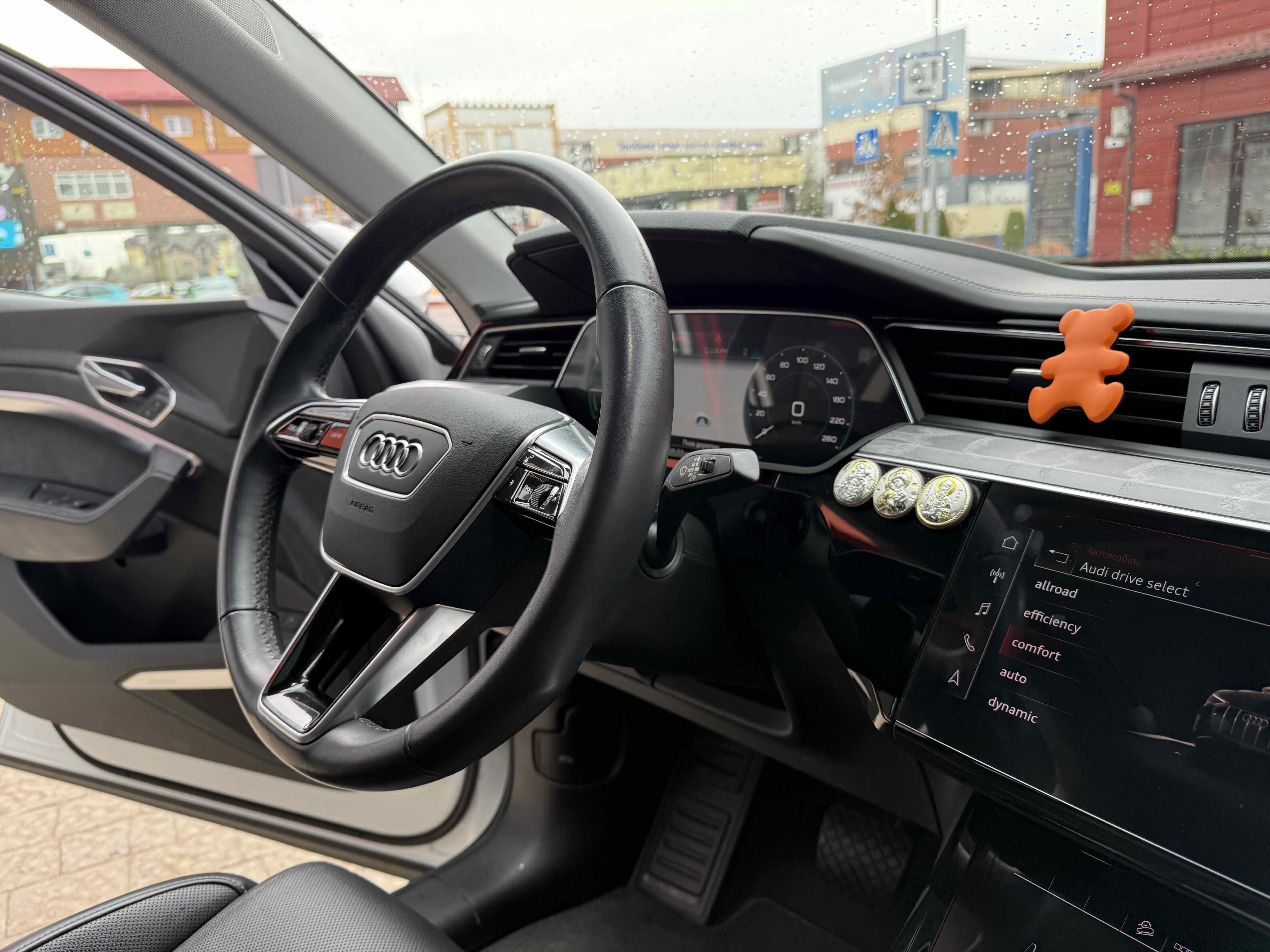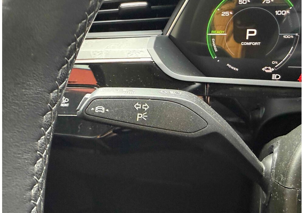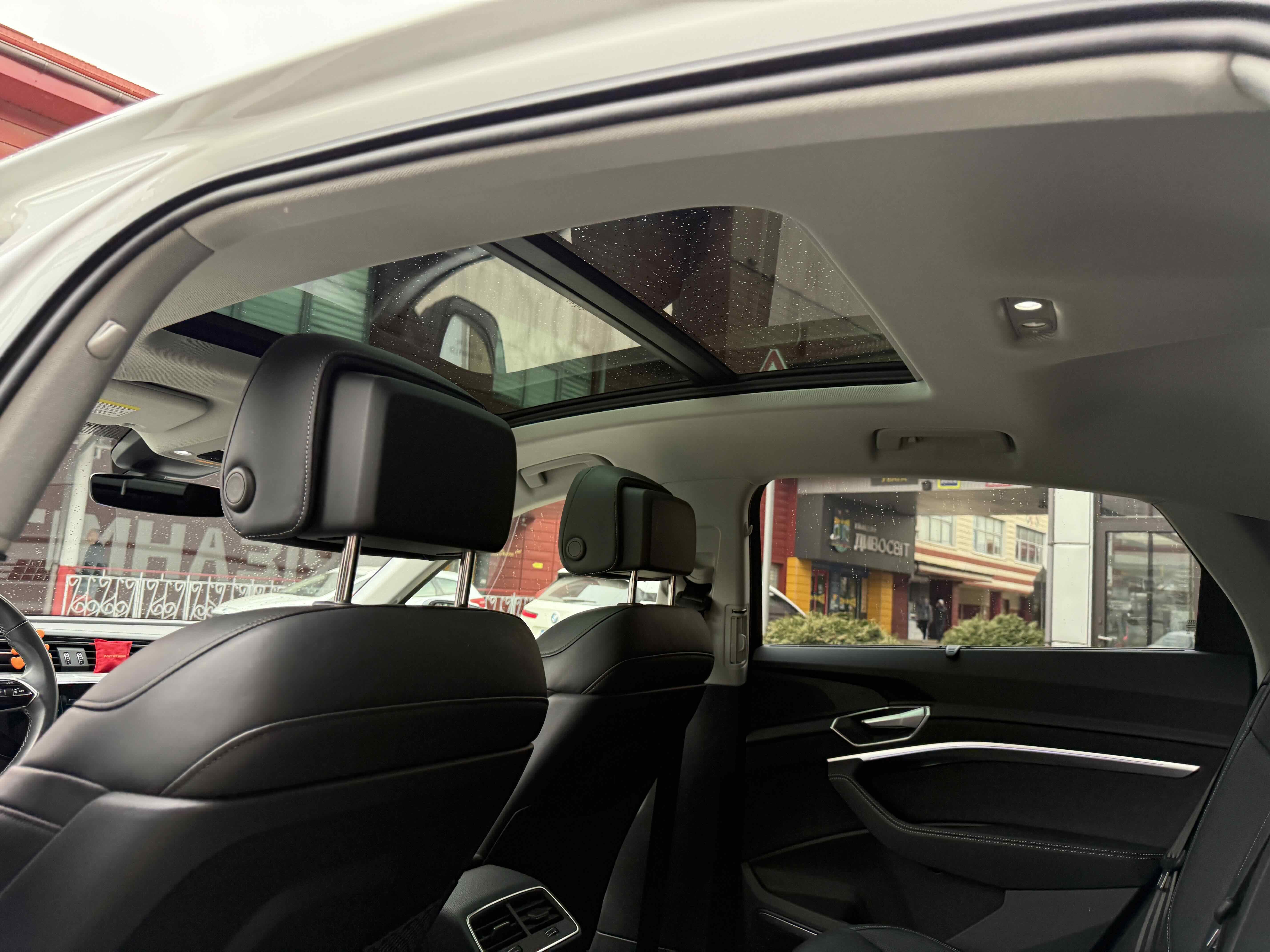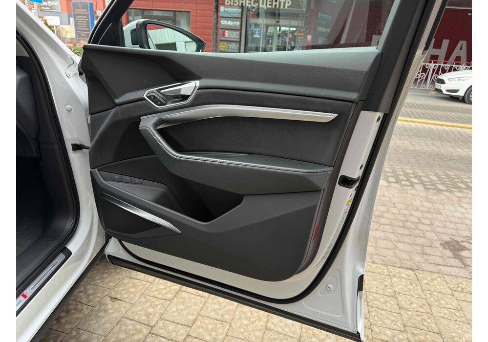 У салоні - вже відомі нам по інших моделях марки два дисплея системи MMI в центрі, а також 12.3-дюймова віртуальна панель приладів c можливістю кастомізації. Відмінною особливістю є оформлення центрального тунелю, а також «селектор КПП», який насправді реалізований як упор під руку, а перемикання режимів їзди здійснюється великим пальцем. Що стосується багажника, то його обсяг становить 600 л під полицею (+1700 л зі складеним в рівну підлогу заднім рядом), але ще один відсік доступний і спереду (frunk - тобто front trunk - має в своєму розпорядженні 60 літрами обсягу, там зручно зберігати кабелі для зарядки ).