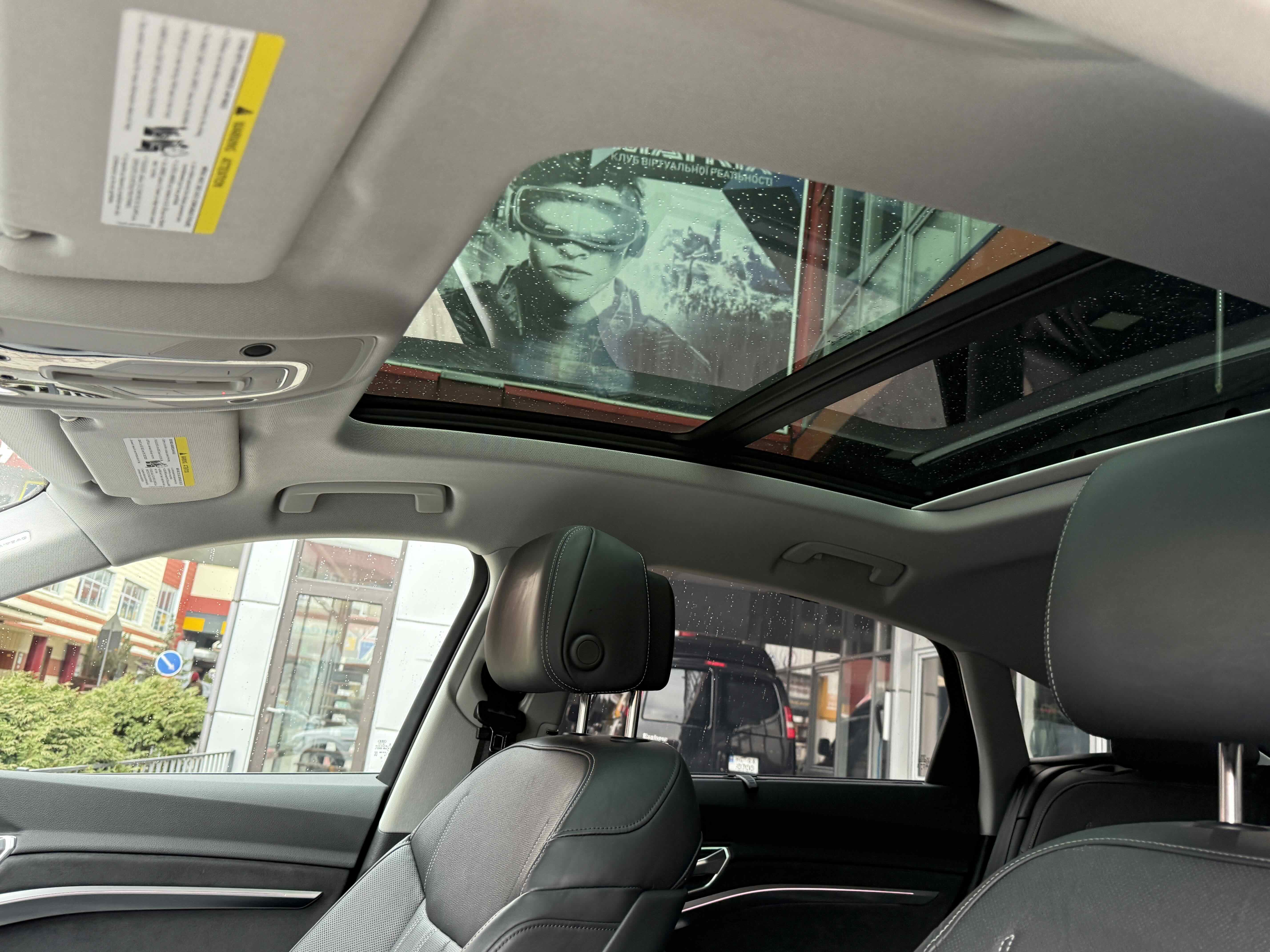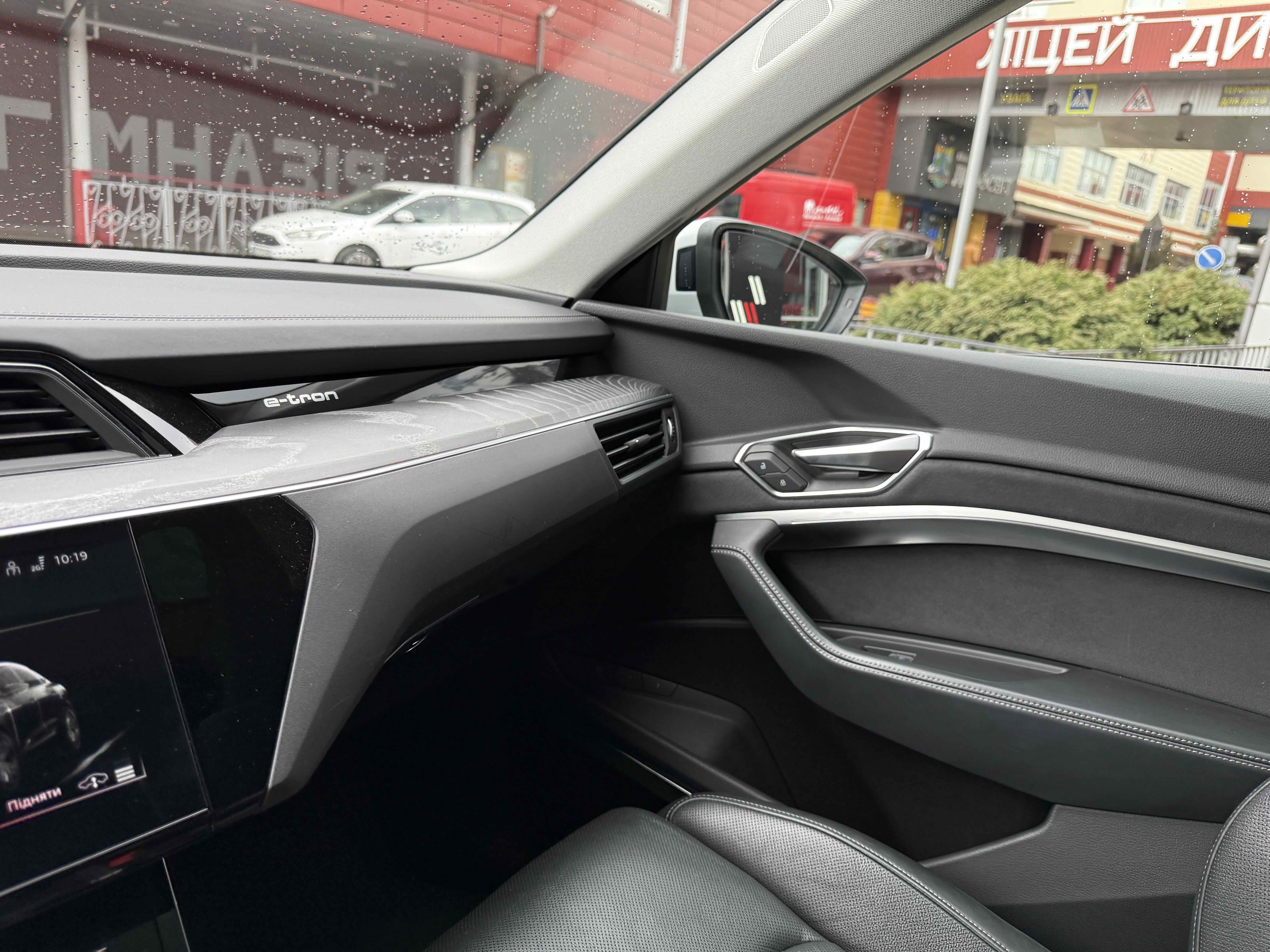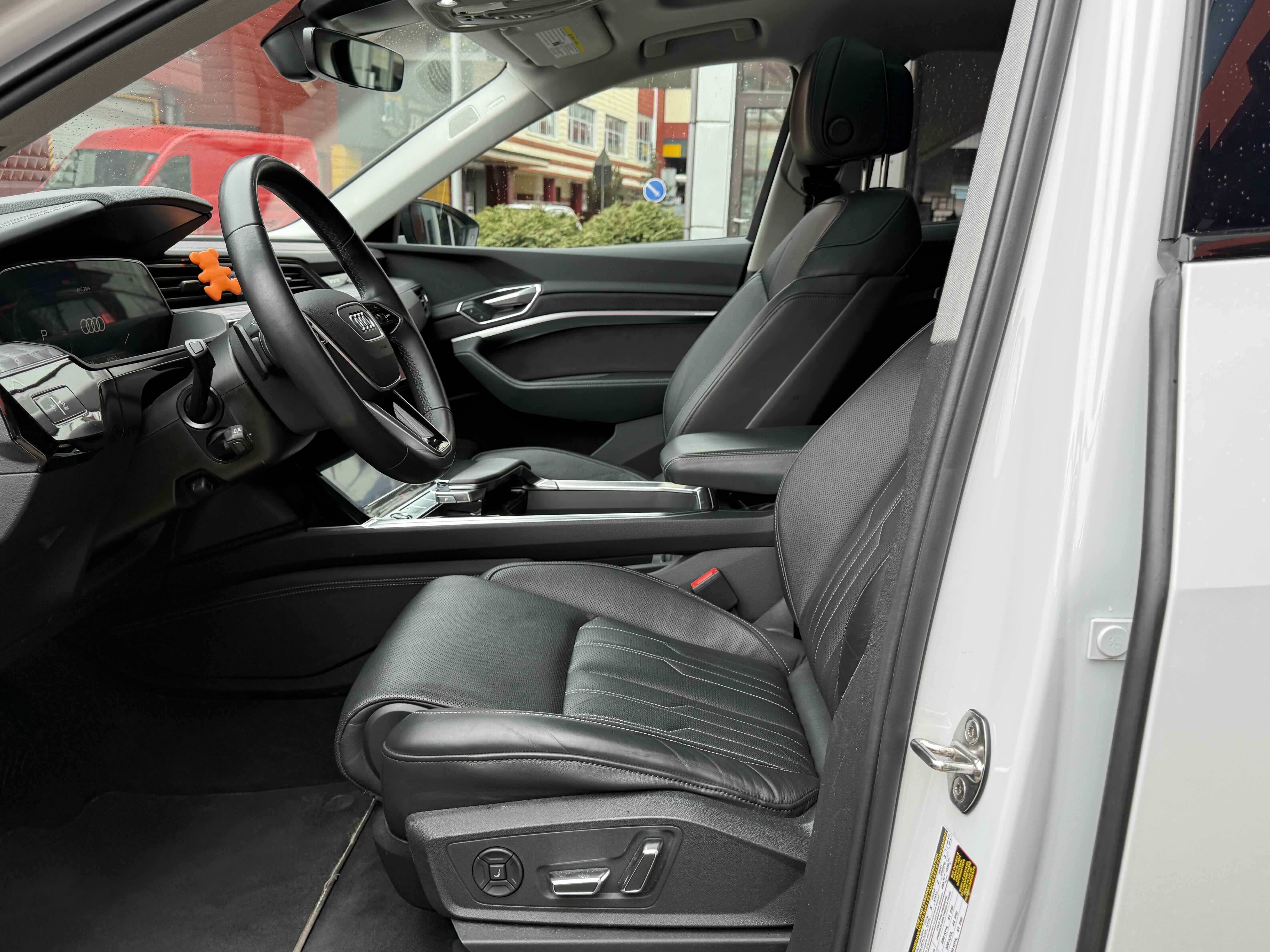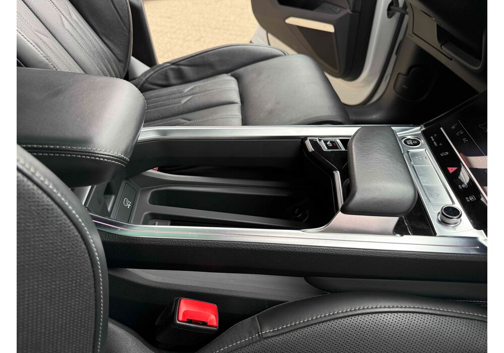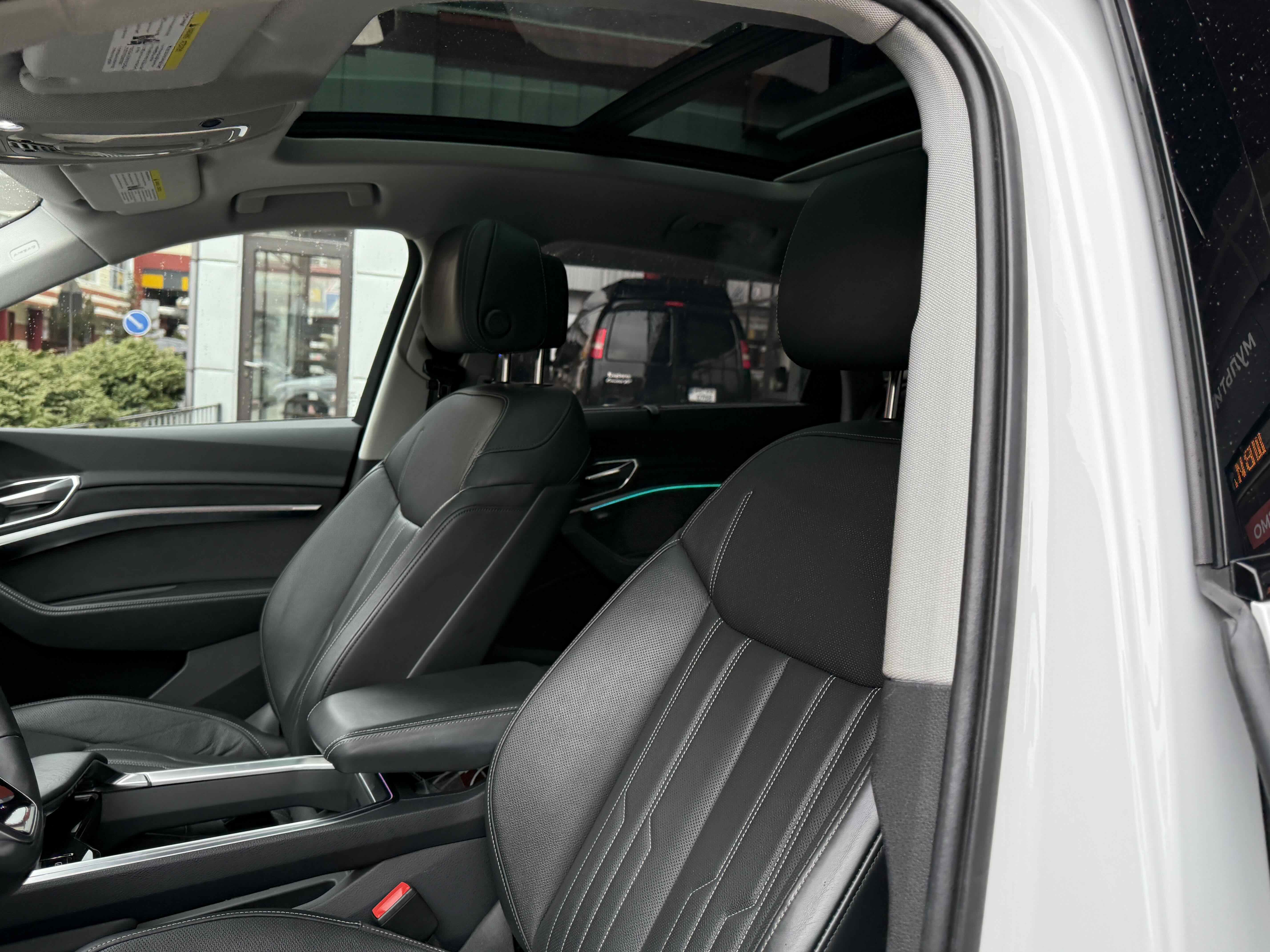 У салоні - вже відомі нам по інших моделях марки два дисплея системи MMI в центрі, а також 12.3-дюймова віртуальна панель приладів c можливістю кастомізації. Відмінною особливістю є оформлення центрального тунелю, а також «селектор КПП», який насправді реалізований як упор під руку, а перемикання режимів їзди здійснюється великим пальцем. Що стосується багажника, то його обсяг становить 600 л під полицею (+1700 л зі складеним в рівну підлогу заднім рядом), але ще один відсік доступний і спереду (frunk - тобто front trunk - має в своєму розпорядженні 60 літрами обсягу, там зручно зберігати кабелі для зарядки ).