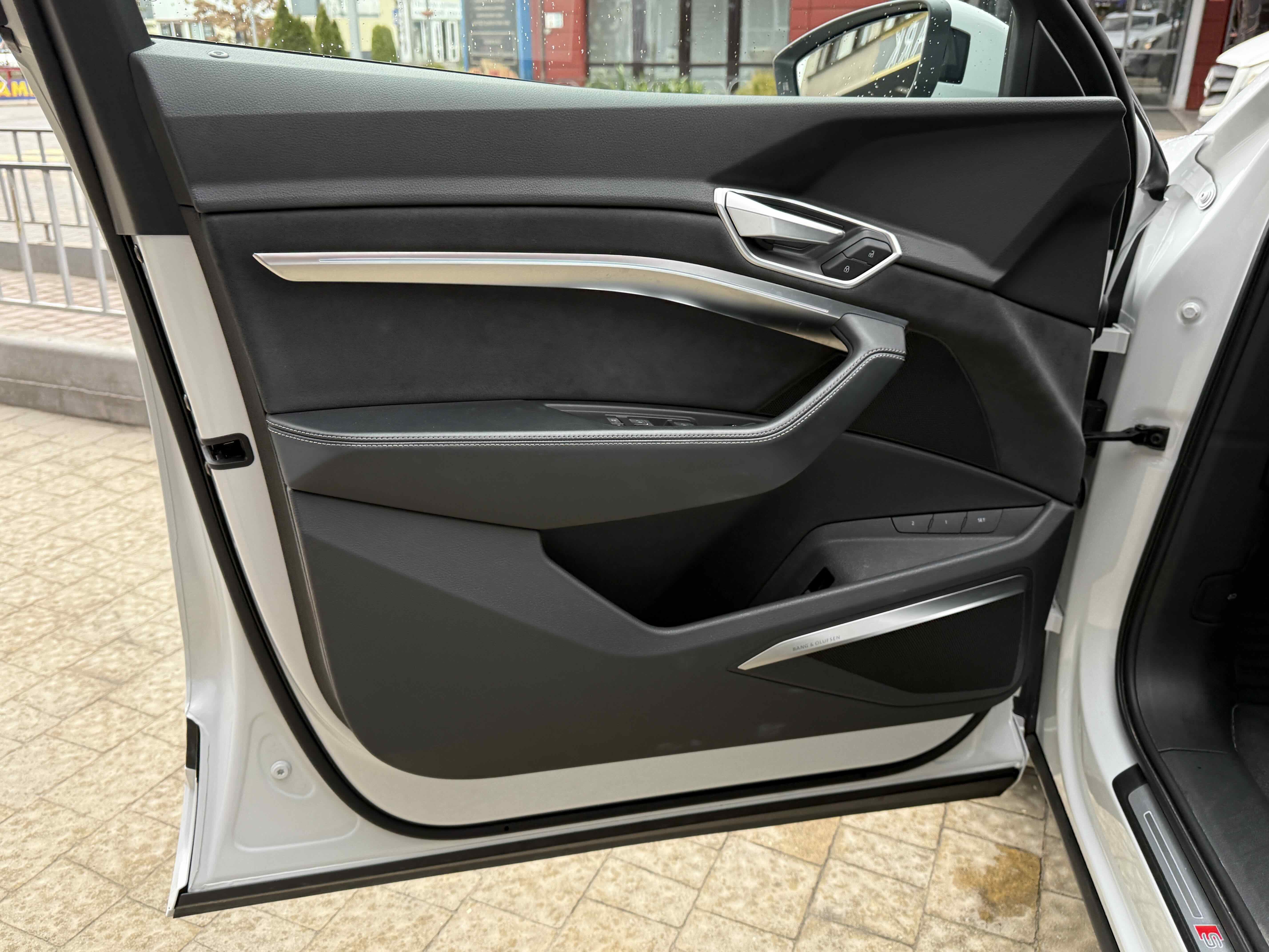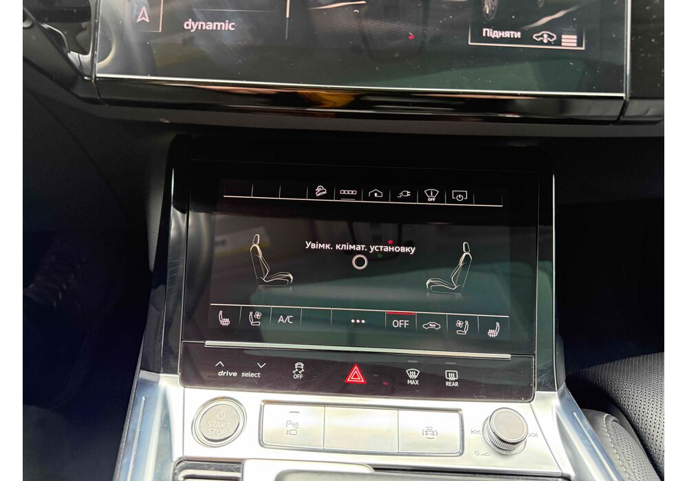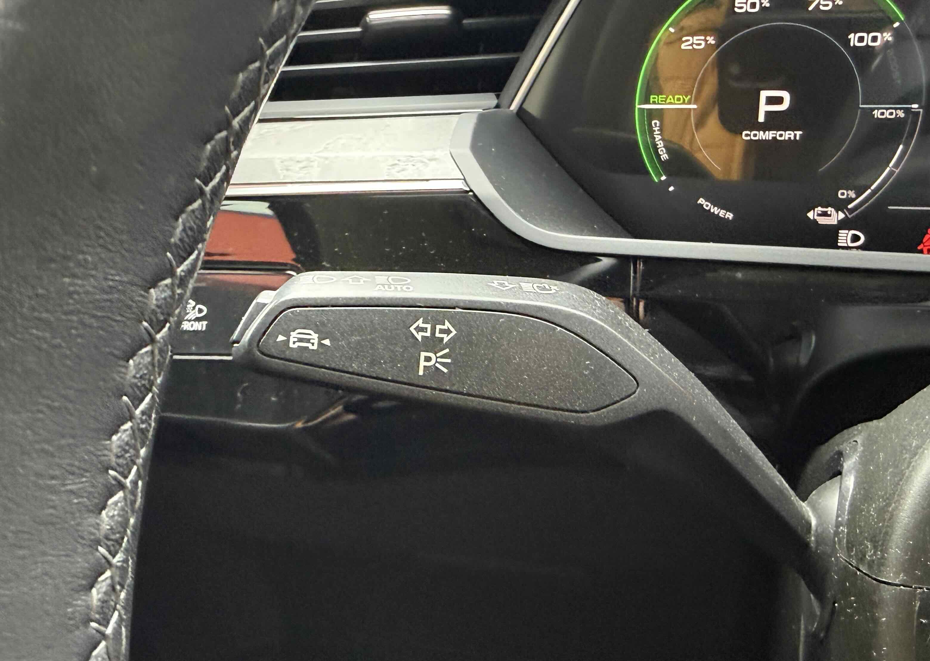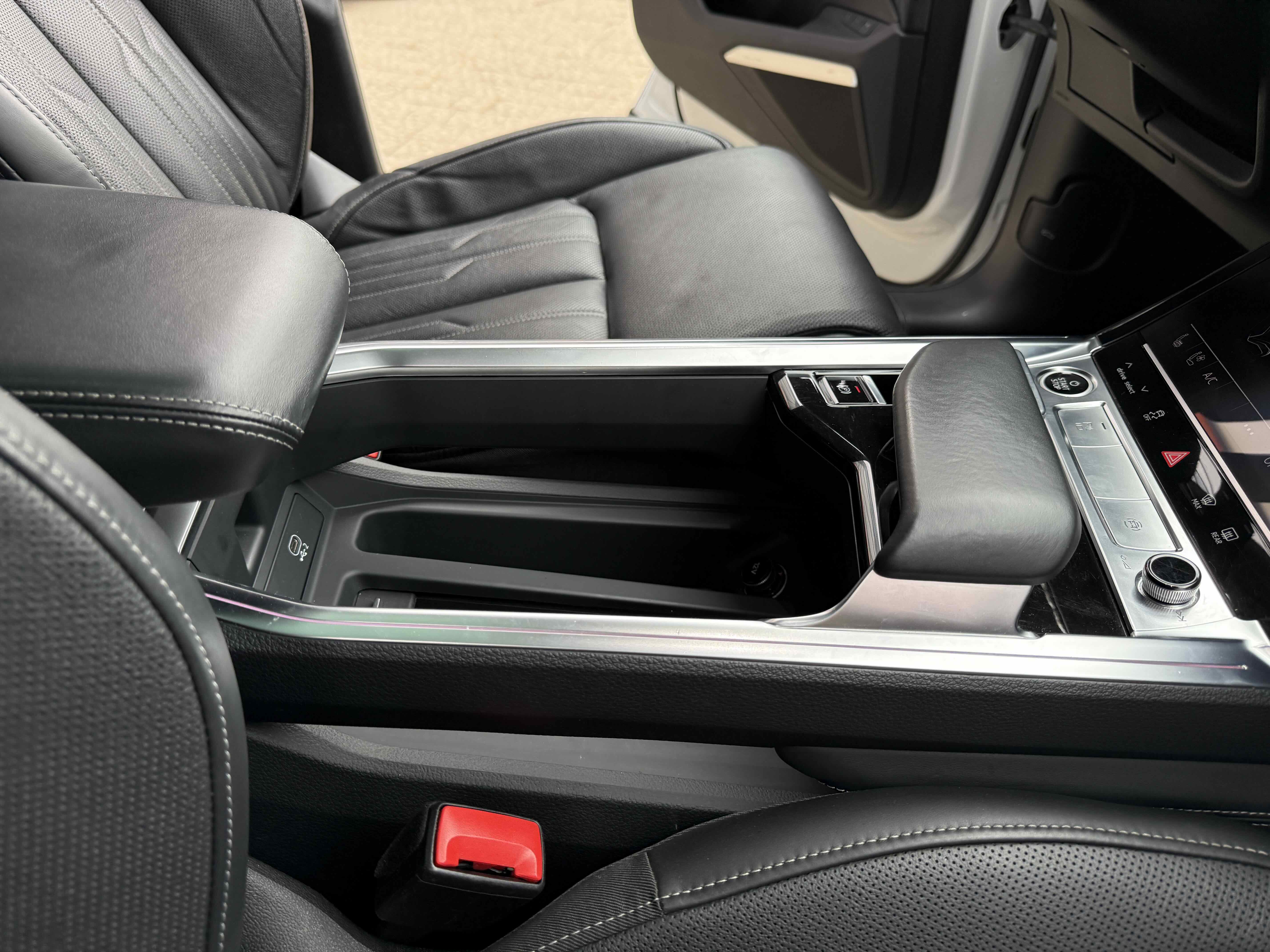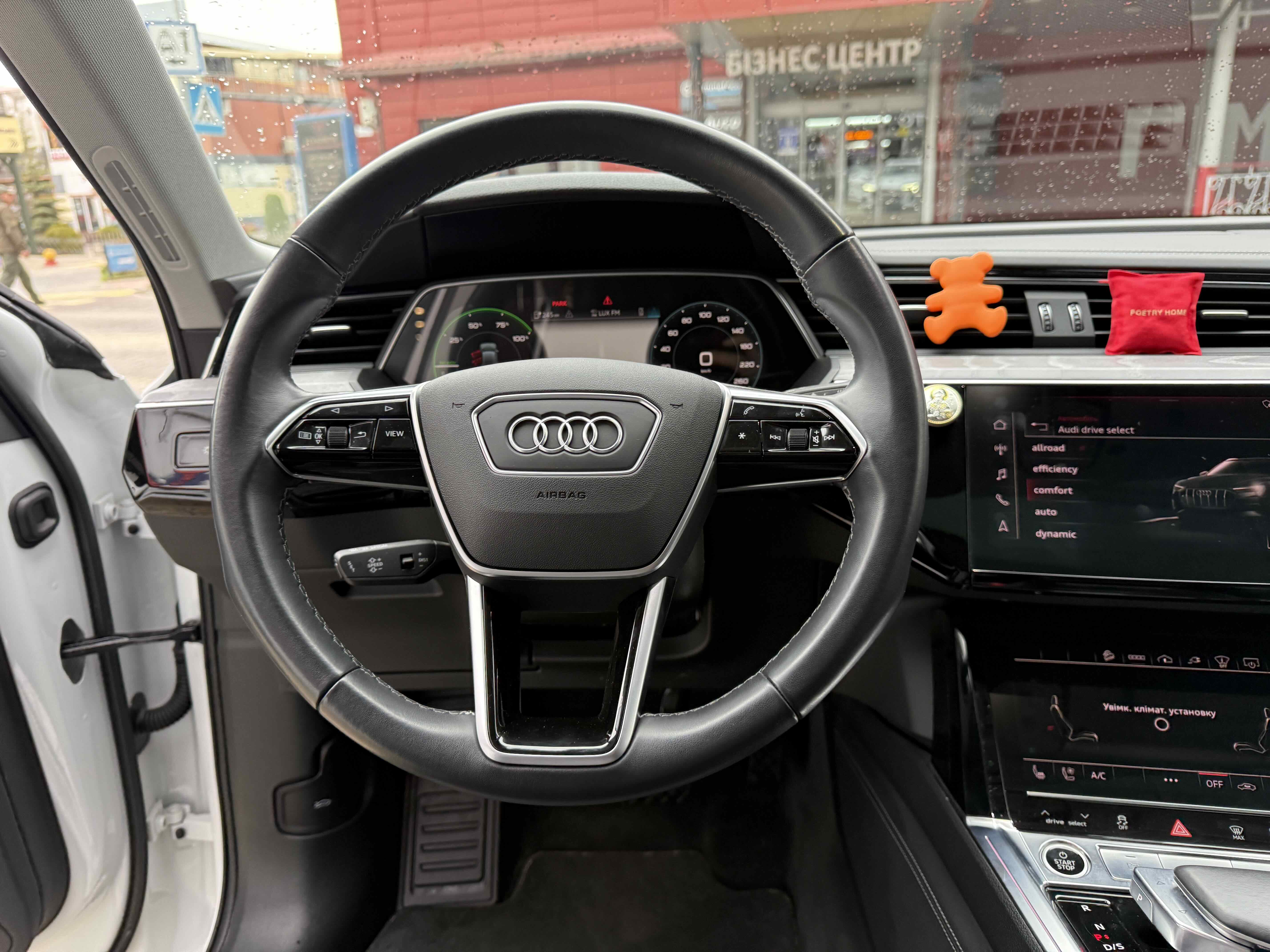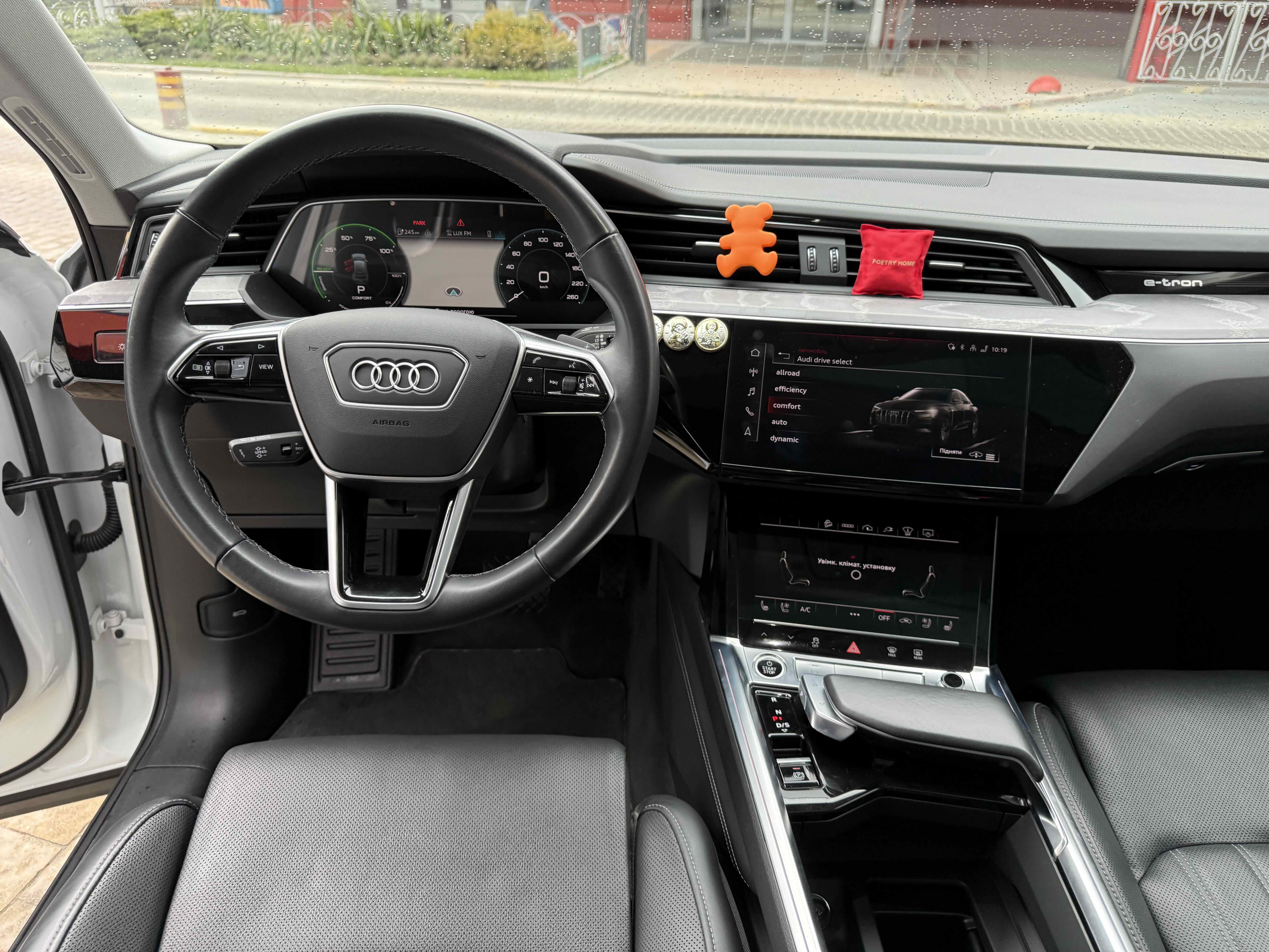 У салоні - вже відомі нам по інших моделях марки два дисплея системи MMI в центрі, а також 12.3-дюймова віртуальна панель приладів c можливістю кастомізації. Відмінною особливістю є оформлення центрального тунелю, а також «селектор КПП», який насправді реалізований як упор під руку, а перемикання режимів їзди здійснюється великим пальцем. Що стосується багажника, то його обсяг становить 600 л під полицею (+1700 л зі складеним в рівну підлогу заднім рядом), але ще один відсік доступний і спереду (frunk - тобто front trunk - має в своєму розпорядженні 60 літрами обсягу, там зручно зберігати кабелі для зарядки ).