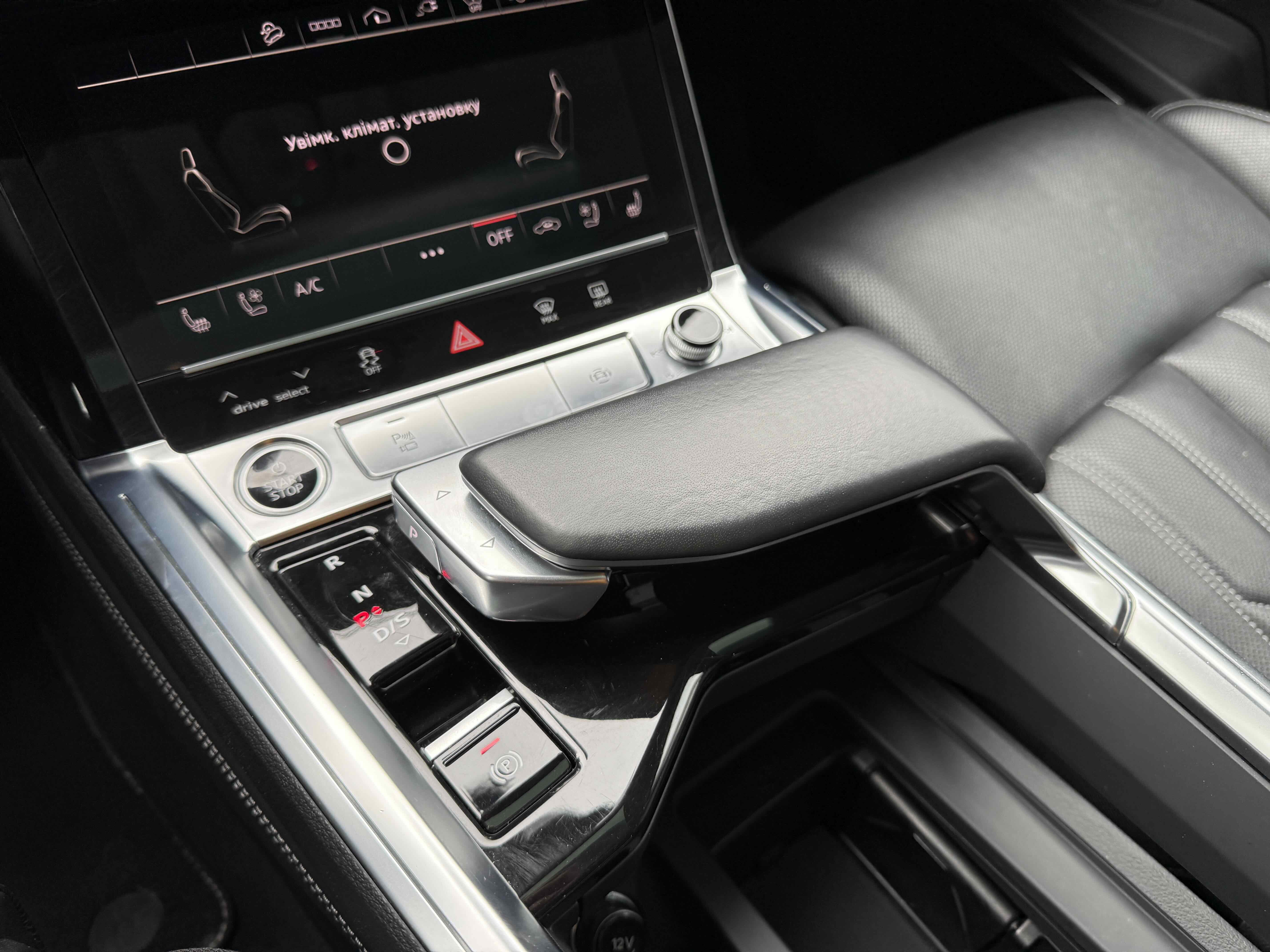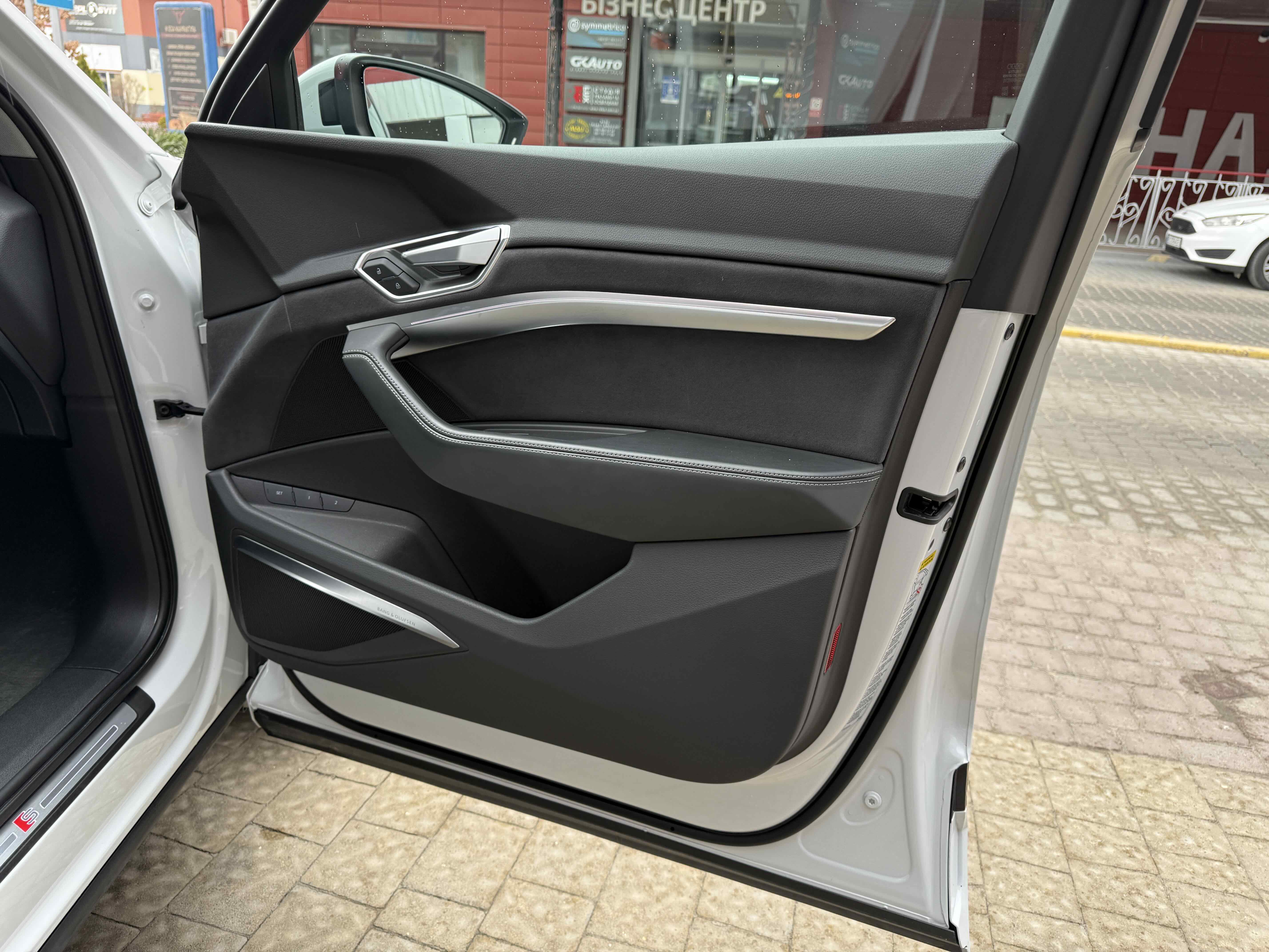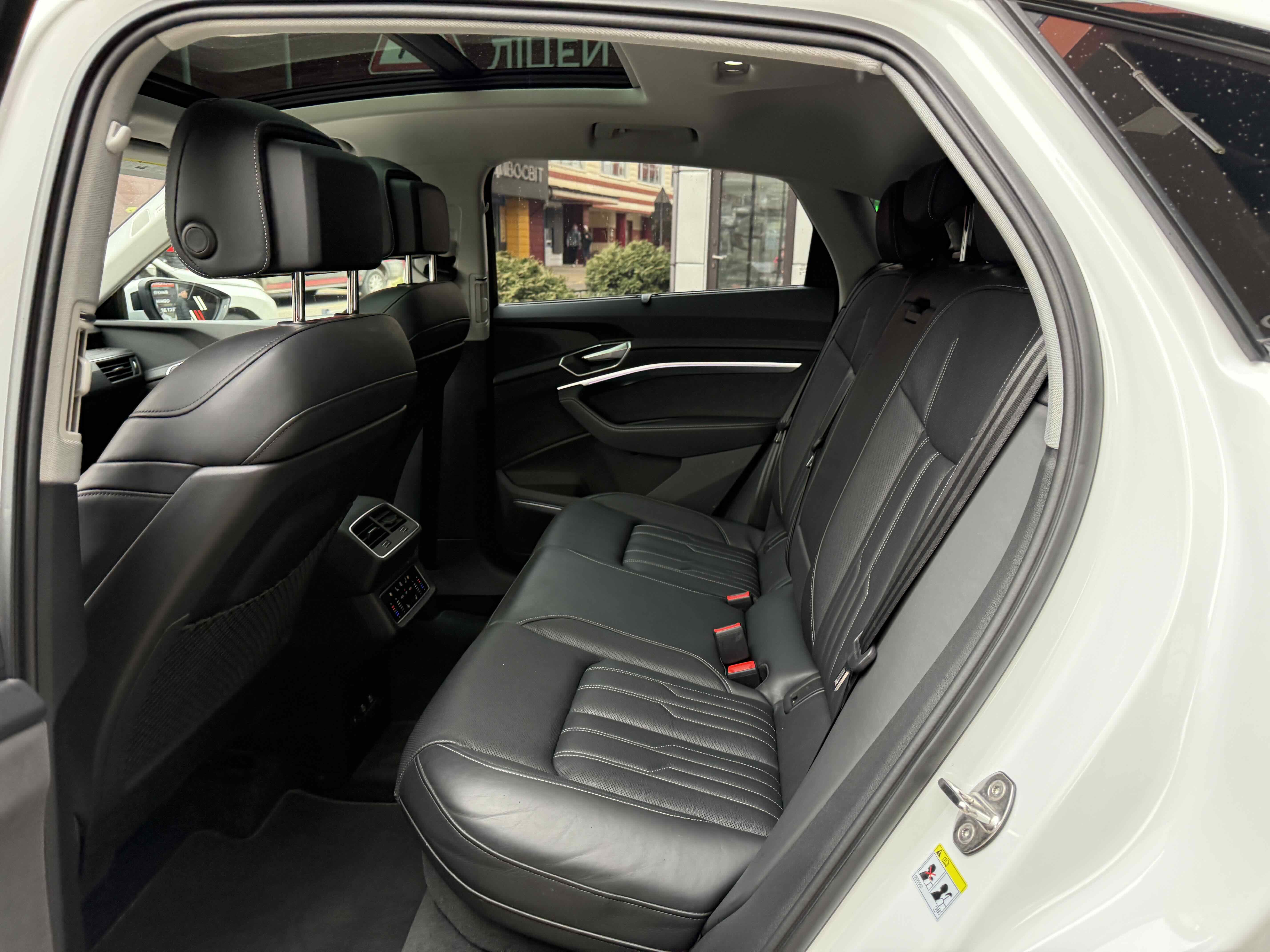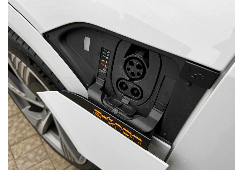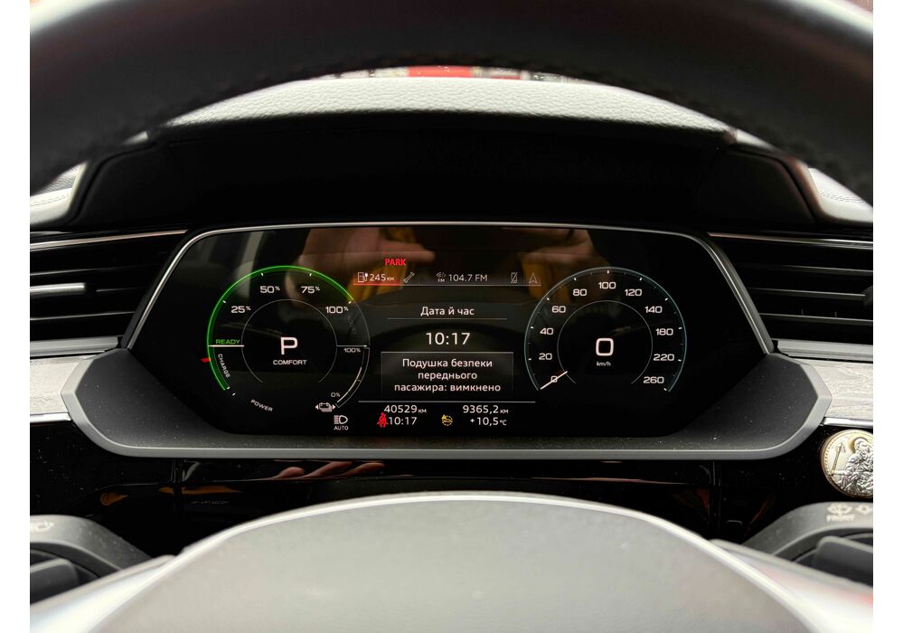 У салоні - вже відомі нам по інших моделях марки два дисплея системи MMI в центрі, а також 12.3-дюймова віртуальна панель приладів c можливістю кастомізації. Відмінною особливістю є оформлення центрального тунелю, а також «селектор КПП», який насправді реалізований як упор під руку, а перемикання режимів їзди здійснюється великим пальцем. Що стосується багажника, то його обсяг становить 600 л під полицею (+1700 л зі складеним в рівну підлогу заднім рядом), але ще один відсік доступний і спереду (frunk - тобто front trunk - має в своєму розпорядженні 60 літрами обсягу, там зручно зберігати кабелі для зарядки ).