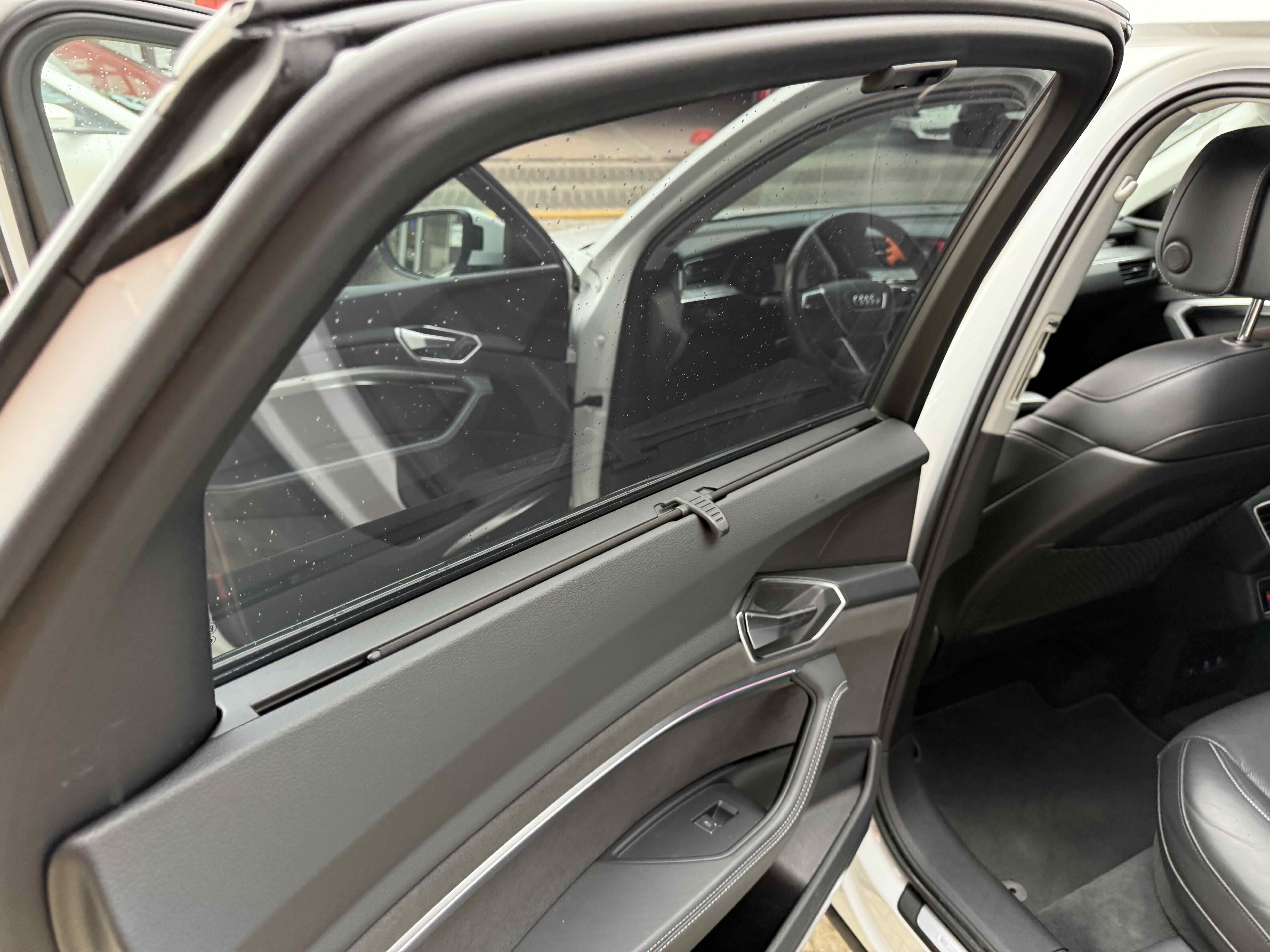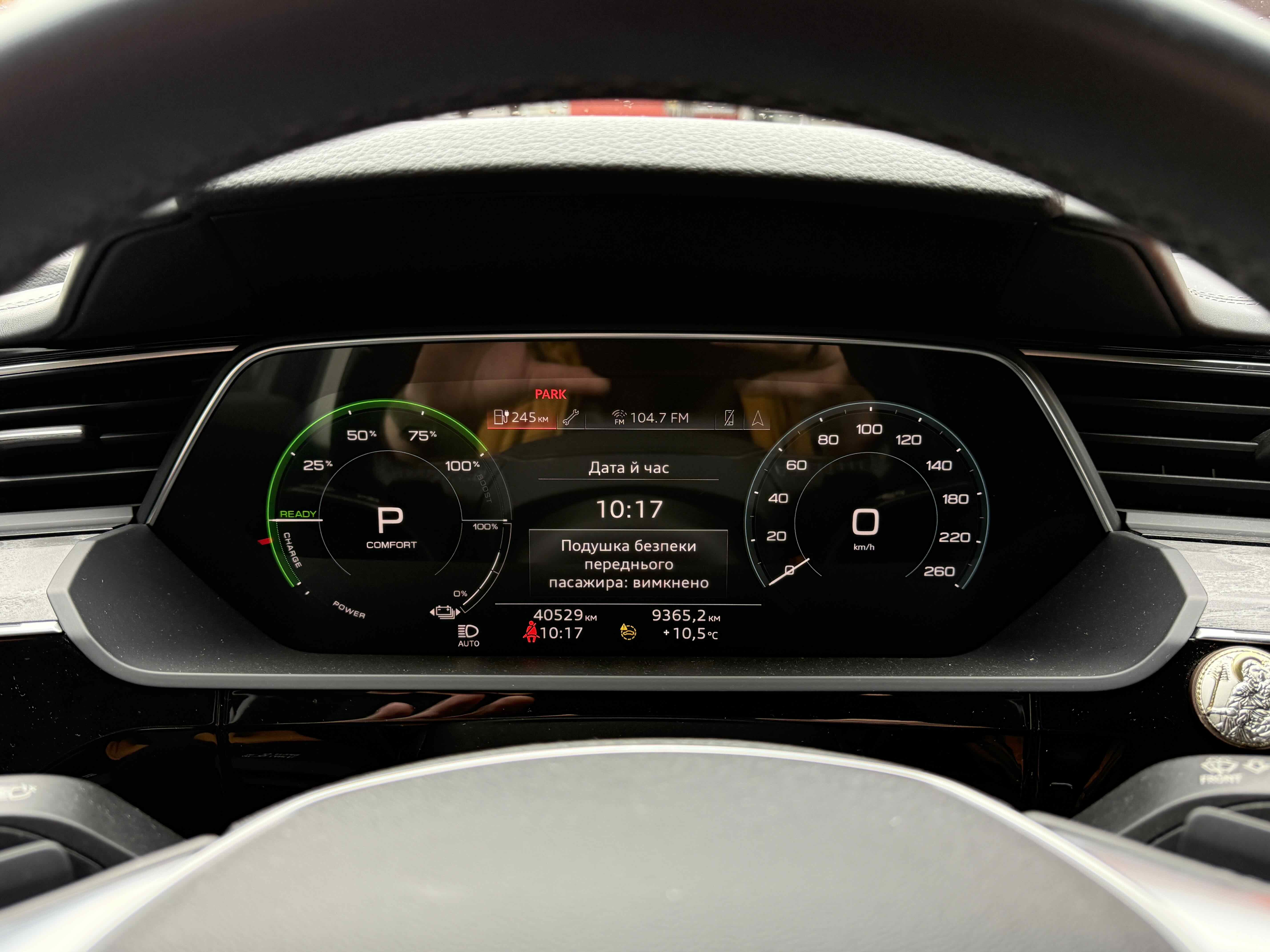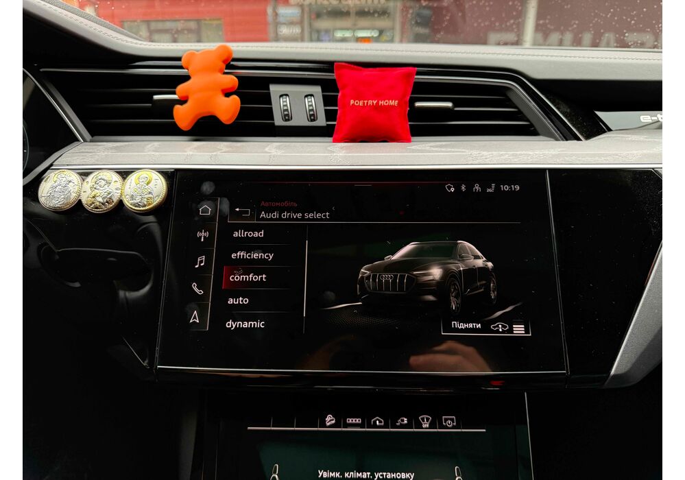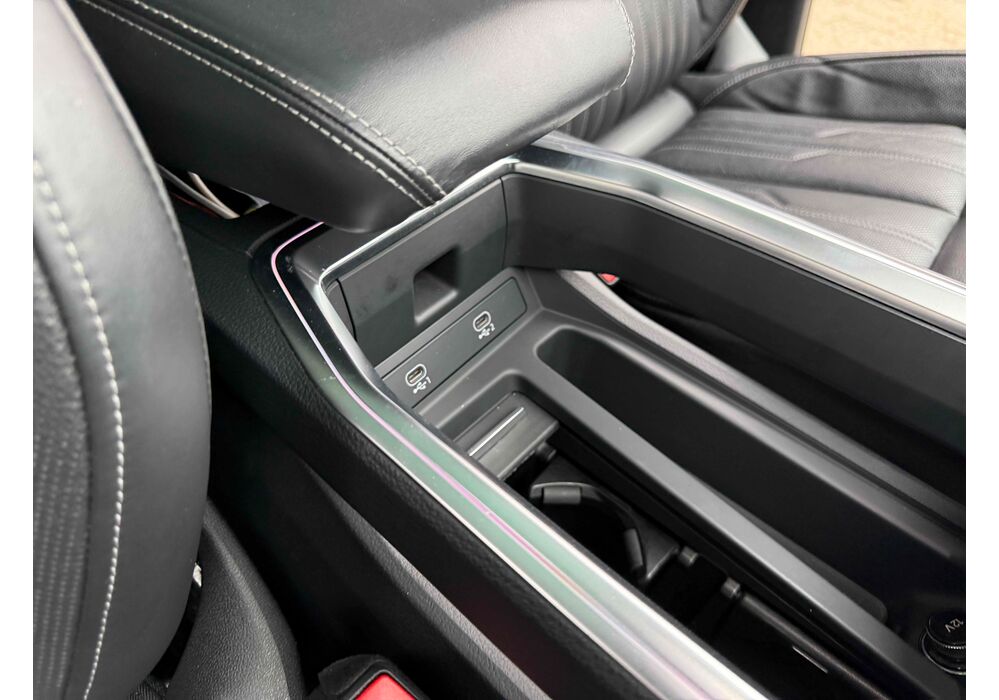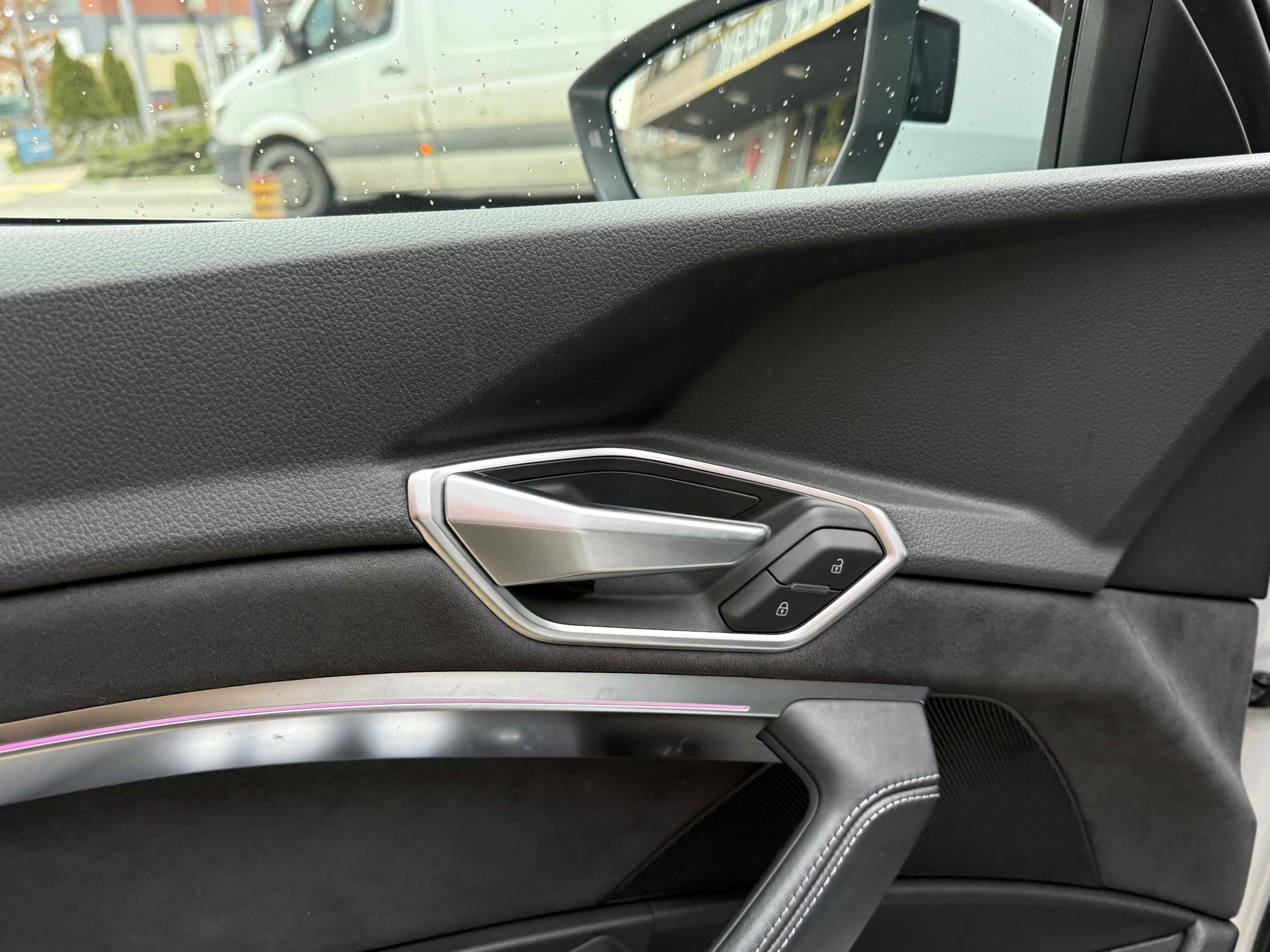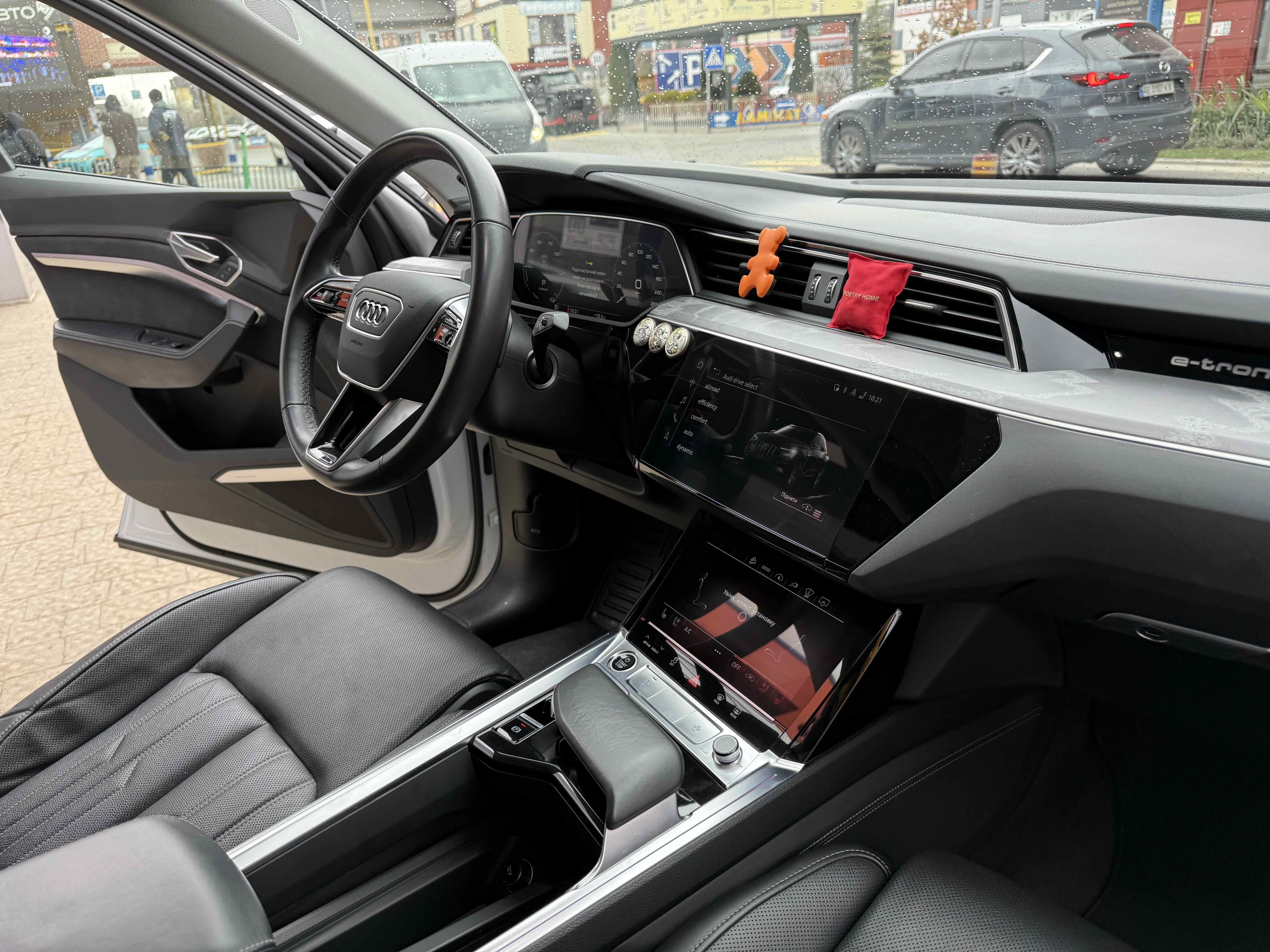 У салоні - вже відомі нам по інших моделях марки два дисплея системи MMI в центрі, а також 12.3-дюймова віртуальна панель приладів c можливістю кастомізації. Відмінною особливістю є оформлення центрального тунелю, а також «селектор КПП», який насправді реалізований як упор під руку, а перемикання режимів їзди здійснюється великим пальцем. Що стосується багажника, то його обсяг становить 600 л під полицею (+1700 л зі складеним в рівну підлогу заднім рядом), але ще один відсік доступний і спереду (frunk - тобто front trunk - має в своєму розпорядженні 60 літрами обсягу, там зручно зберігати кабелі для зарядки ).