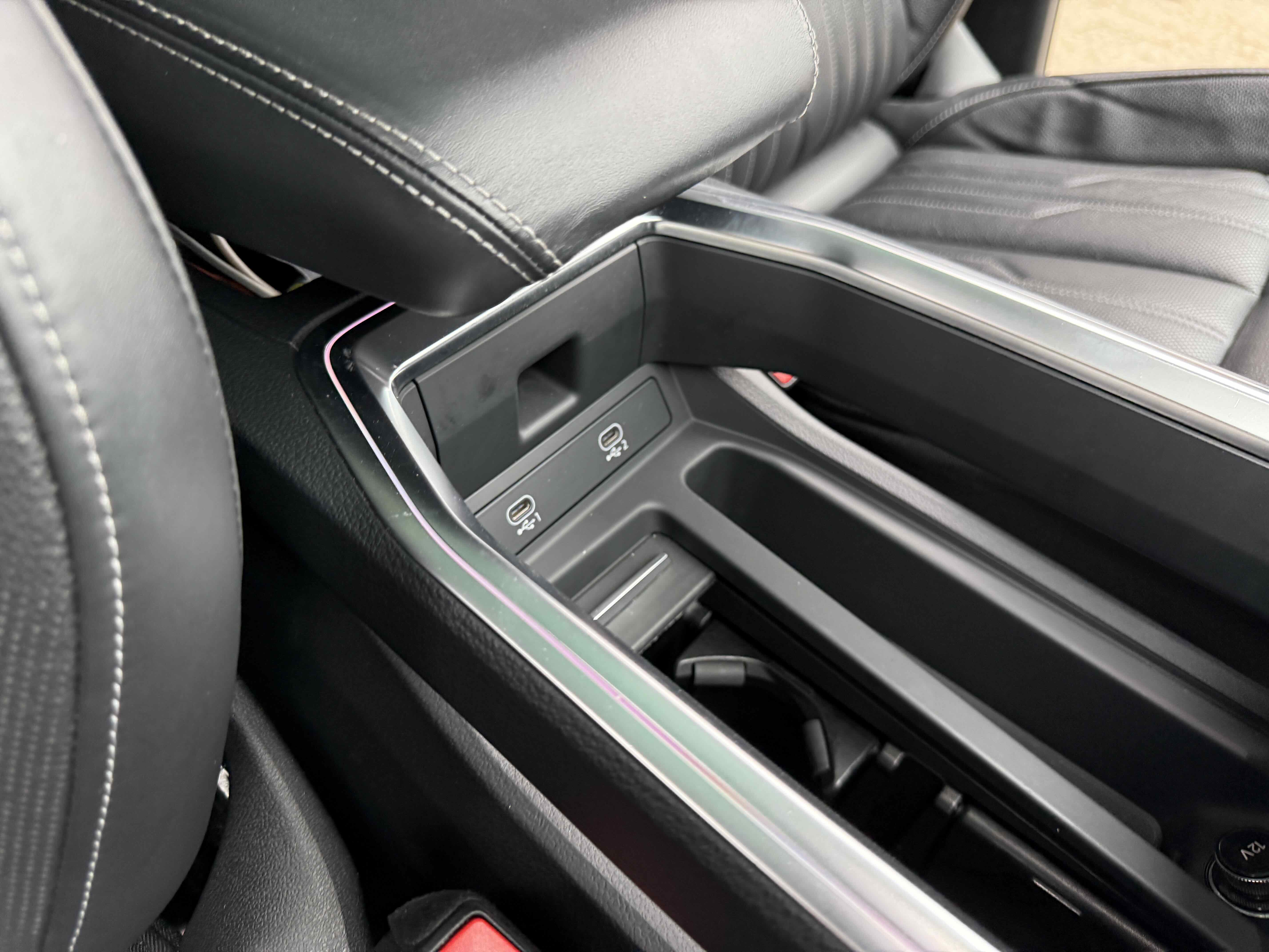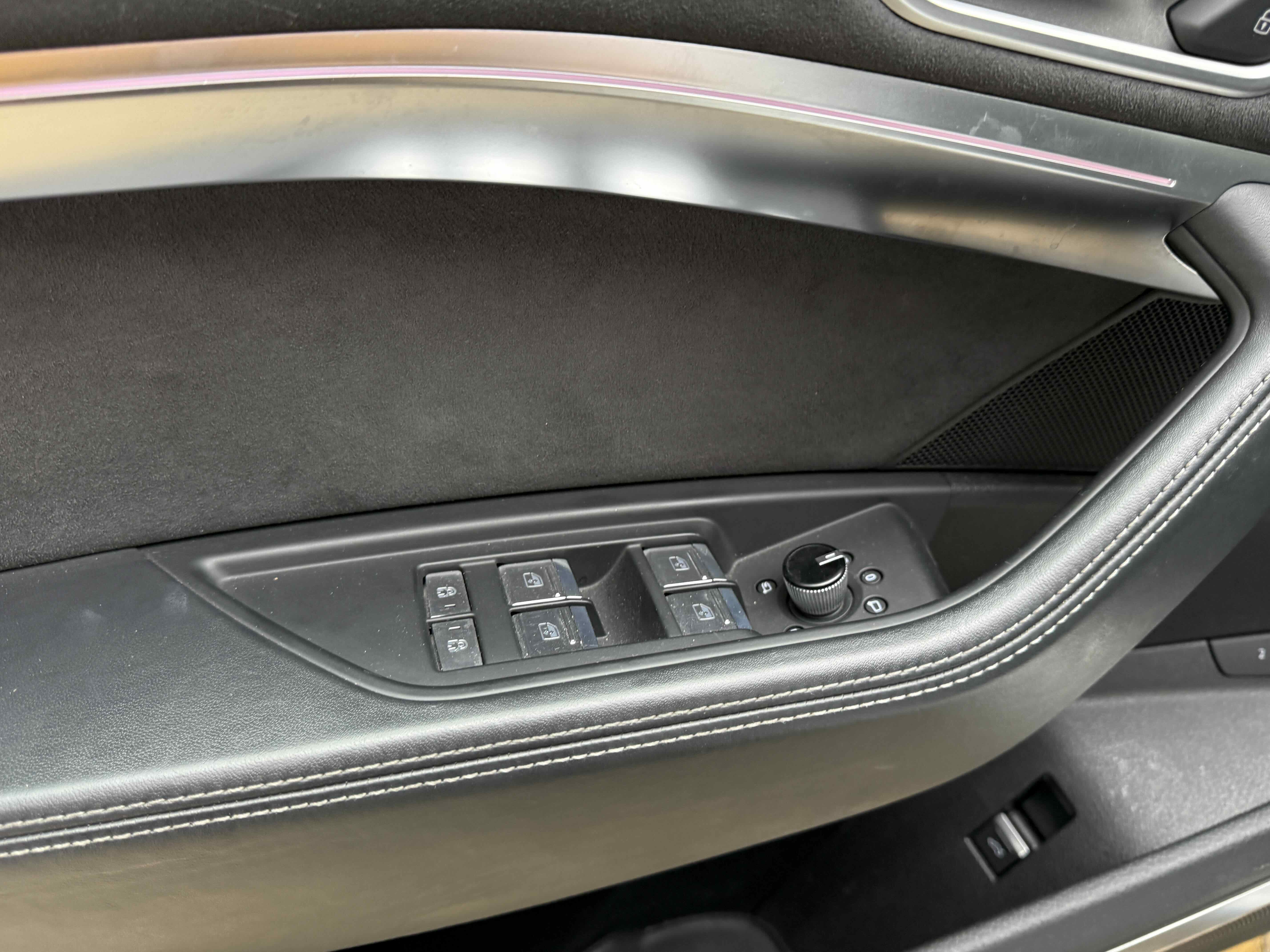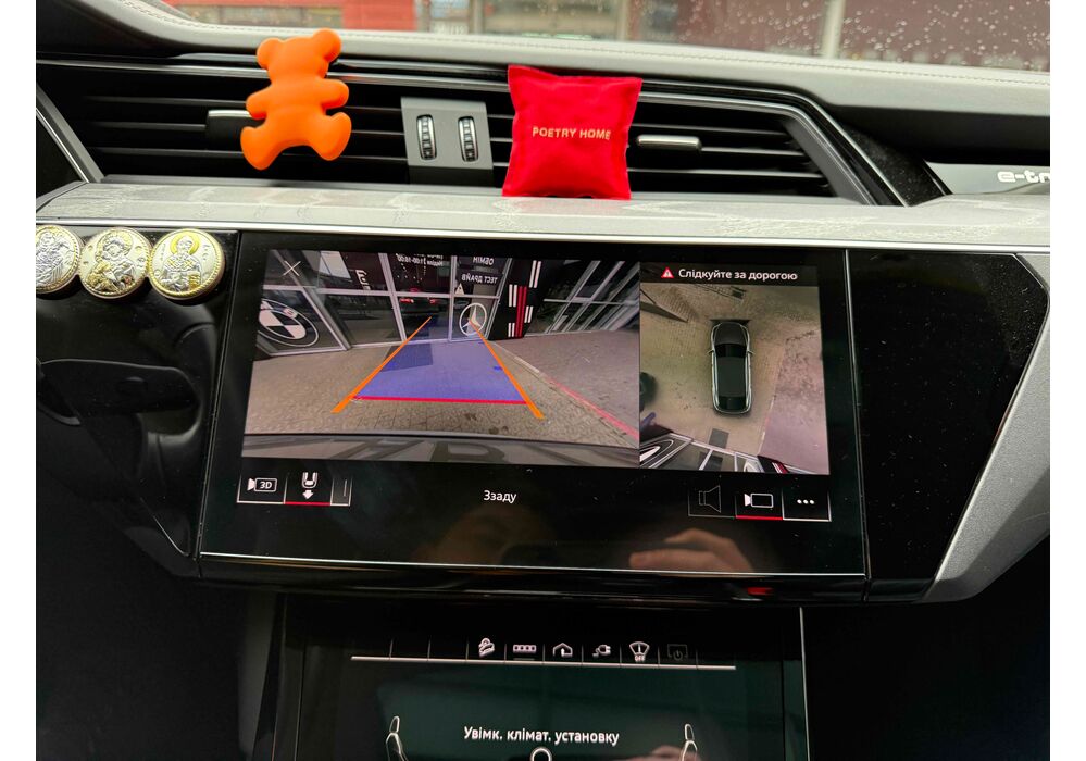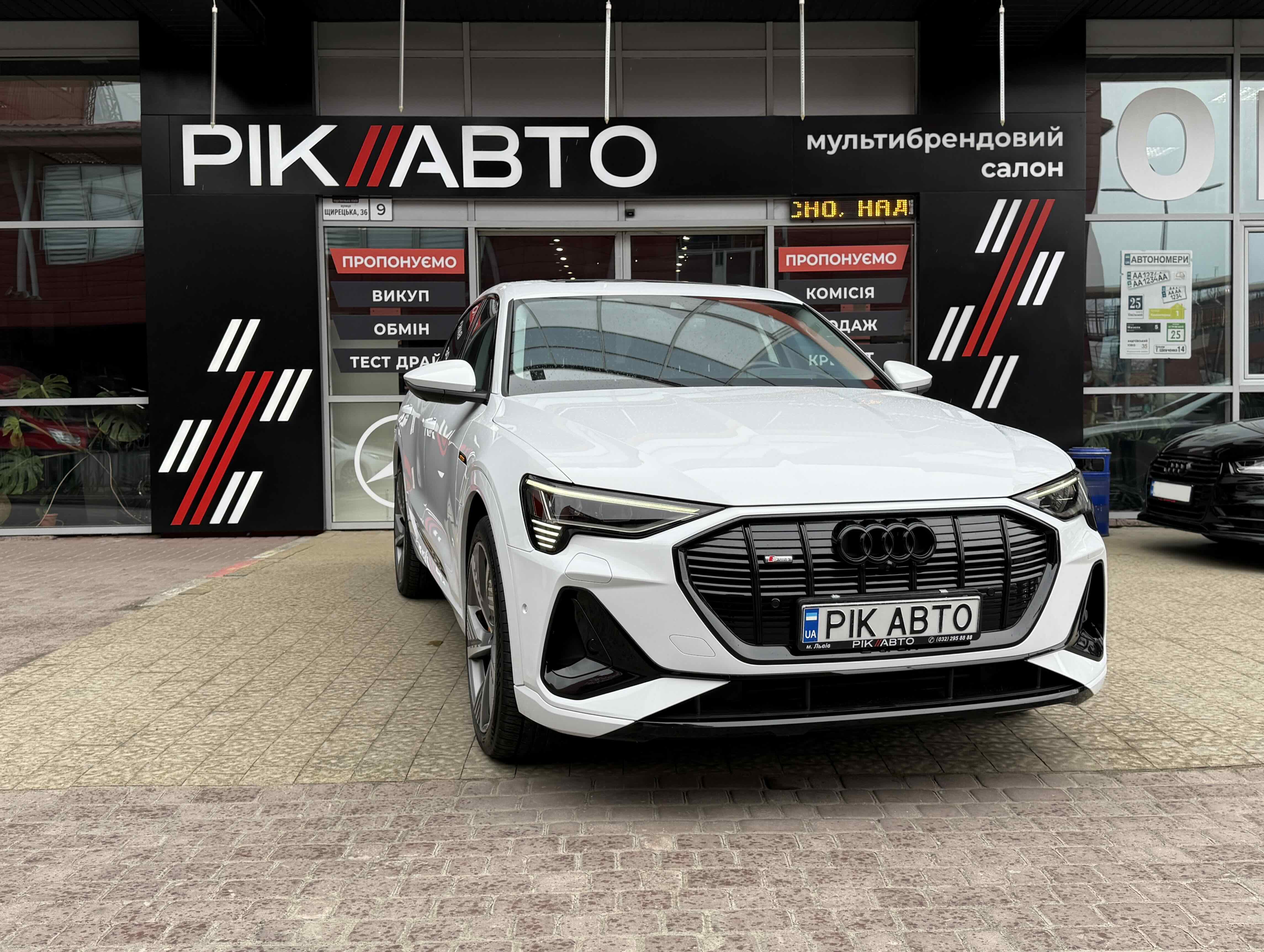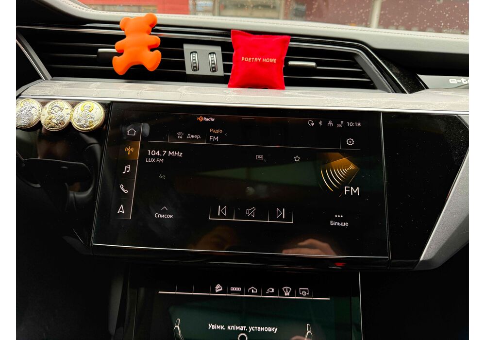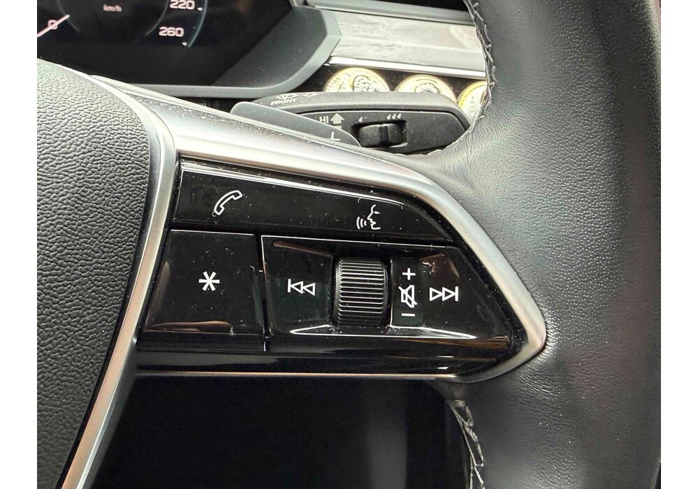 У салоні - вже відомі нам по інших моделях марки два дисплея системи MMI в центрі, а також 12.3-дюймова віртуальна панель приладів c можливістю кастомізації. Відмінною особливістю є оформлення центрального тунелю, а також «селектор КПП», який насправді реалізований як упор під руку, а перемикання режимів їзди здійснюється великим пальцем. Що стосується багажника, то його обсяг становить 600 л під полицею (+1700 л зі складеним в рівну підлогу заднім рядом), але ще один відсік доступний і спереду (frunk - тобто front trunk - має в своєму розпорядженні 60 літрами обсягу, там зручно зберігати кабелі для зарядки ).