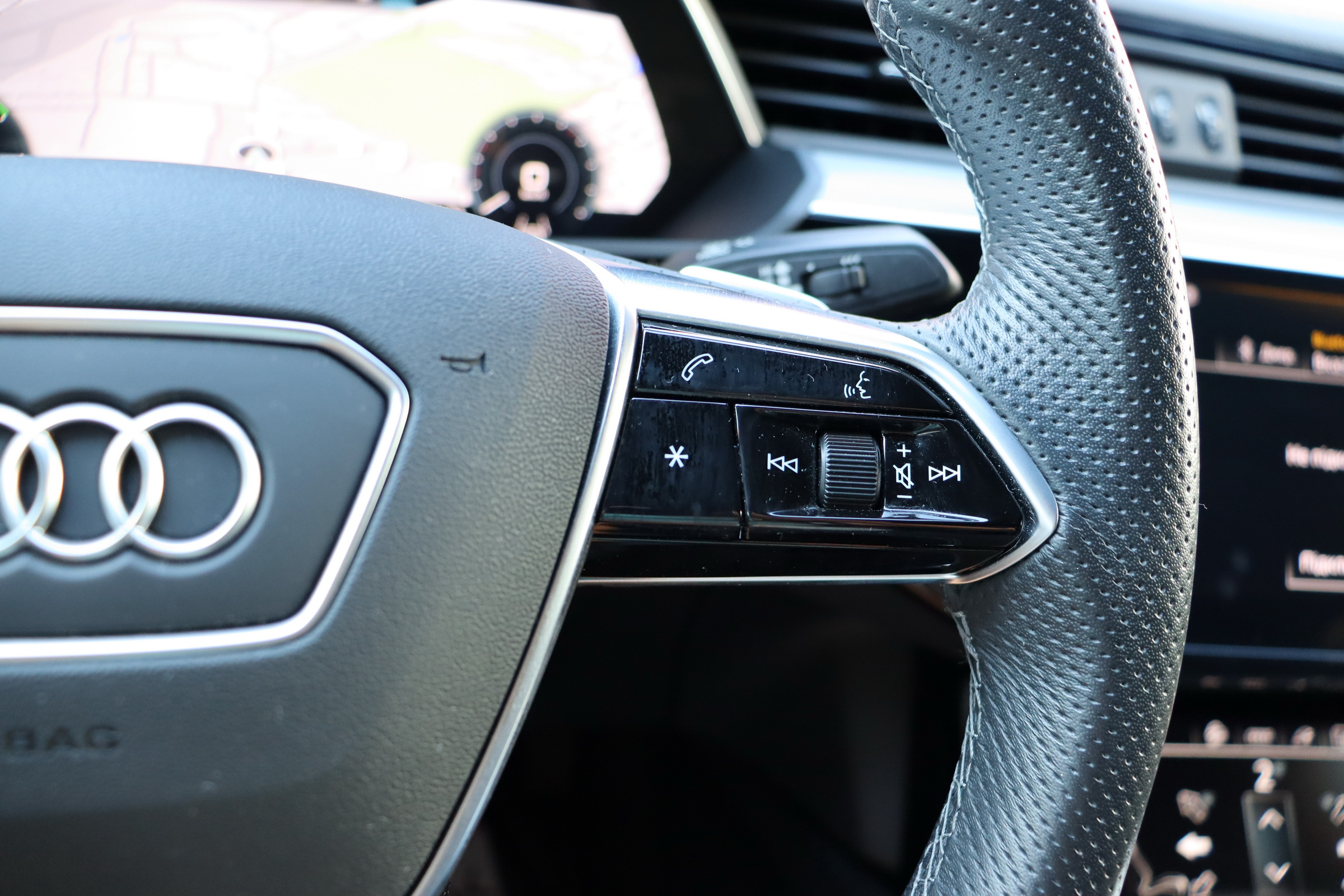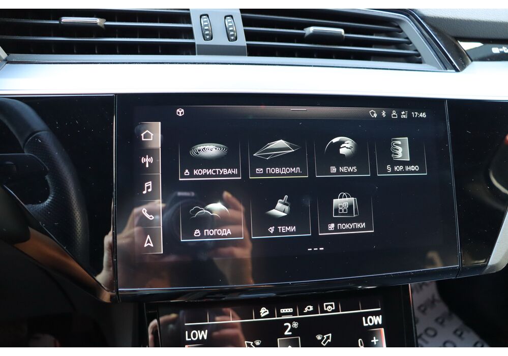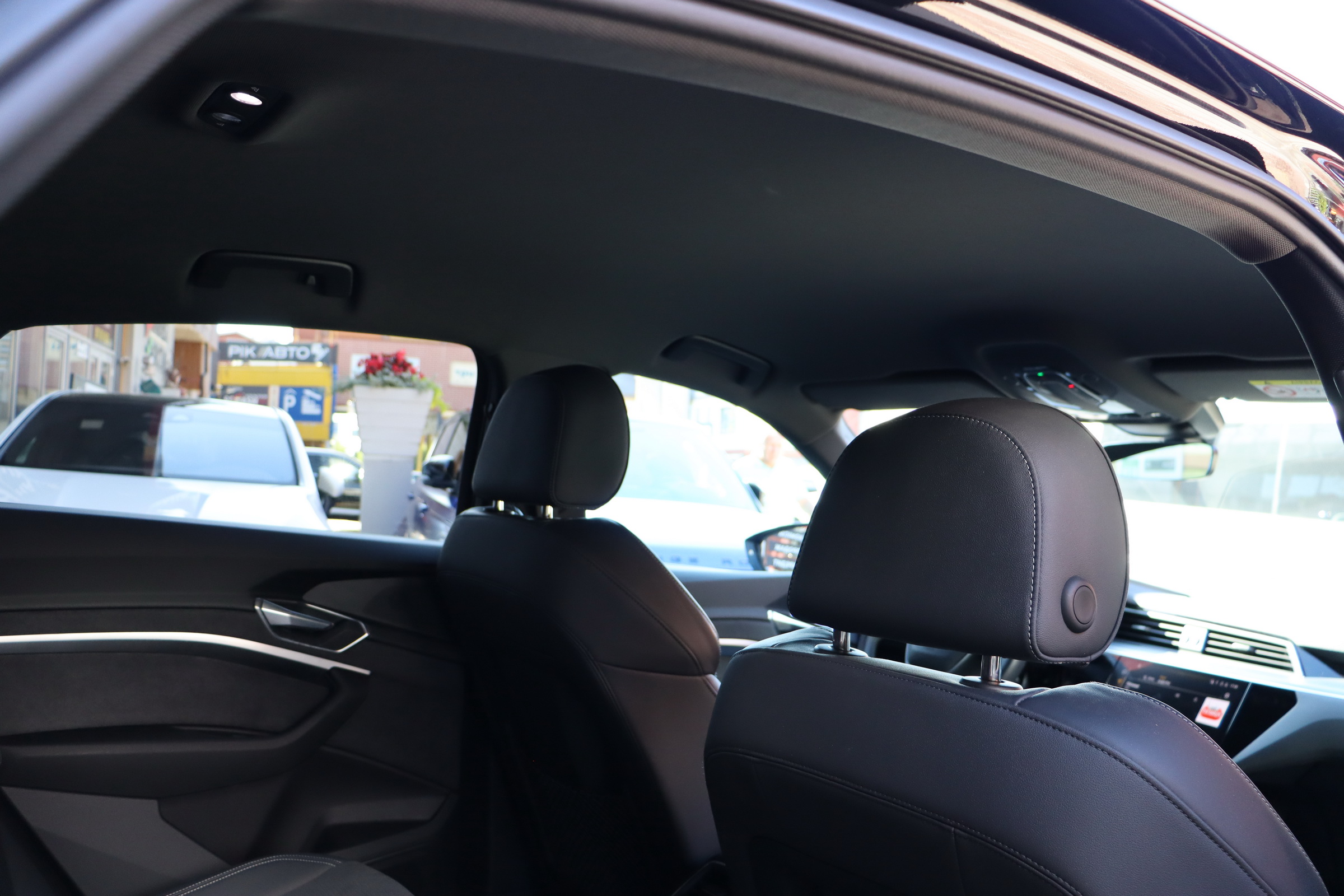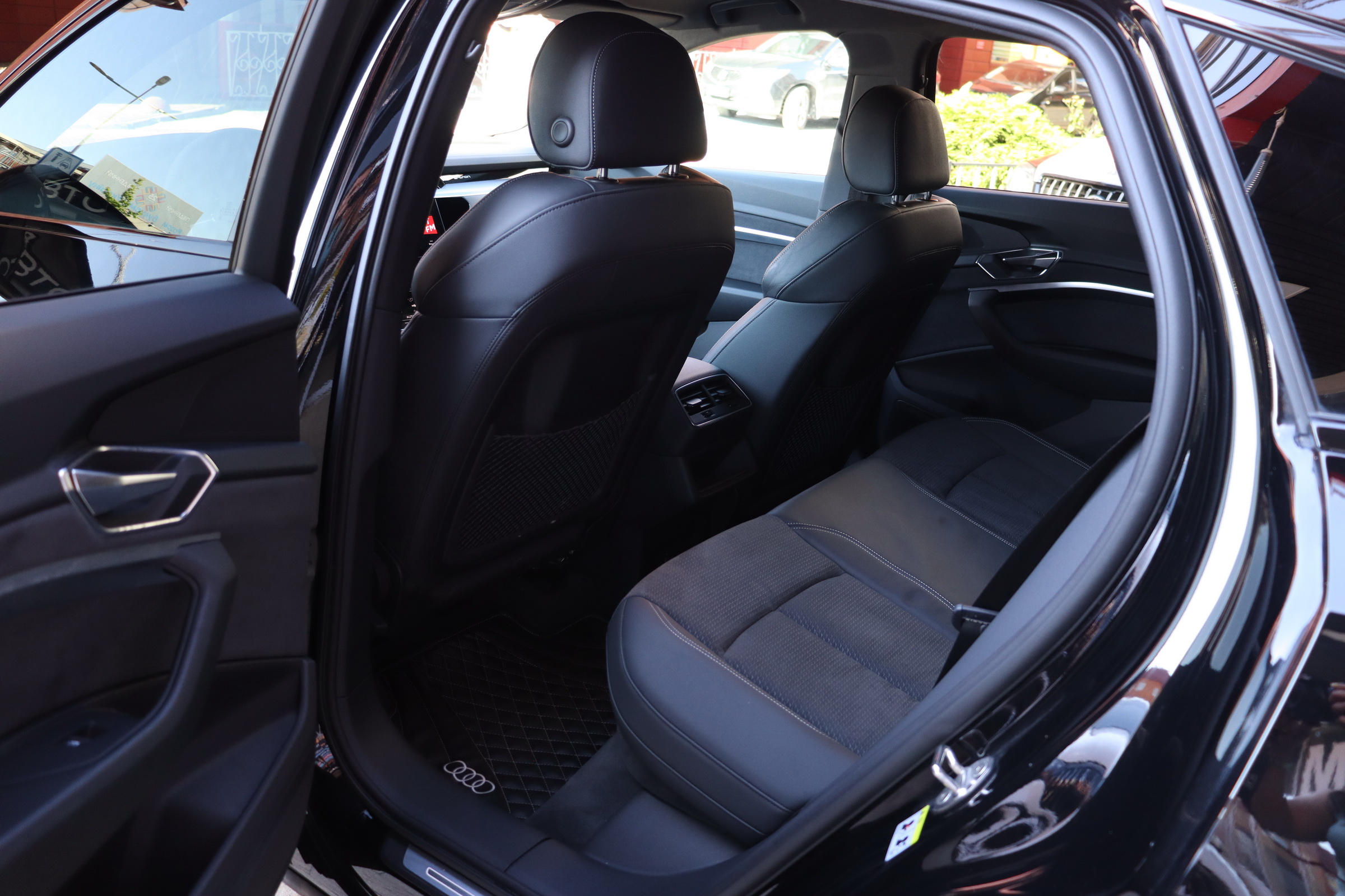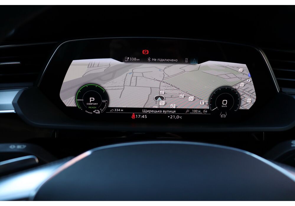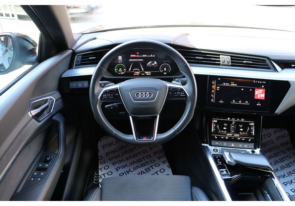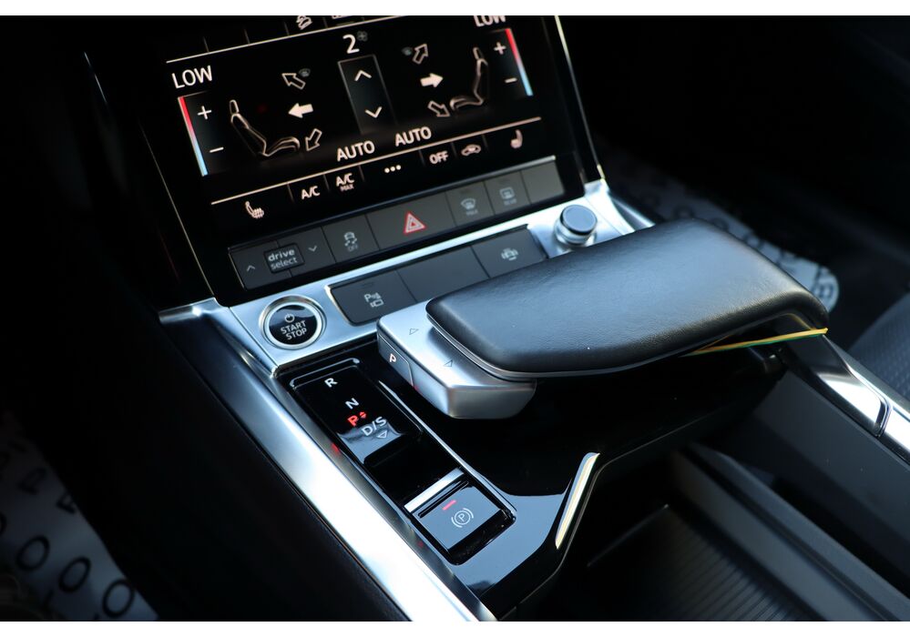 У салоні - вже відомі нам по інших моделях марки два дисплея системи MMI в центрі, а також 12.3-дюймова віртуальна панель приладів c можливістю кастомізації. Відмінною особливістю є оформлення центрального тунелю, а також «селектор КПП», який насправді реалізований як упор під руку, а перемикання режимів їзди здійснюється великим пальцем. Що стосується багажника, то його обсяг становить 600 л під полицею (+1700 л зі складеним в рівну підлогу заднім рядом), але ще один відсік доступний і спереду (frunk - тобто front trunk - має в своєму розпорядженні 60 літрами обсягу, там зручно зберігати кабелі для зарядки ).