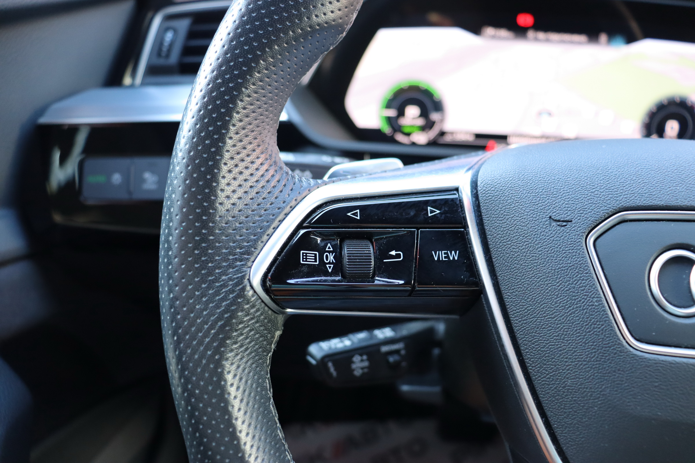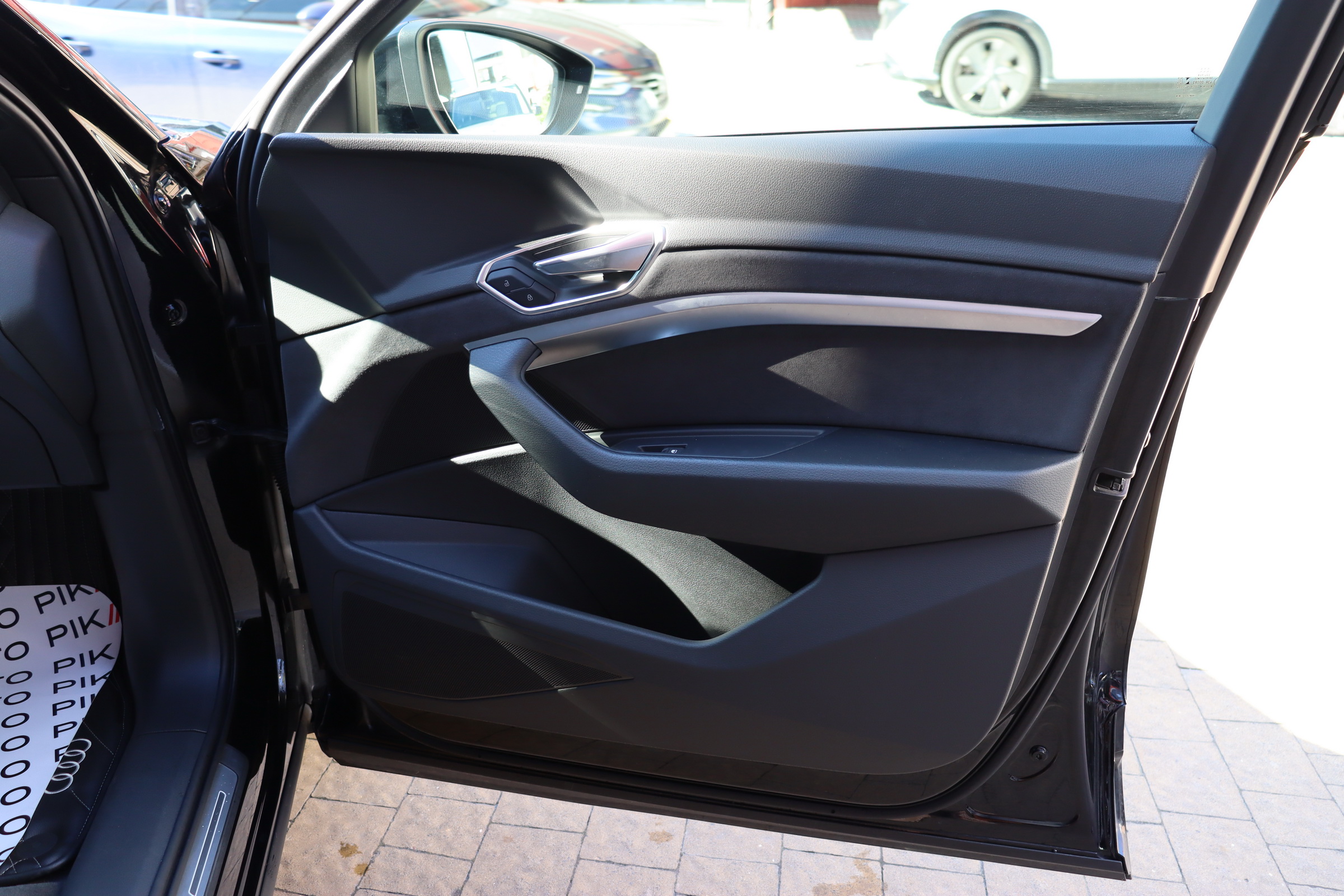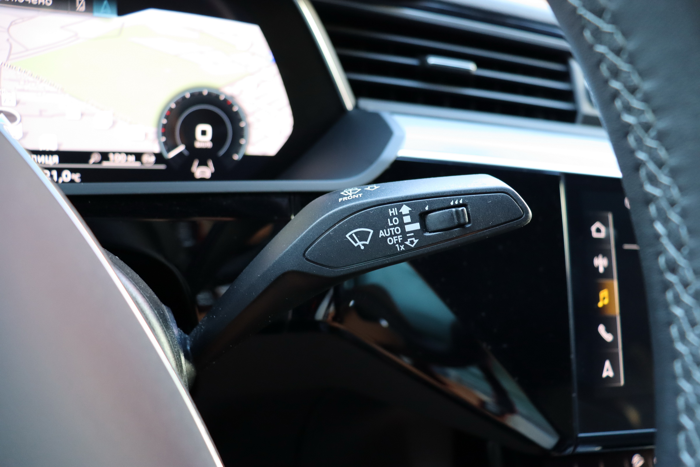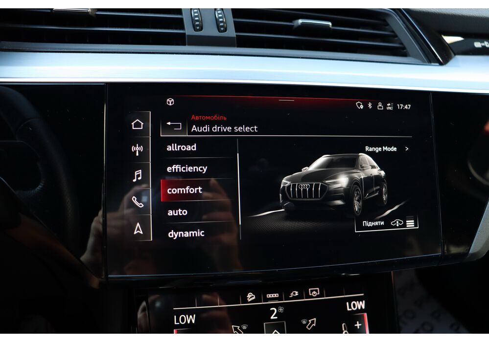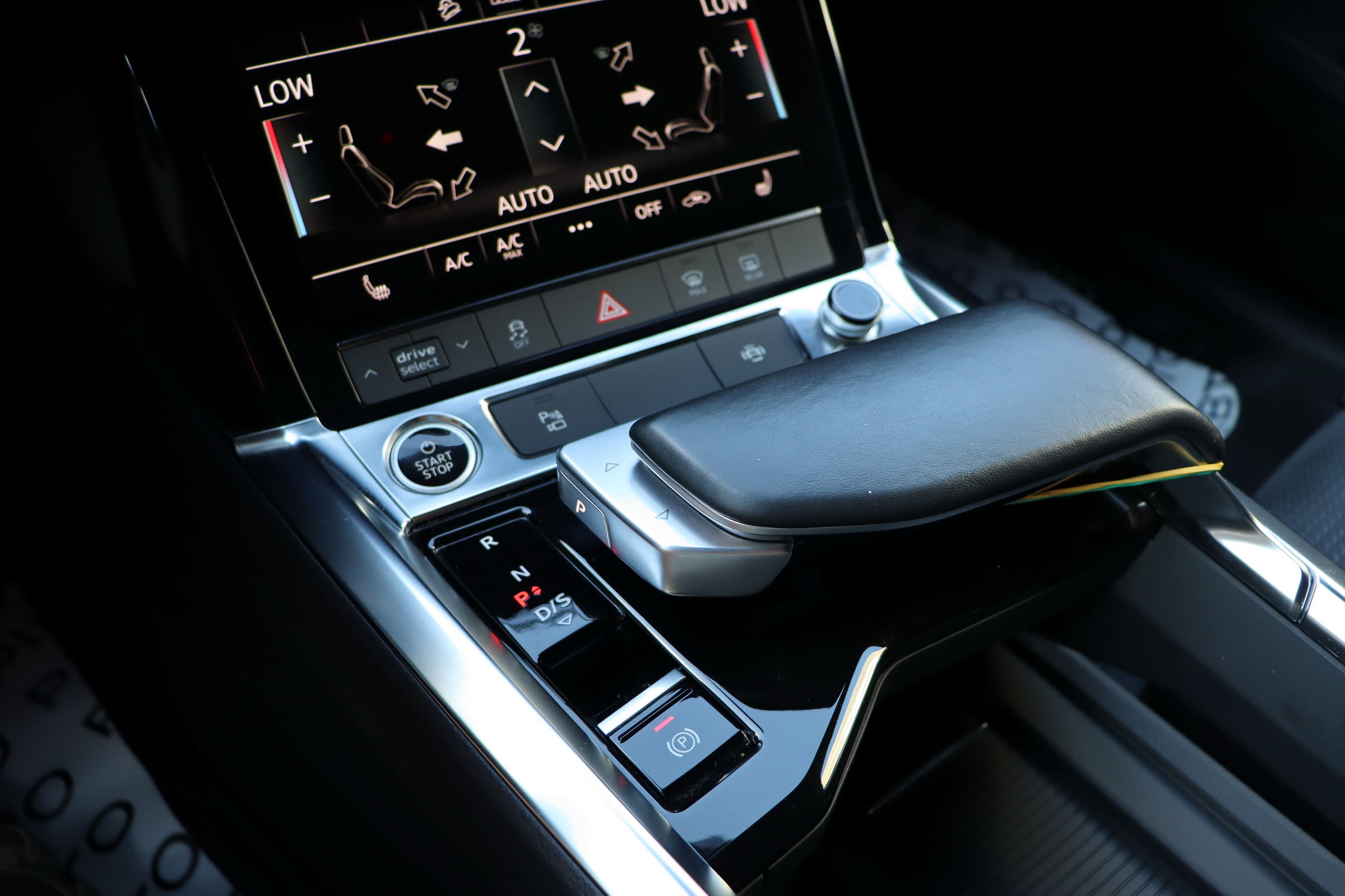 У салоні - вже відомі нам по інших моделях марки два дисплея системи MMI в центрі, а також 12.3-дюймова віртуальна панель приладів c можливістю кастомізації. Відмінною особливістю є оформлення центрального тунелю, а також «селектор КПП», який насправді реалізований як упор під руку, а перемикання режимів їзди здійснюється великим пальцем. Що стосується багажника, то його обсяг становить 600 л під полицею (+1700 л зі складеним в рівну підлогу заднім рядом), але ще один відсік доступний і спереду (frunk - тобто front trunk - має в своєму розпорядженні 60 літрами обсягу, там зручно зберігати кабелі для зарядки ).