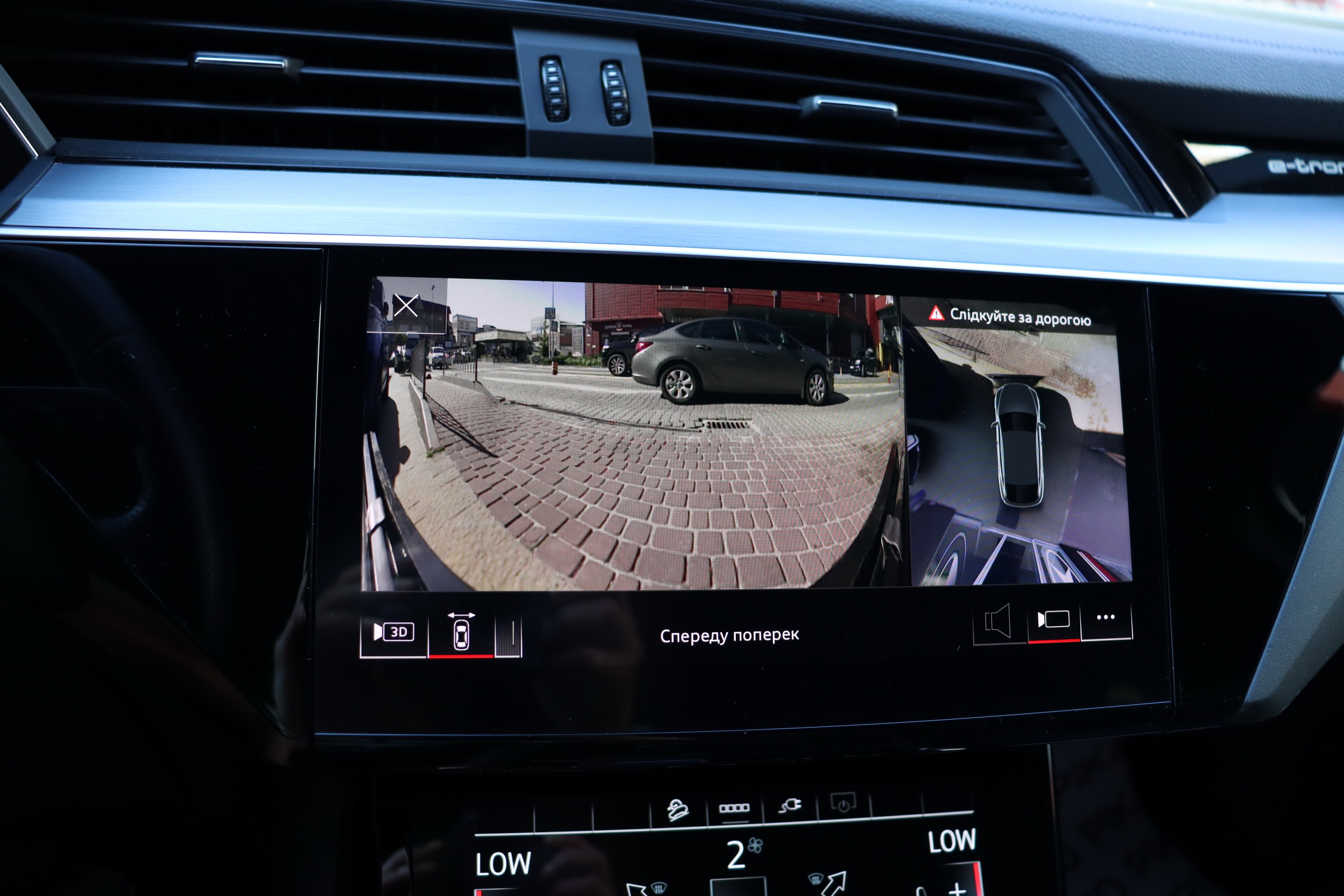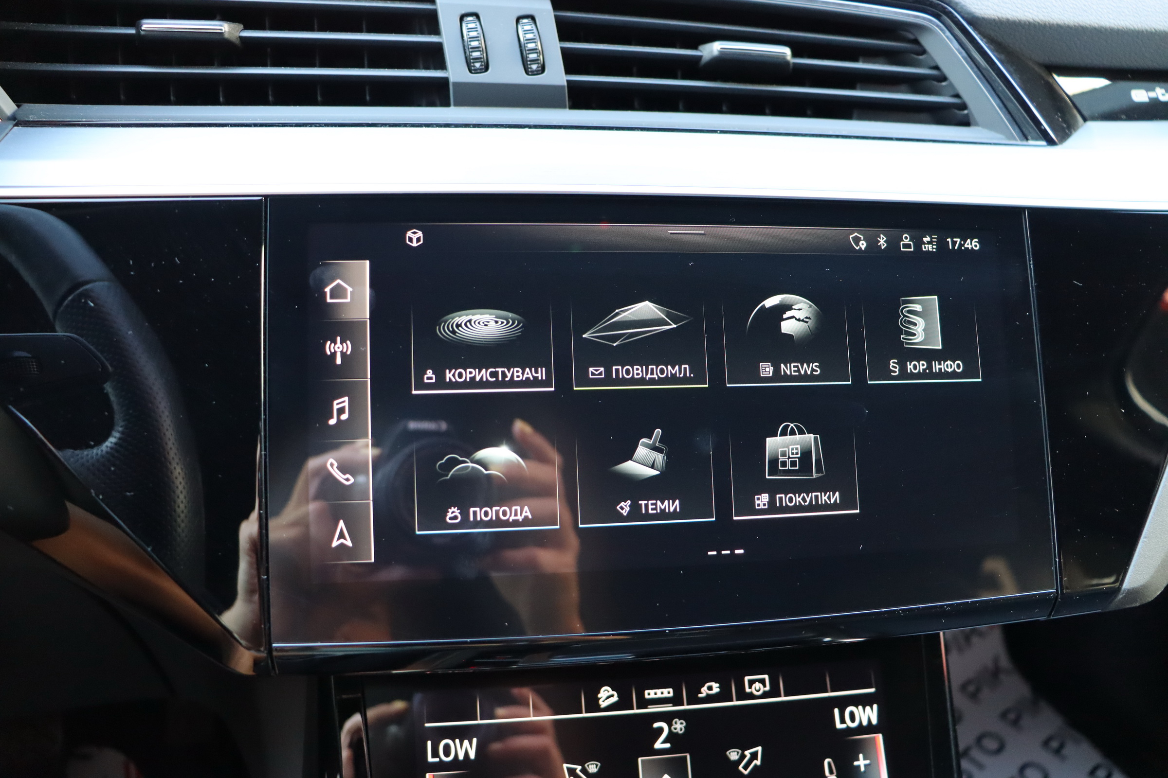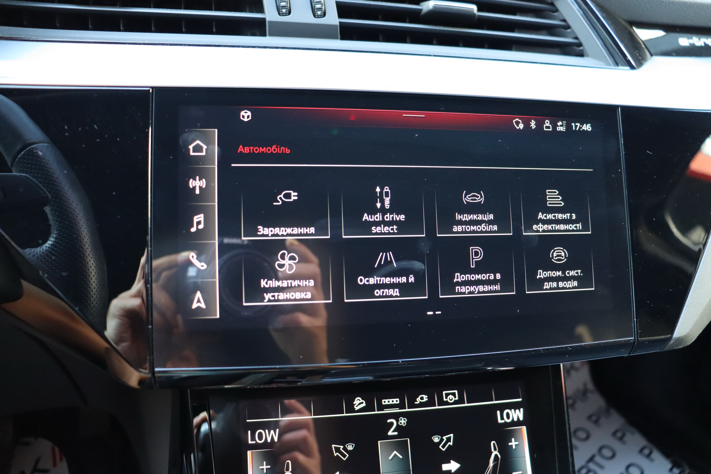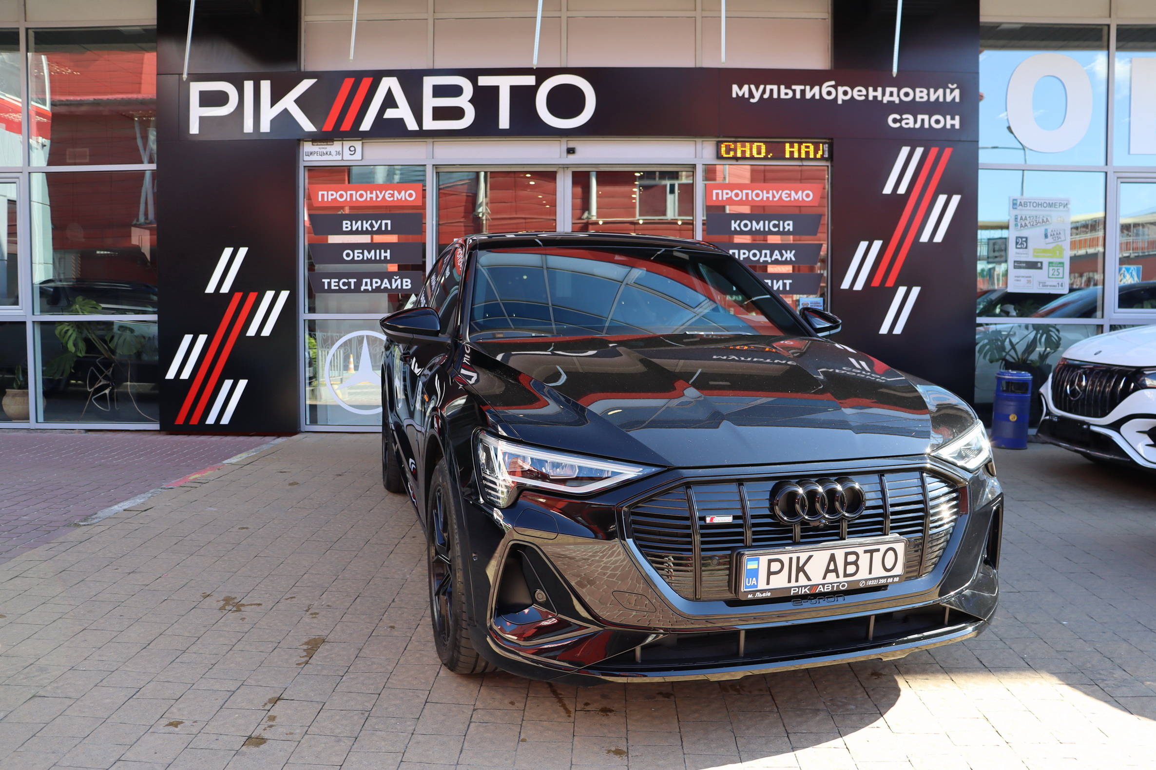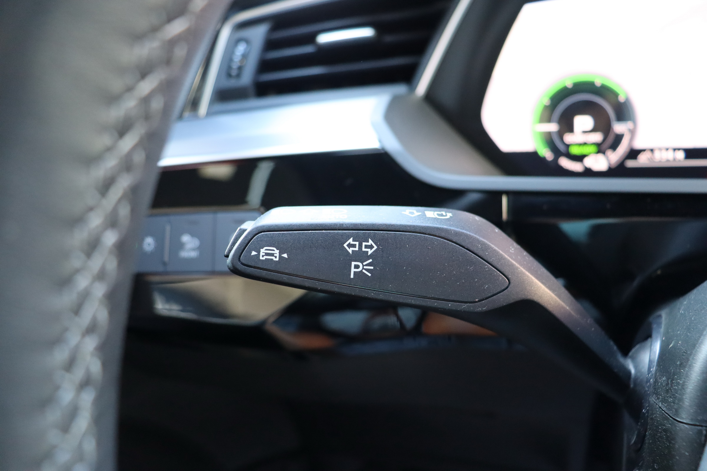 У салоні - вже відомі нам по інших моделях марки два дисплея системи MMI в центрі, а також 12.3-дюймова віртуальна панель приладів c можливістю кастомізації. Відмінною особливістю є оформлення центрального тунелю, а також «селектор КПП», який насправді реалізований як упор під руку, а перемикання режимів їзди здійснюється великим пальцем. Що стосується багажника, то його обсяг становить 600 л під полицею (+1700 л зі складеним в рівну підлогу заднім рядом), але ще один відсік доступний і спереду (frunk - тобто front trunk - має в своєму розпорядженні 60 літрами обсягу, там зручно зберігати кабелі для зарядки ).