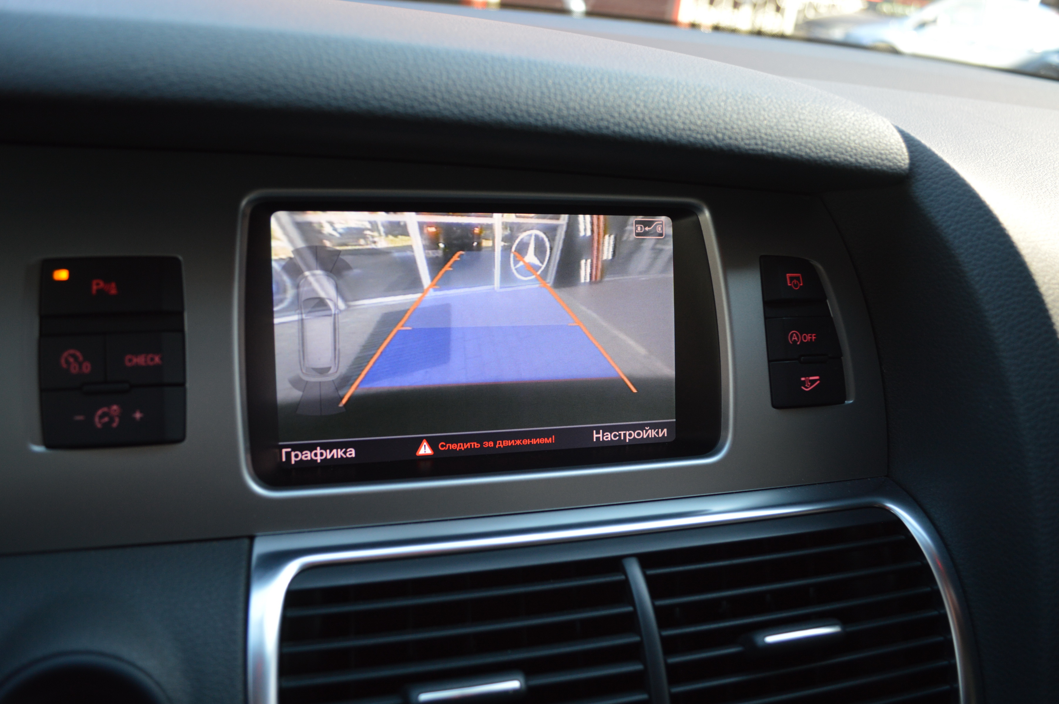 Електронних помічників у водія Audi Q7, якщо не армія, то рота - точно. Це і "підрулюючим" парктроник, і адаптивний круїз-контроль, і розумна головна оптика з автоматичним регулюванням режимів освітлення. "Сліпі зони" ззаду контролює система Side Assist. Якщо при перестроюванні датчики помічають перешкоду, вони дають водієві сигнал світлодіодами, які розташовані на дзеркалах заднього виду. Перешкода справа активує сигнал на правому