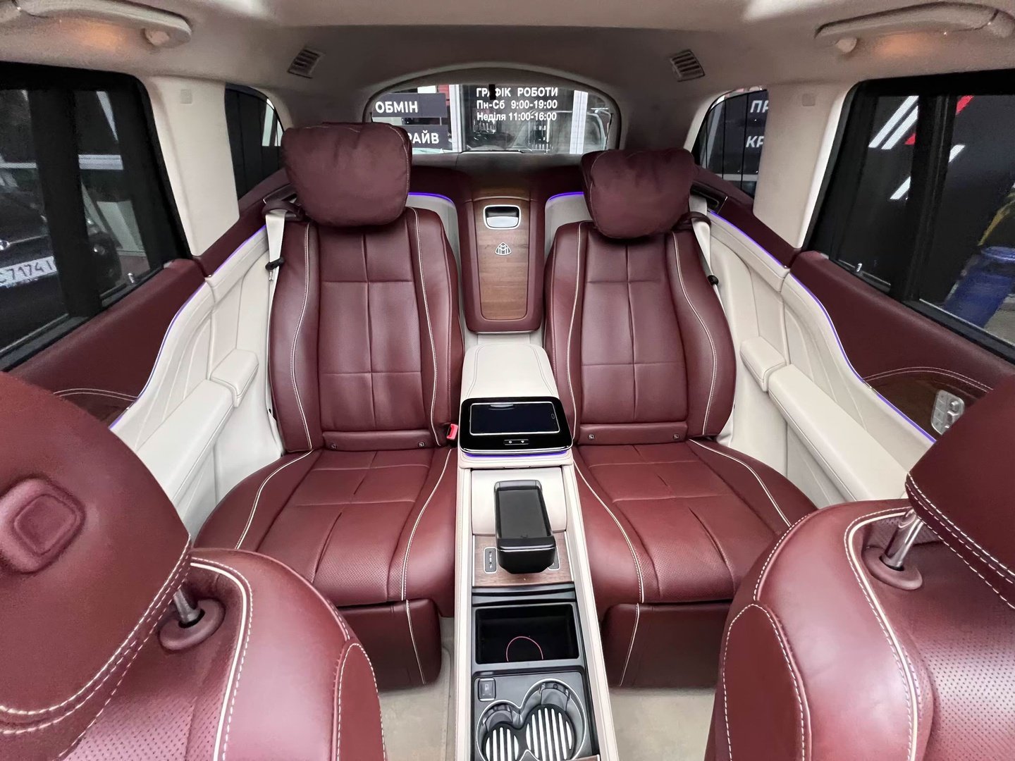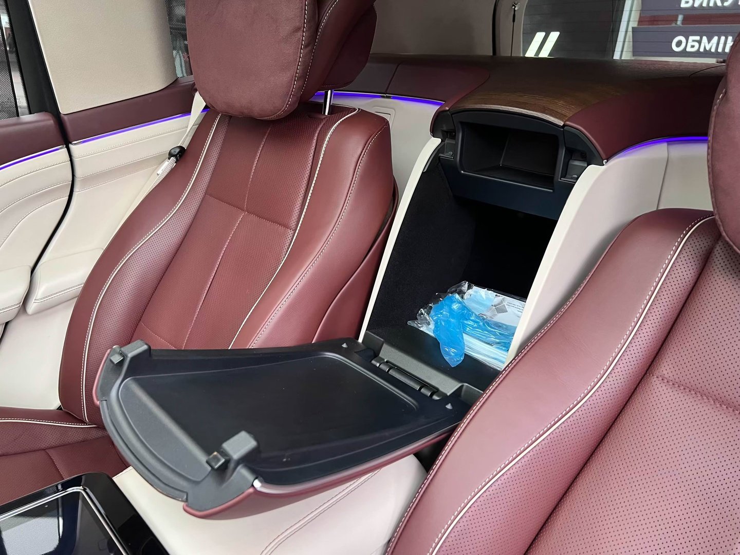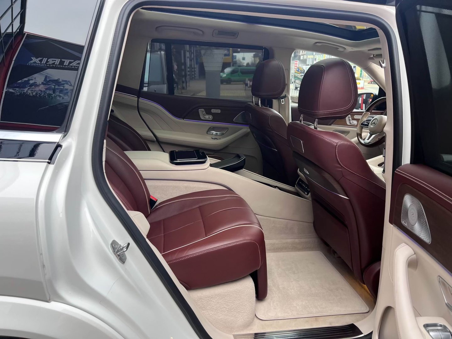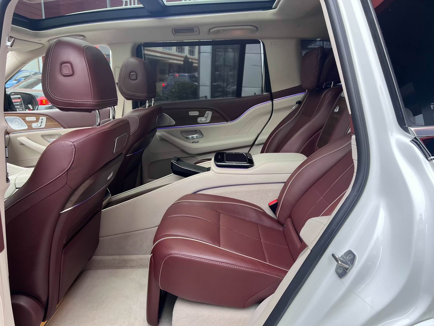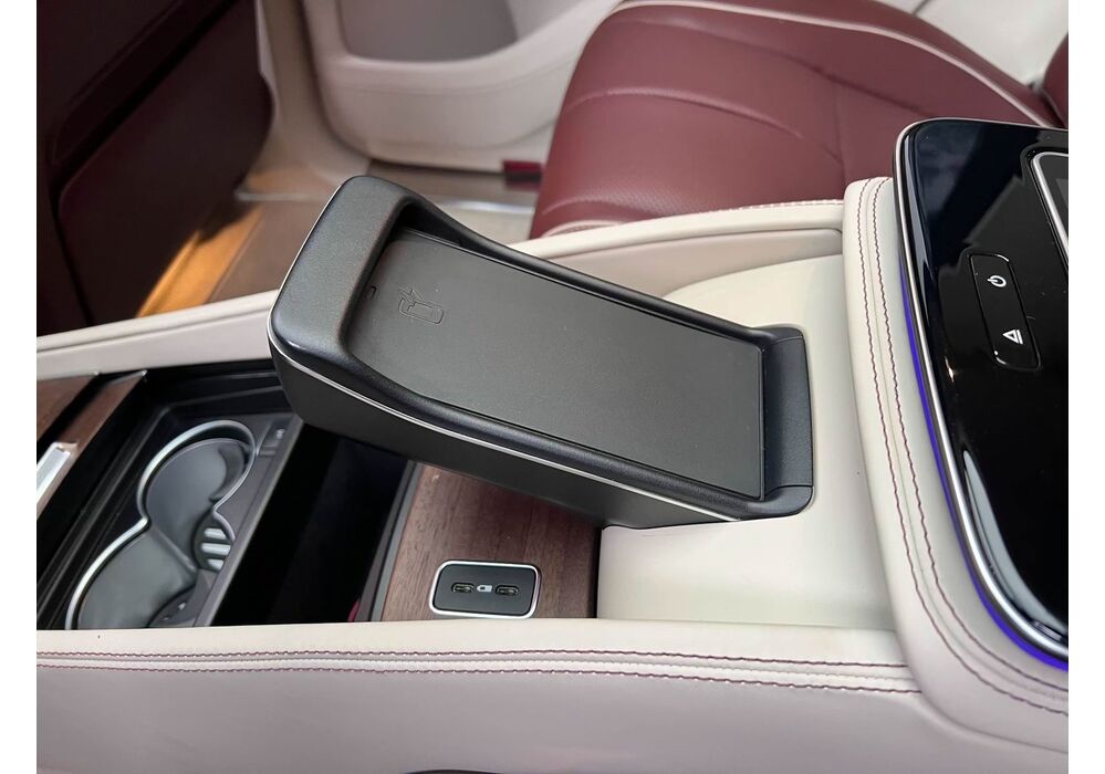 У Maybach GLS використана та ж колісна база, що й у стандартному кросовері, але задній ряд відсунутий назад на 120 мм. Його можна отримати в три або двомісному виконанні (третій ряд для моделі не передбачений взагалі, зате об'єм багажника за спинками другого ряду дорівнює 520 л). Двомісний варіант має крісла, спинки яких опускаються на кут в 43.5 градуса, підтримка гомілок входить у стандартну комплектацію, як і окремий планшет для управління мультимедіа, підсвічуванням і налаштуваннями крісел. За доплату задні пасажири можуть отримати холодильник на кількох пляшок та пару фірмових срібних склянок. Є також можливість замовити складні столики, які ховаються в центральний тунель, що поділяє пасажирів позаду, та розетки, що видають 230 В.