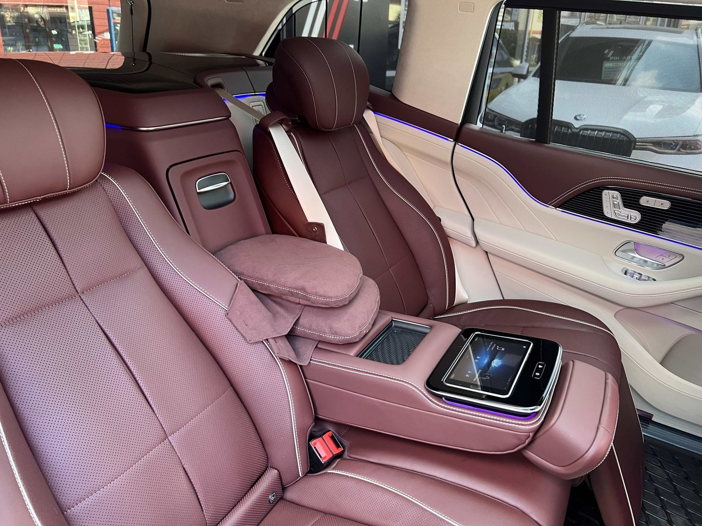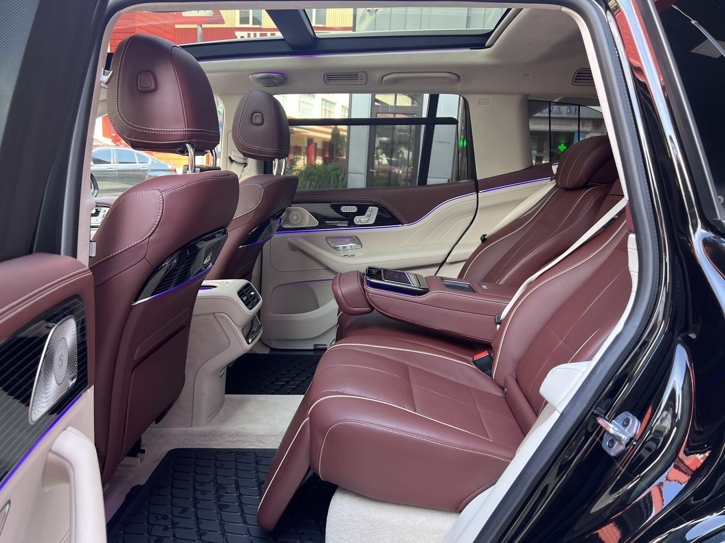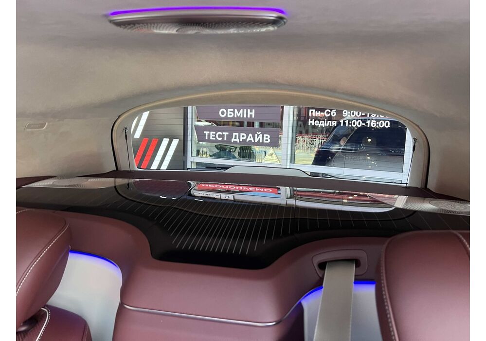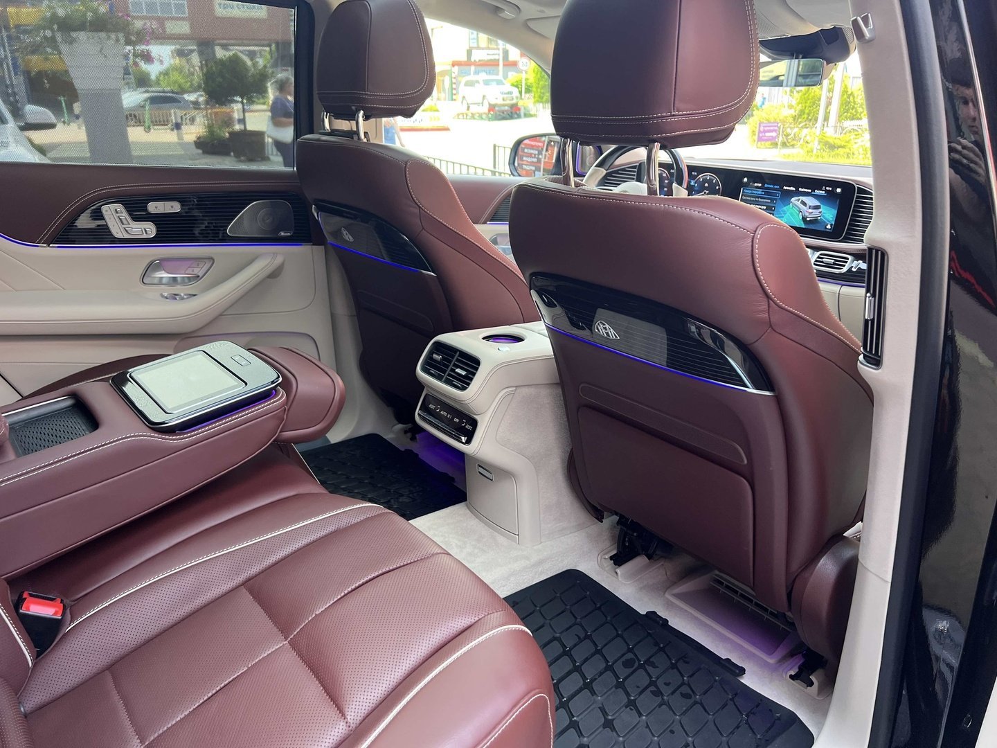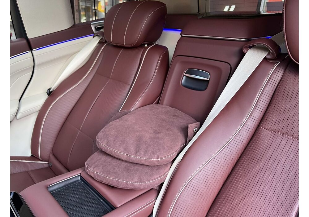 У Maybach GLS використана та ж колісна база, що й у стандартному кросовері, але задній ряд відсунутий назад на 120 мм. Його можна отримати в три або двомісному виконанні (третій ряд для моделі не передбачений взагалі, зате об'єм багажника за спинками другого ряду дорівнює 520 л). Двомісний варіант має крісла, спинки яких опускаються на кут в 43.5 градуса, підтримка гомілок входить у стандартну комплектацію, як і окремий планшет для управління мультимедіа, підсвічуванням і налаштуваннями крісел. За доплату задні пасажири можуть отримати холодильник на кількох пляшок та пару фірмових срібних склянок. Є також можливість замовити складні столики, які ховаються в центральний тунель, що поділяє пасажирів позаду, та розетки, що видають 230 В.