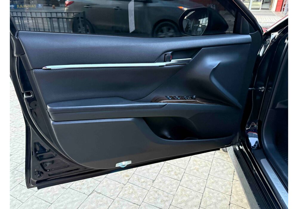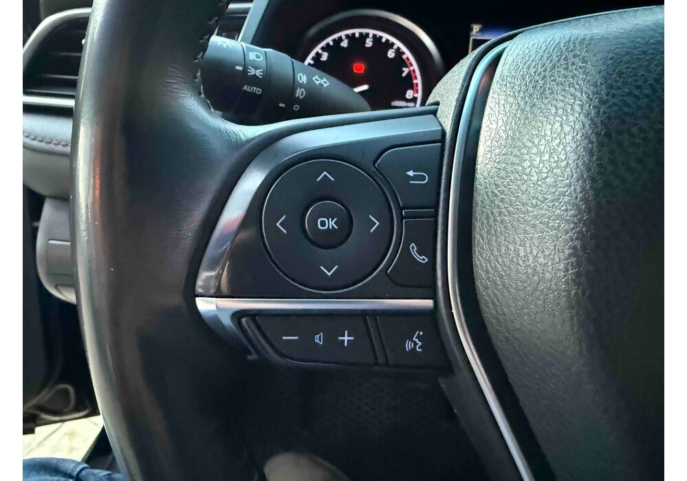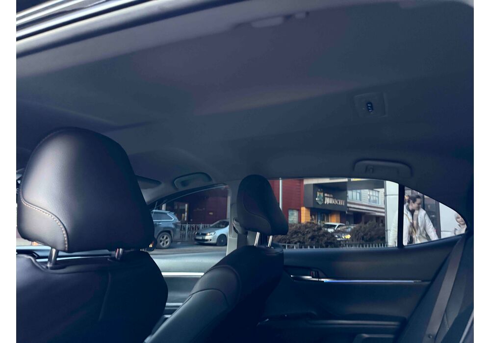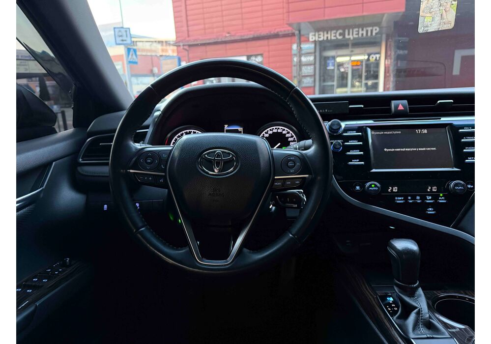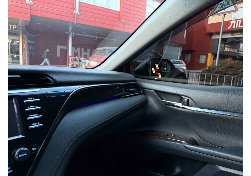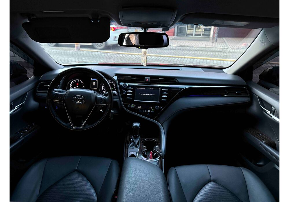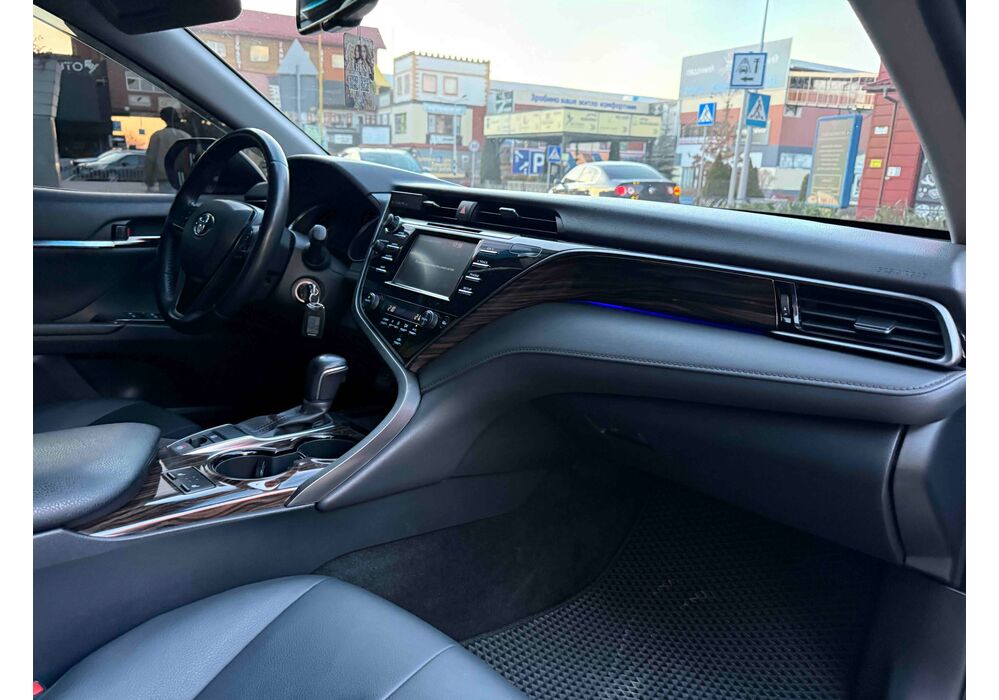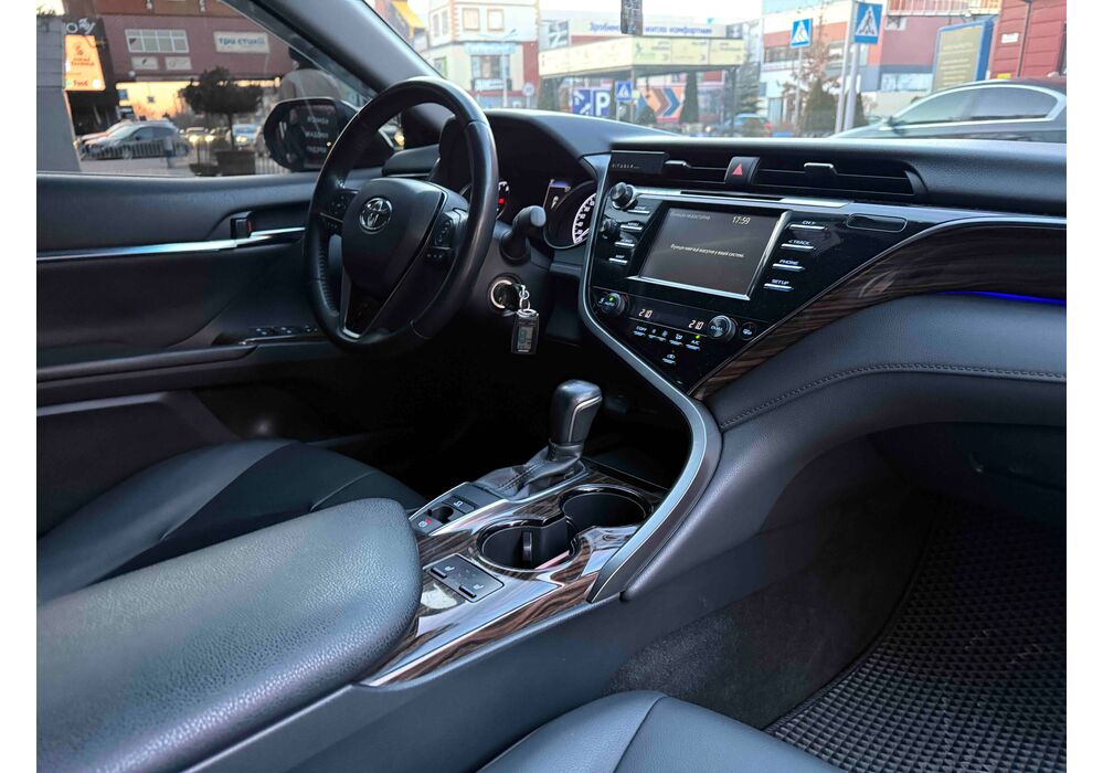 У салоні Тойота Камрі буде зацікавлювати не тільки простором, але і архітектурою - чого тільки варта асиметрична центральна консоль нахилена до водія. Також, в залежності від комплектації, на центральній консолі може красуватися як 7-дюймовий, так і 8-дюймовий сенсорний екран мультимедійної системи з акустичною системою JBL на 9 динаміків з підсилювачем і сабвуфером. В цілому ж список оснащення для Camry досить стандартний як для такого класу автомобілів: система безключового доступу, камера заднього виду, підігрів передніх / задніх сидінь, люк і т.д. Так само зросла і якість оздоблювальних матеріалів.