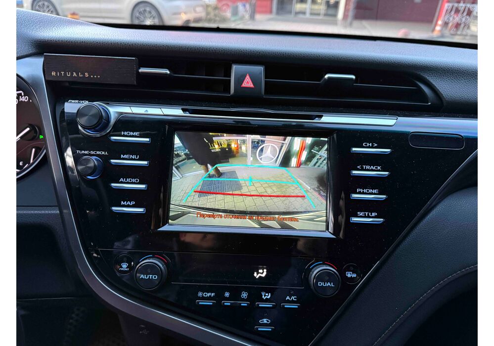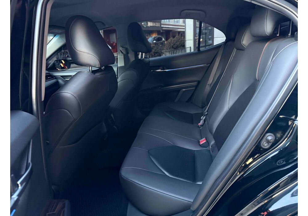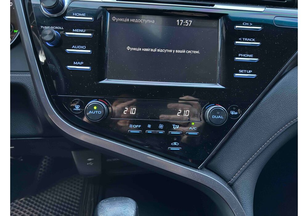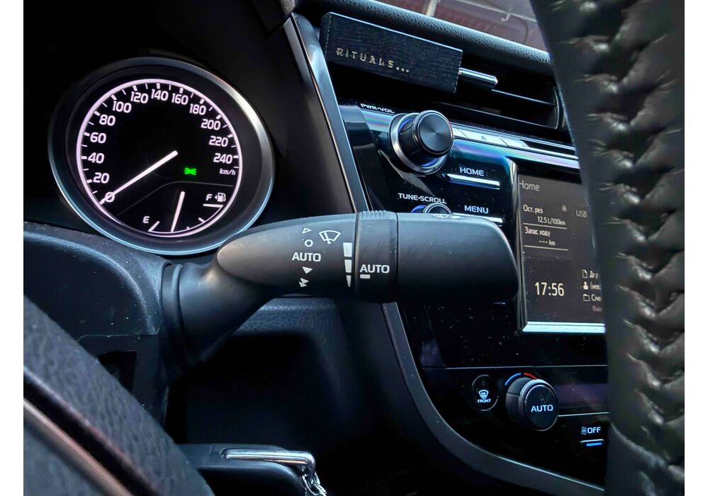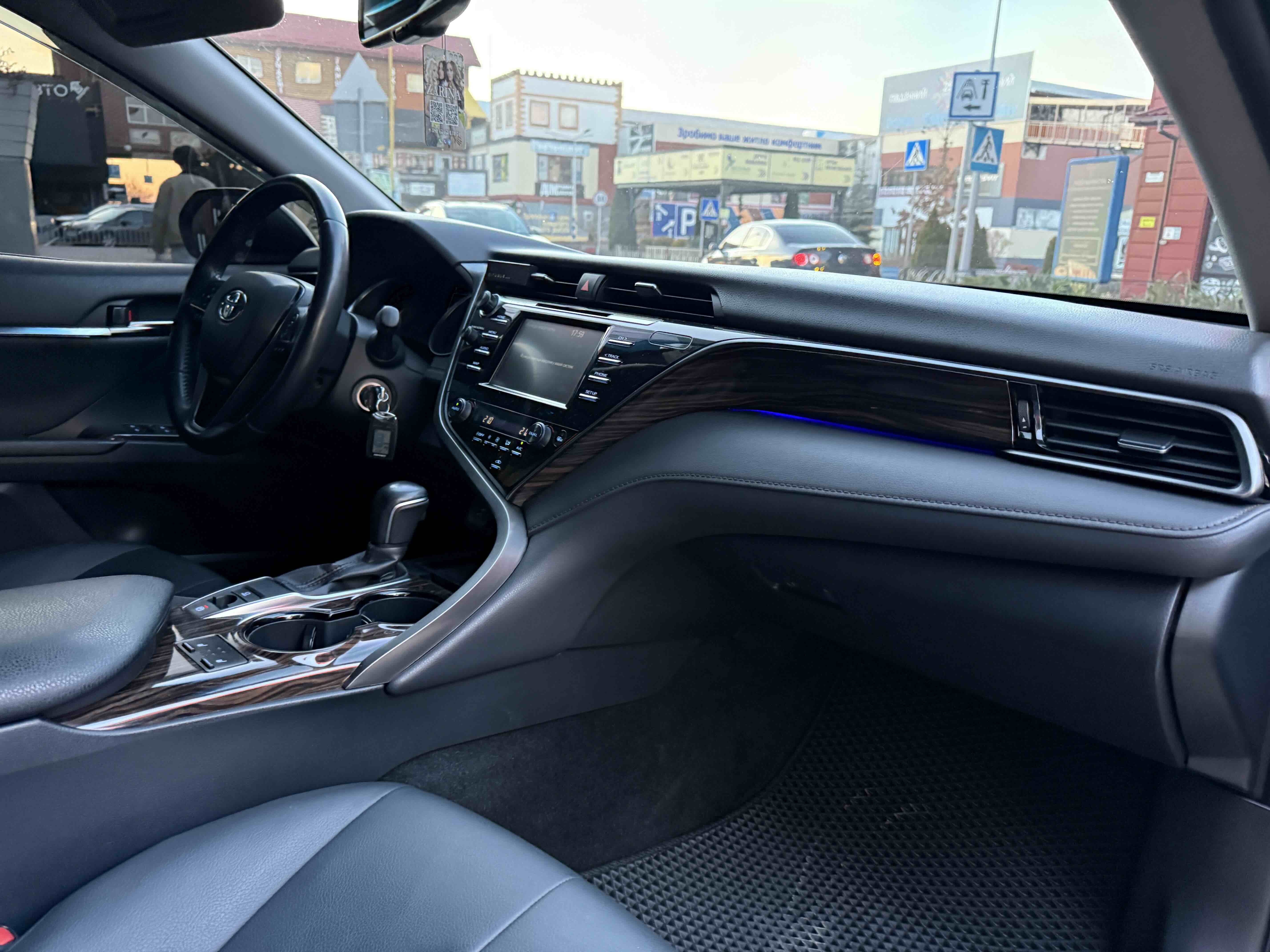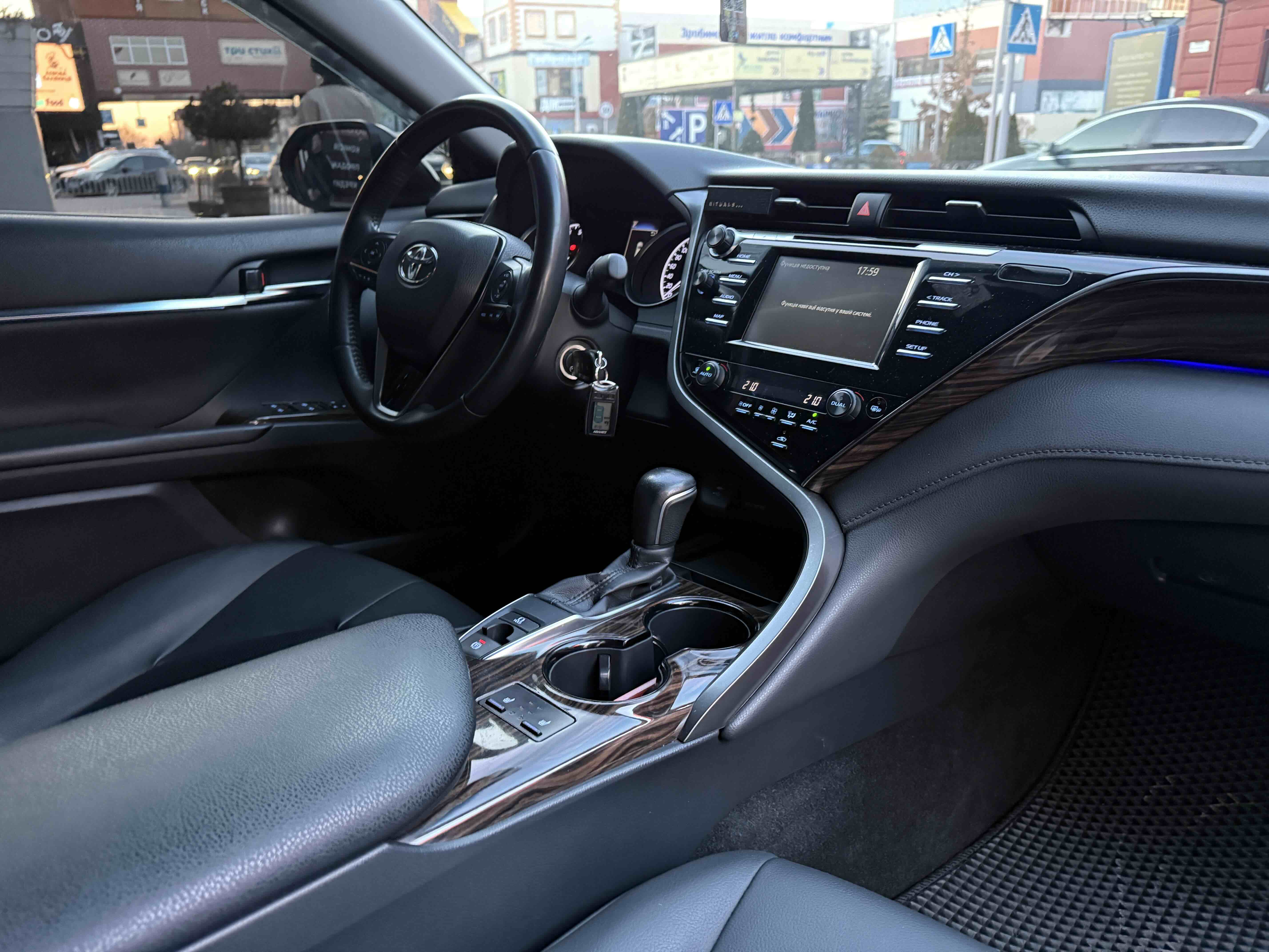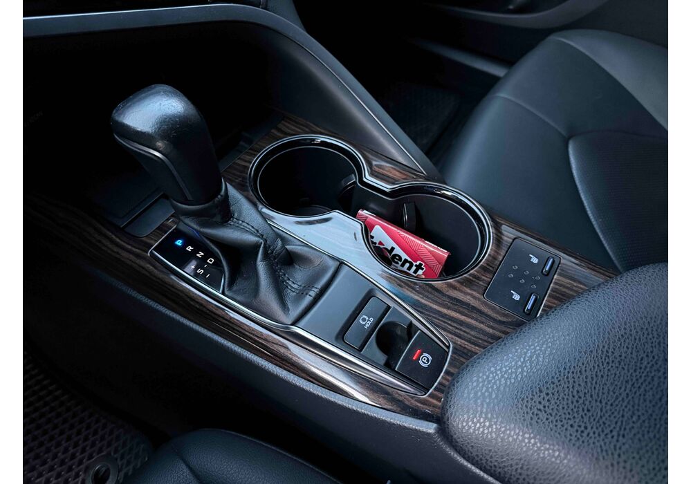 У салоні Тойота Камрі буде зацікавлювати не тільки простором, але і архітектурою - чого тільки варта асиметрична центральна консоль нахилена до водія. Також, в залежності від комплектації, на центральній консолі може красуватися як 7-дюймовий, так і 8-дюймовий сенсорний екран мультимедійної системи з акустичною системою JBL на 9 динаміків з підсилювачем і сабвуфером. В цілому ж список оснащення для Camry досить стандартний як для такого класу автомобілів: система безключового доступу, камера заднього виду, підігрів передніх / задніх сидінь, люк і т.д. Так само зросла і якість оздоблювальних матеріалів.