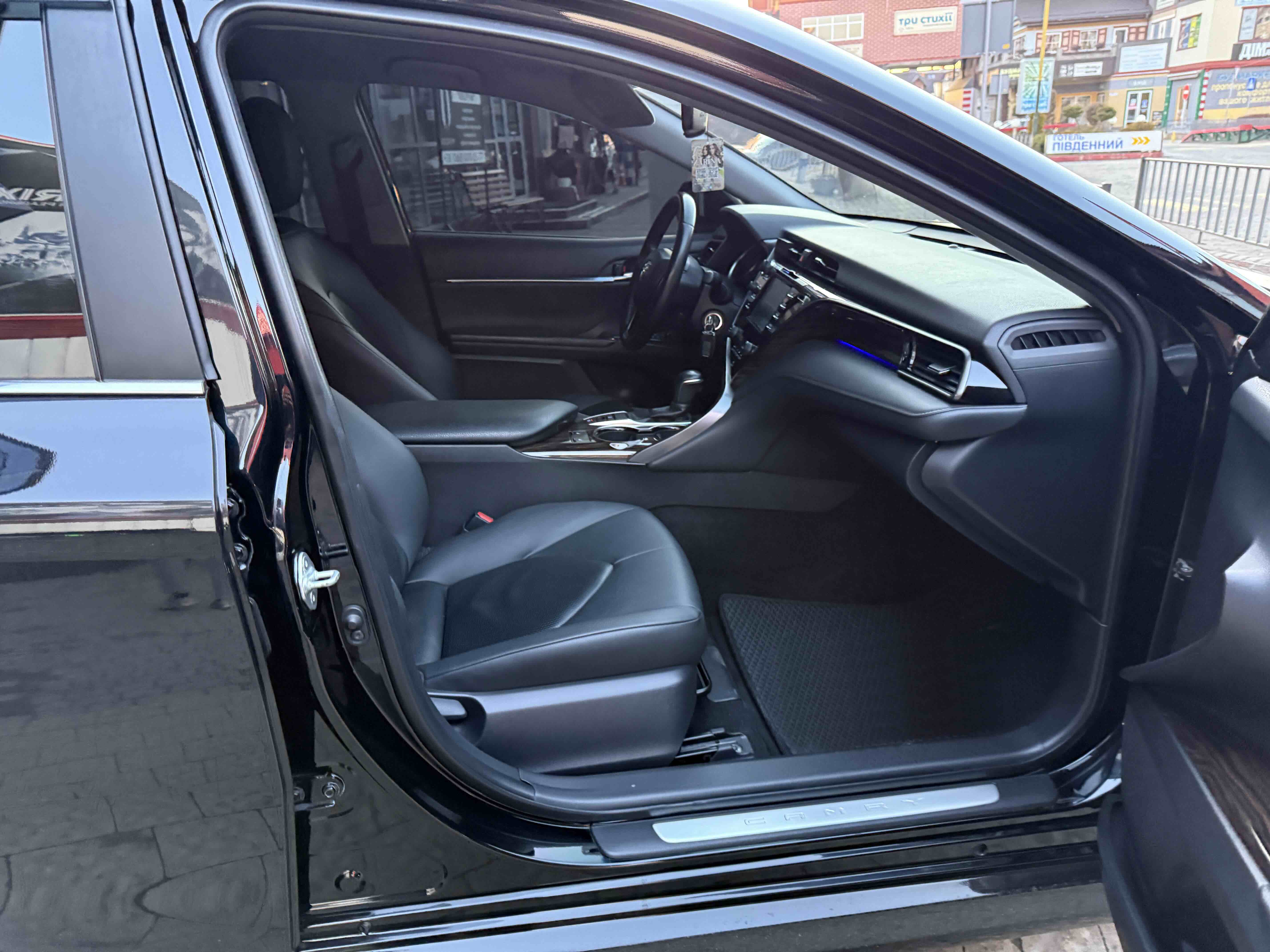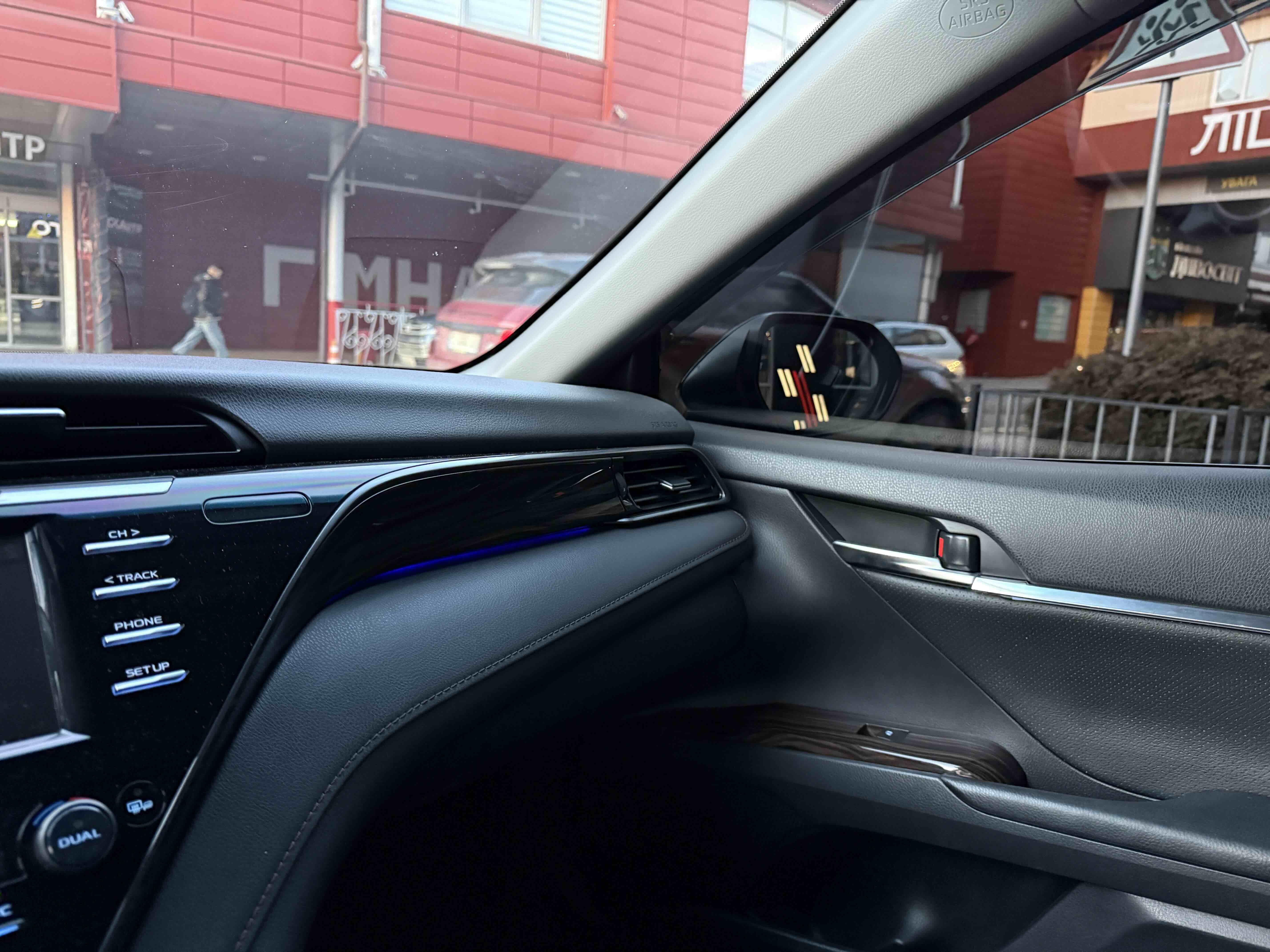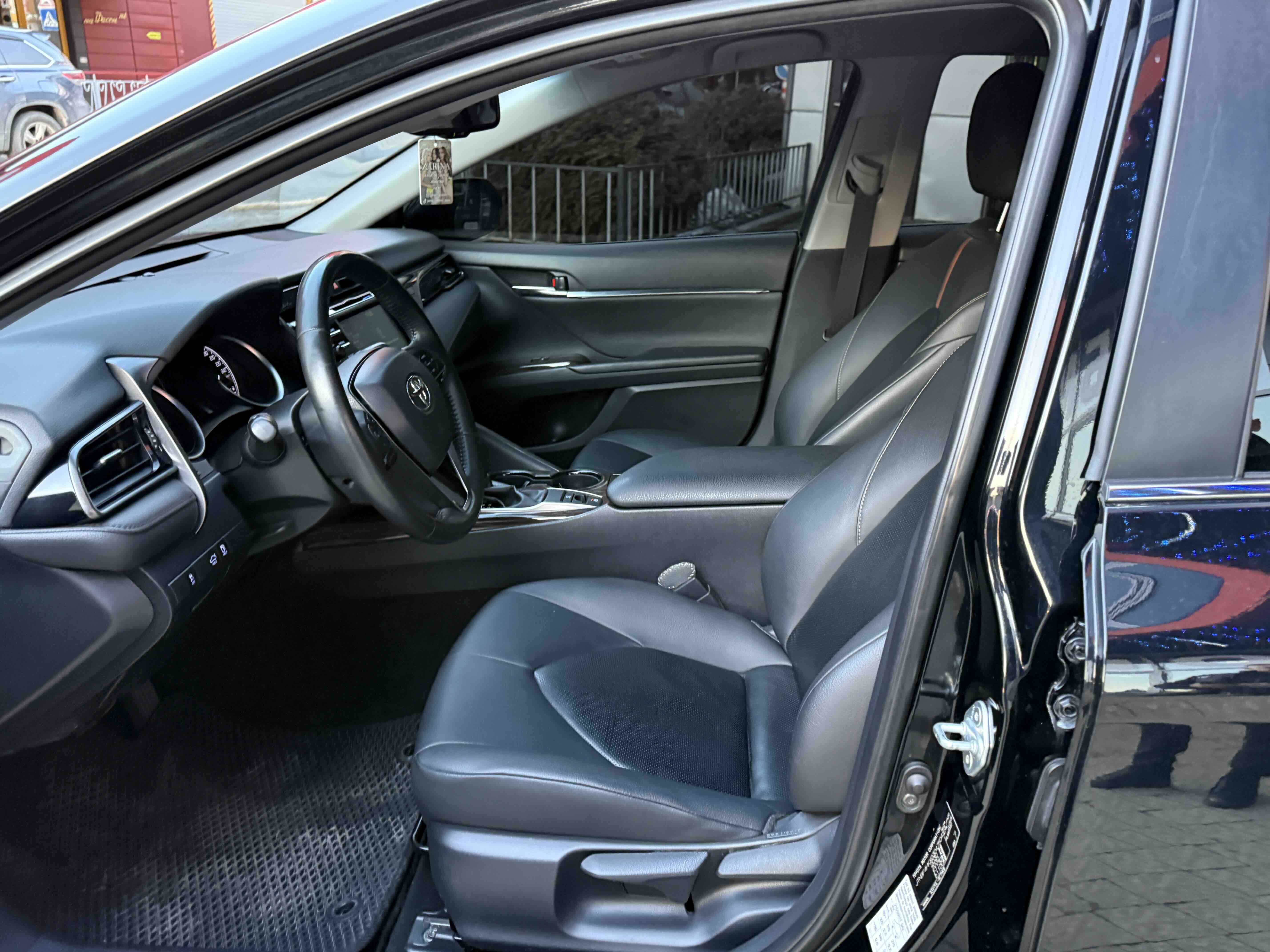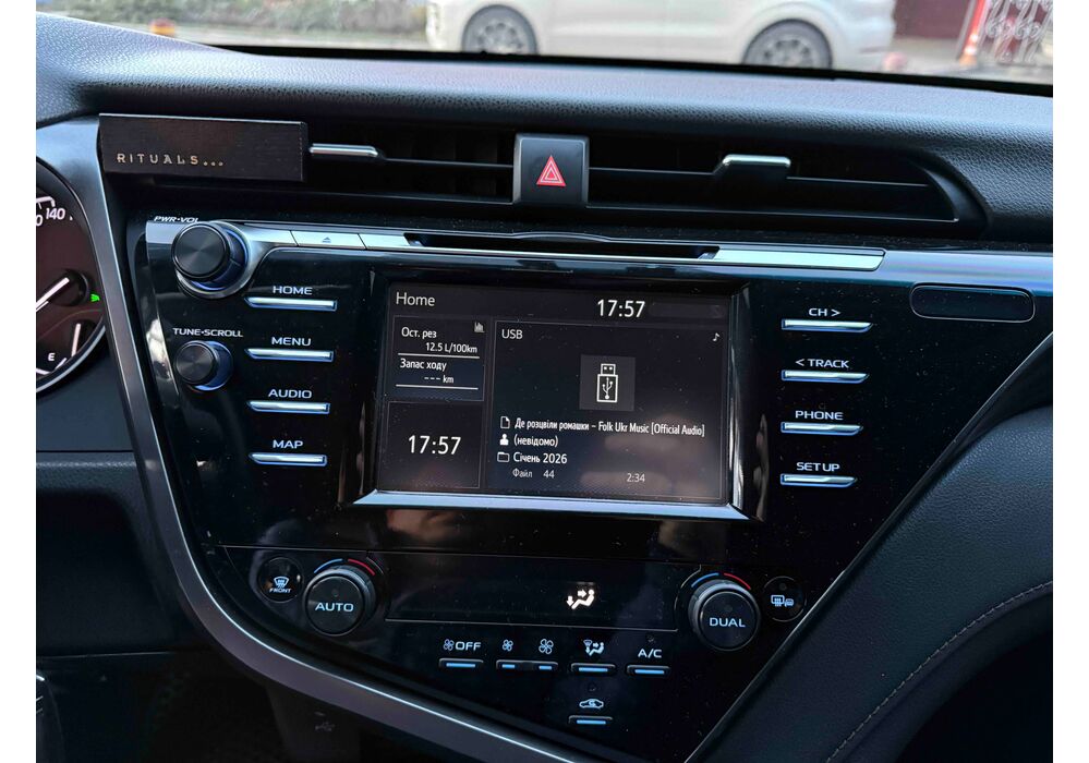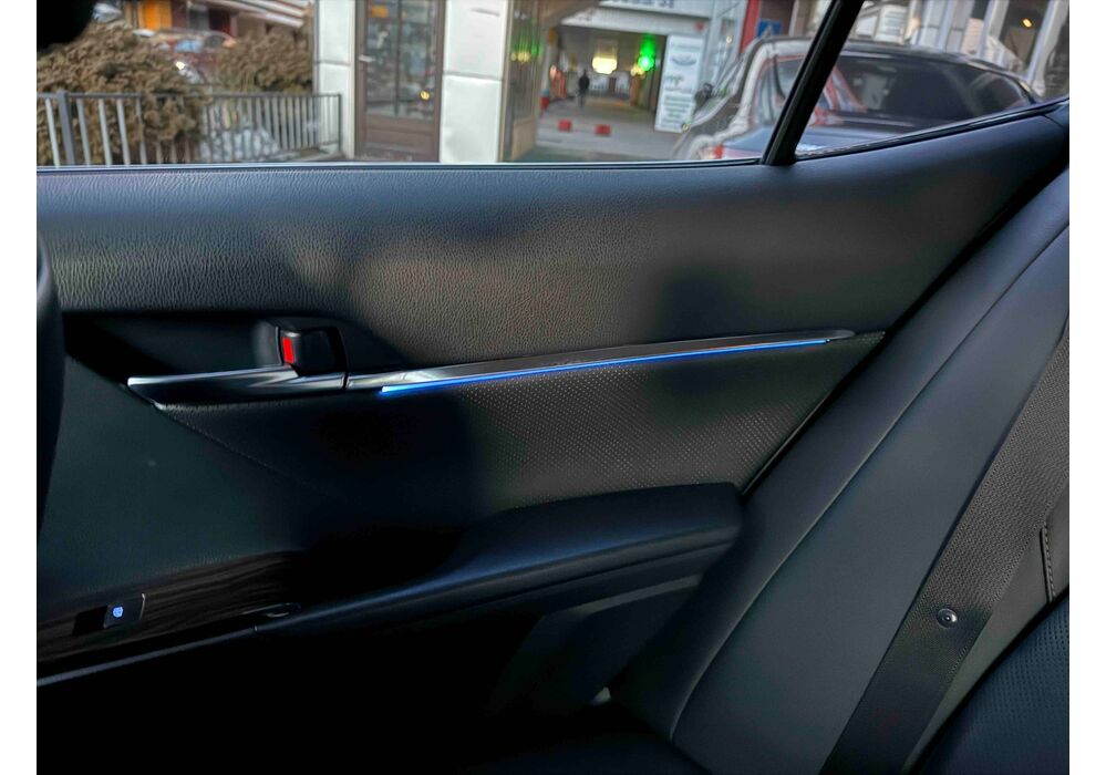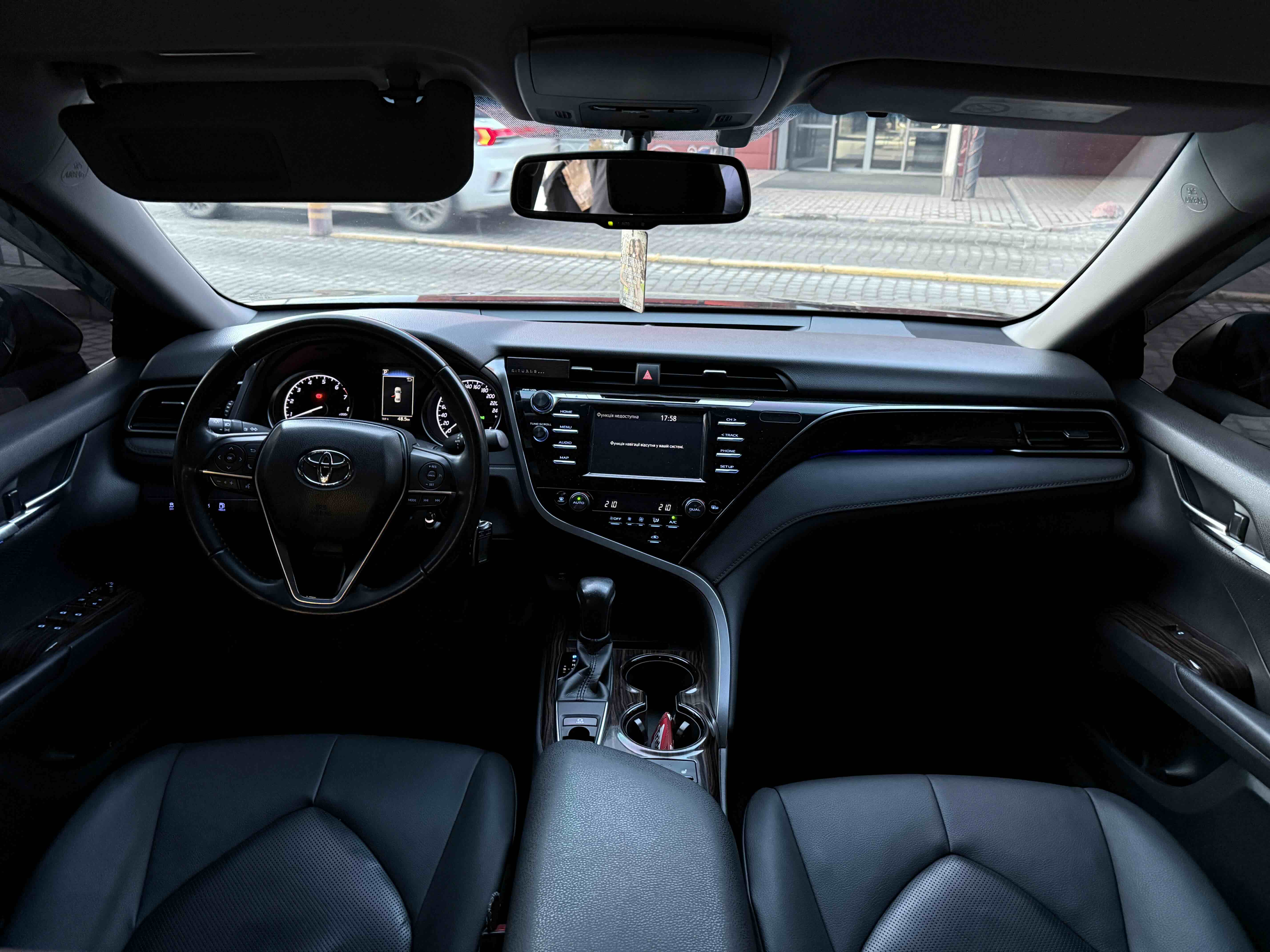 У салоні Тойота Камрі буде зацікавлювати не тільки простором, але і архітектурою - чого тільки варта асиметрична центральна консоль нахилена до водія. Також, в залежності від комплектації, на центральній консолі може красуватися як 7-дюймовий, так і 8-дюймовий сенсорний екран мультимедійної системи з акустичною системою JBL на 9 динаміків з підсилювачем і сабвуфером. В цілому ж список оснащення для Camry досить стандартний як для такого класу автомобілів: система безключового доступу, камера заднього виду, підігрів передніх / задніх сидінь, люк і т.д. Так само зросла і якість оздоблювальних матеріалів.