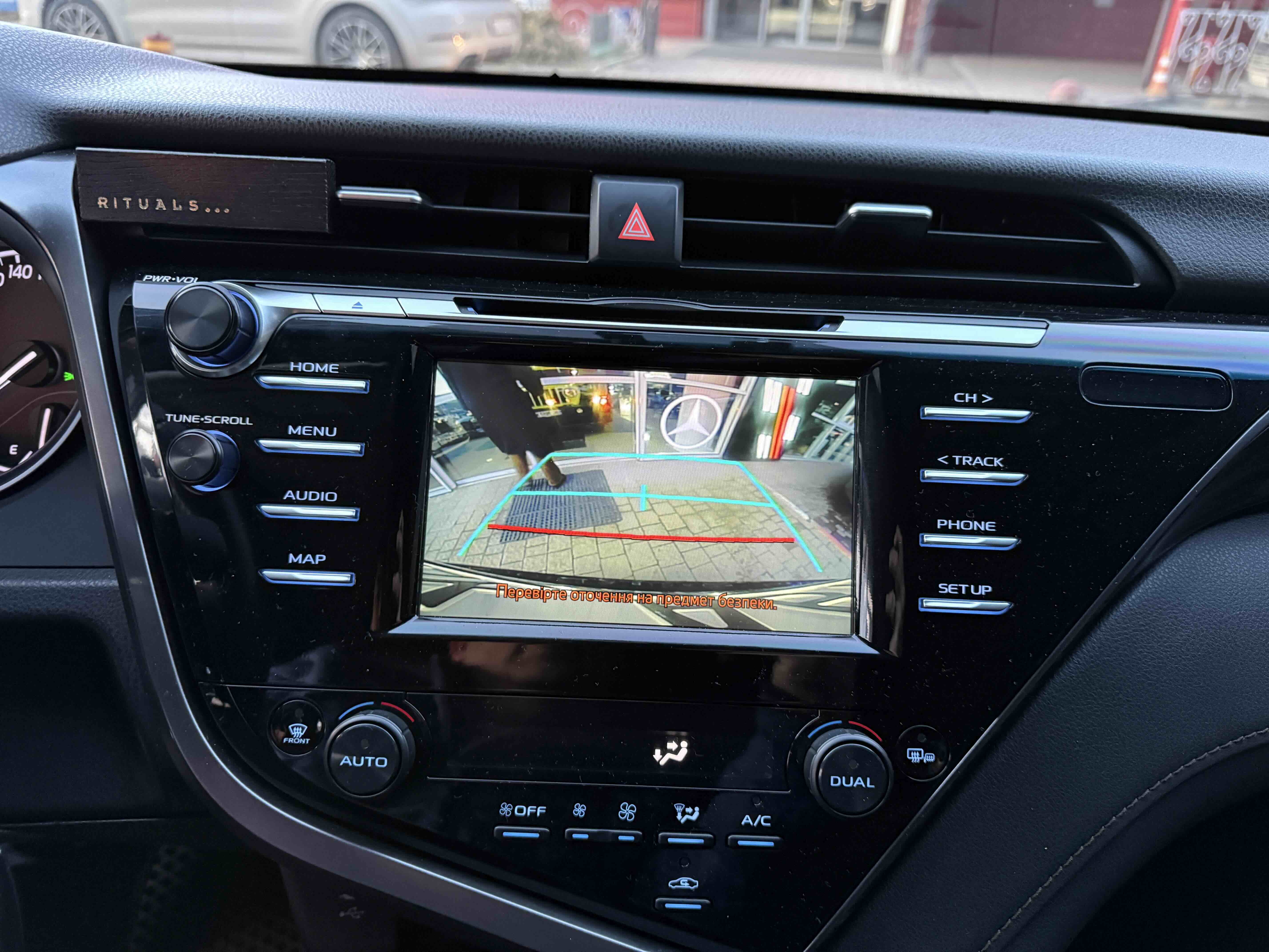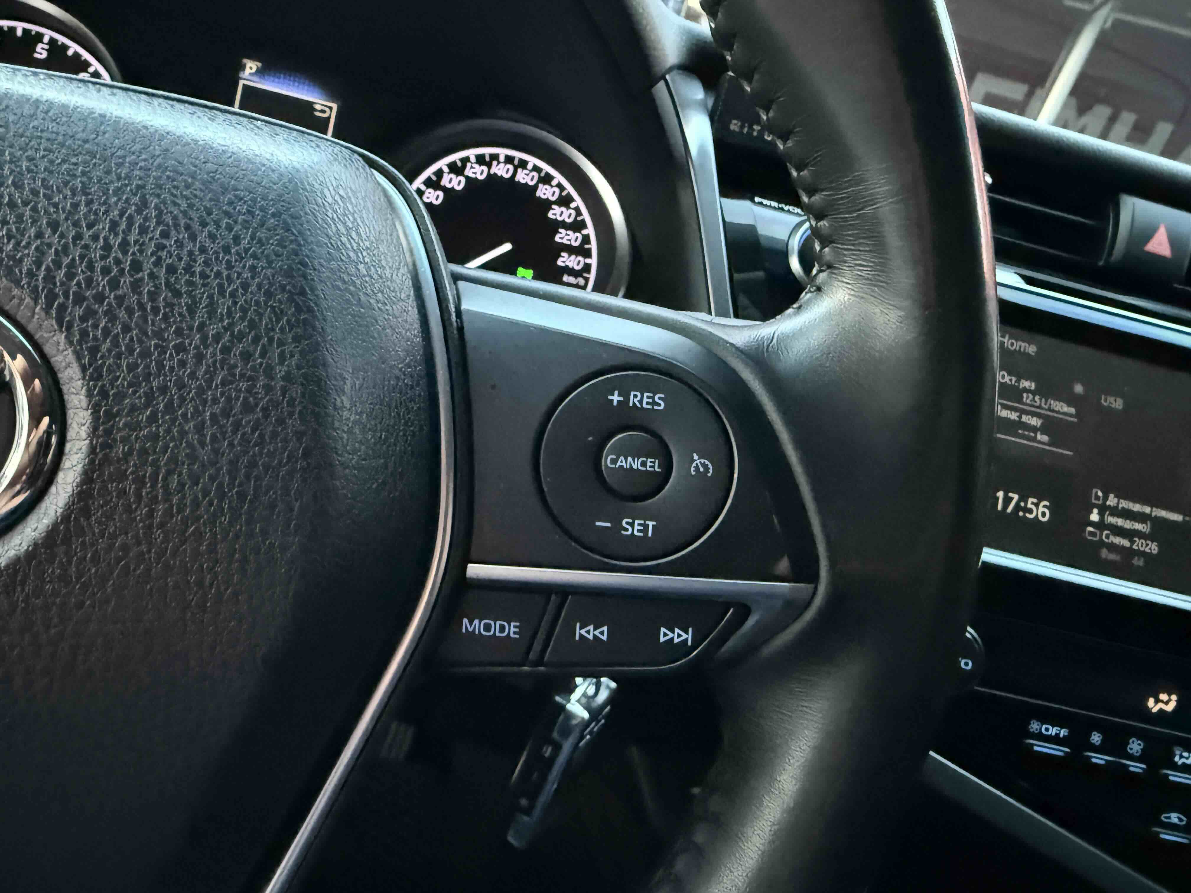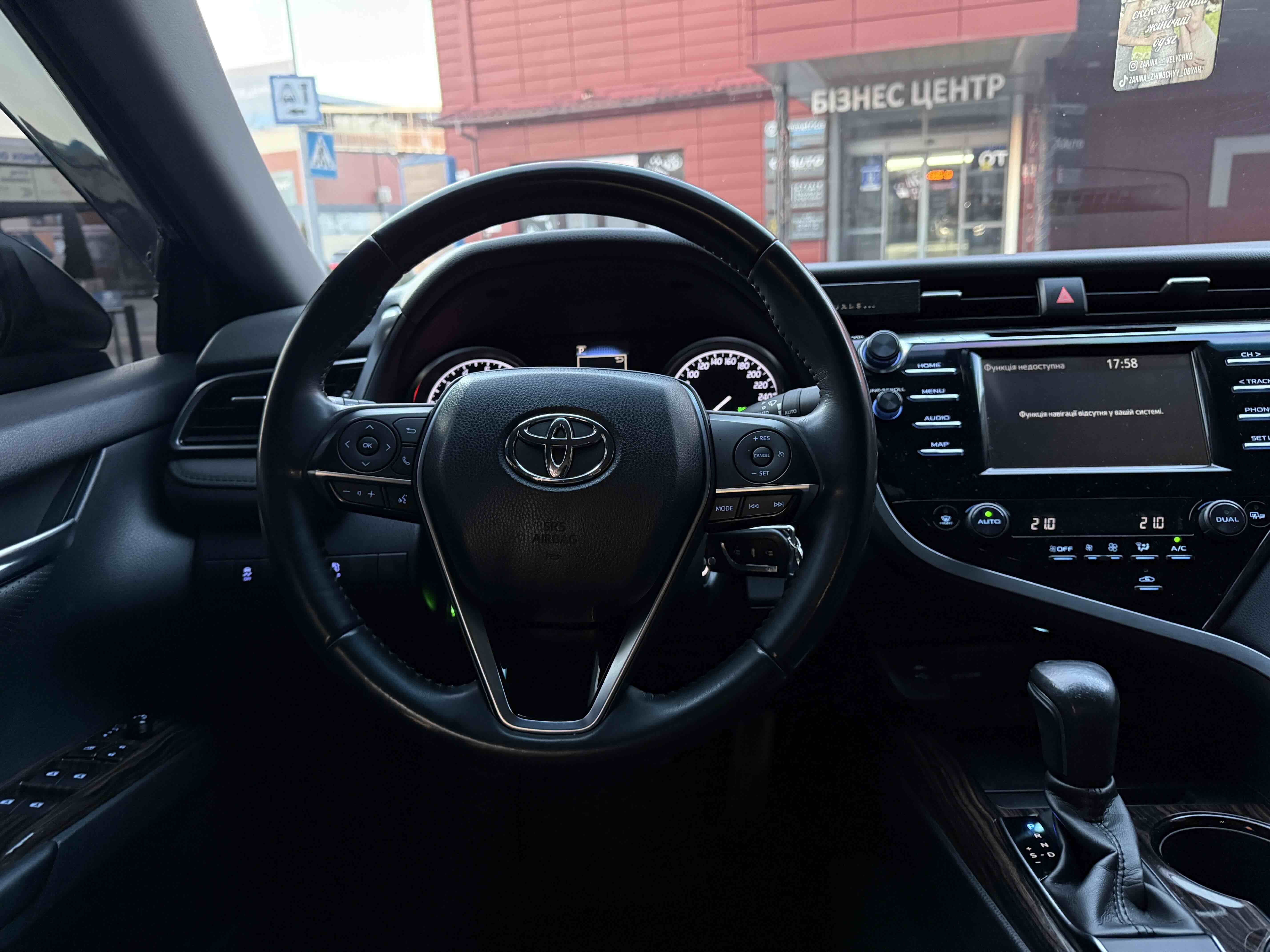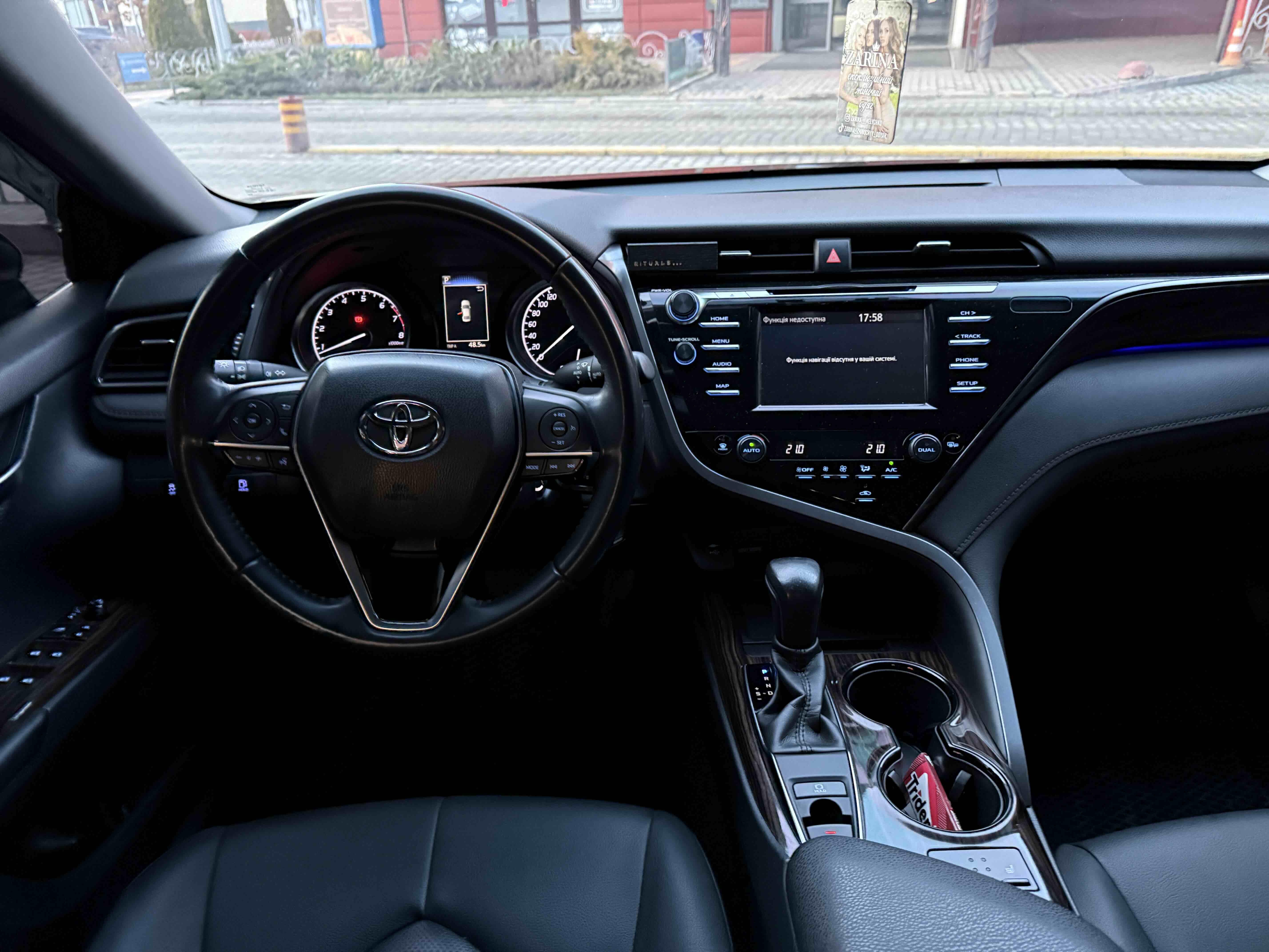 У салоні Тойота Камрі буде зацікавлювати не тільки простором, але і архітектурою - чого тільки варта асиметрична центральна консоль нахилена до водія. Також, в залежності від комплектації, на центральній консолі може красуватися як 7-дюймовий, так і 8-дюймовий сенсорний екран мультимедійної системи з акустичною системою JBL на 9 динаміків з підсилювачем і сабвуфером. В цілому ж список оснащення для Camry досить стандартний як для такого класу автомобілів: система безключового доступу, камера заднього виду, підігрів передніх / задніх сидінь, люк і т.д. Так само зросла і якість оздоблювальних матеріалів.