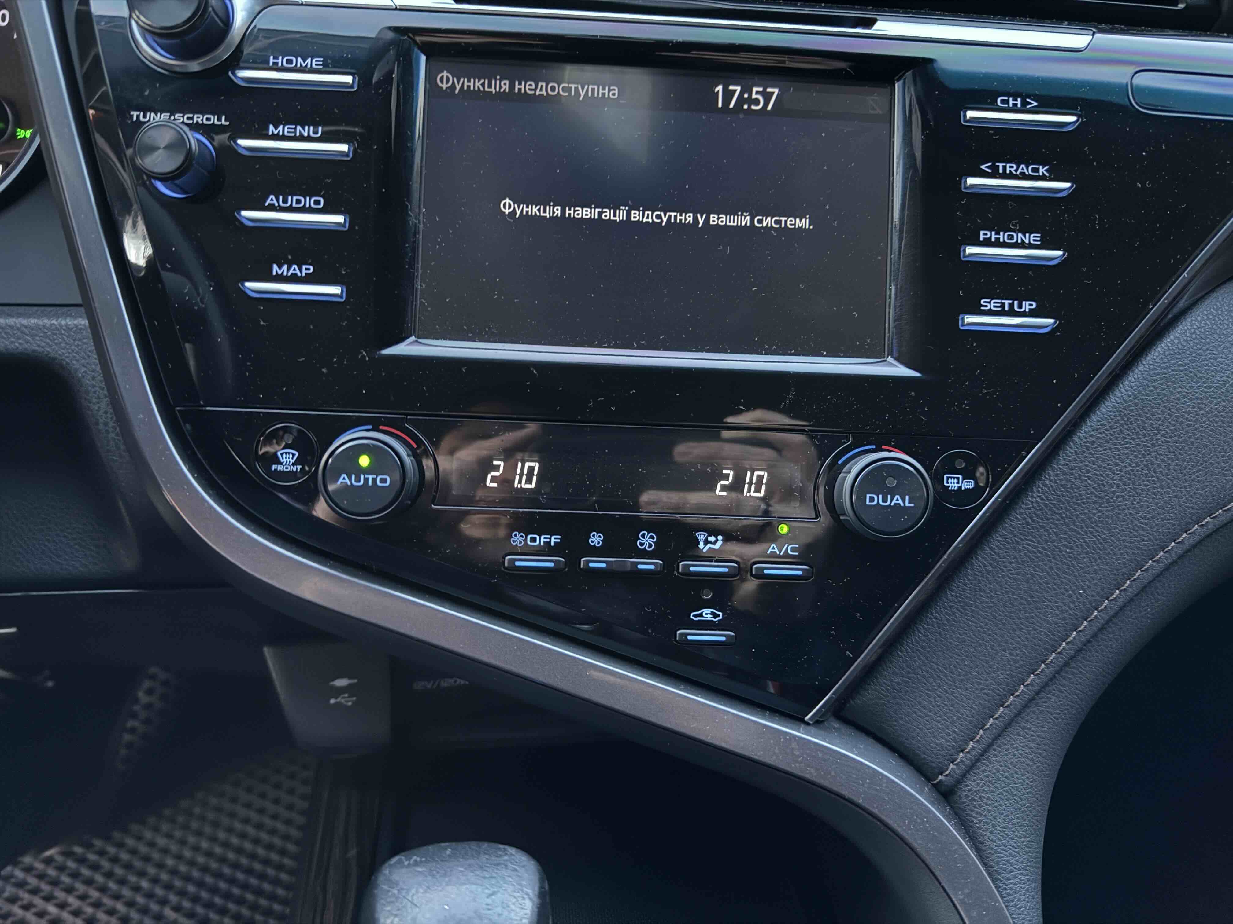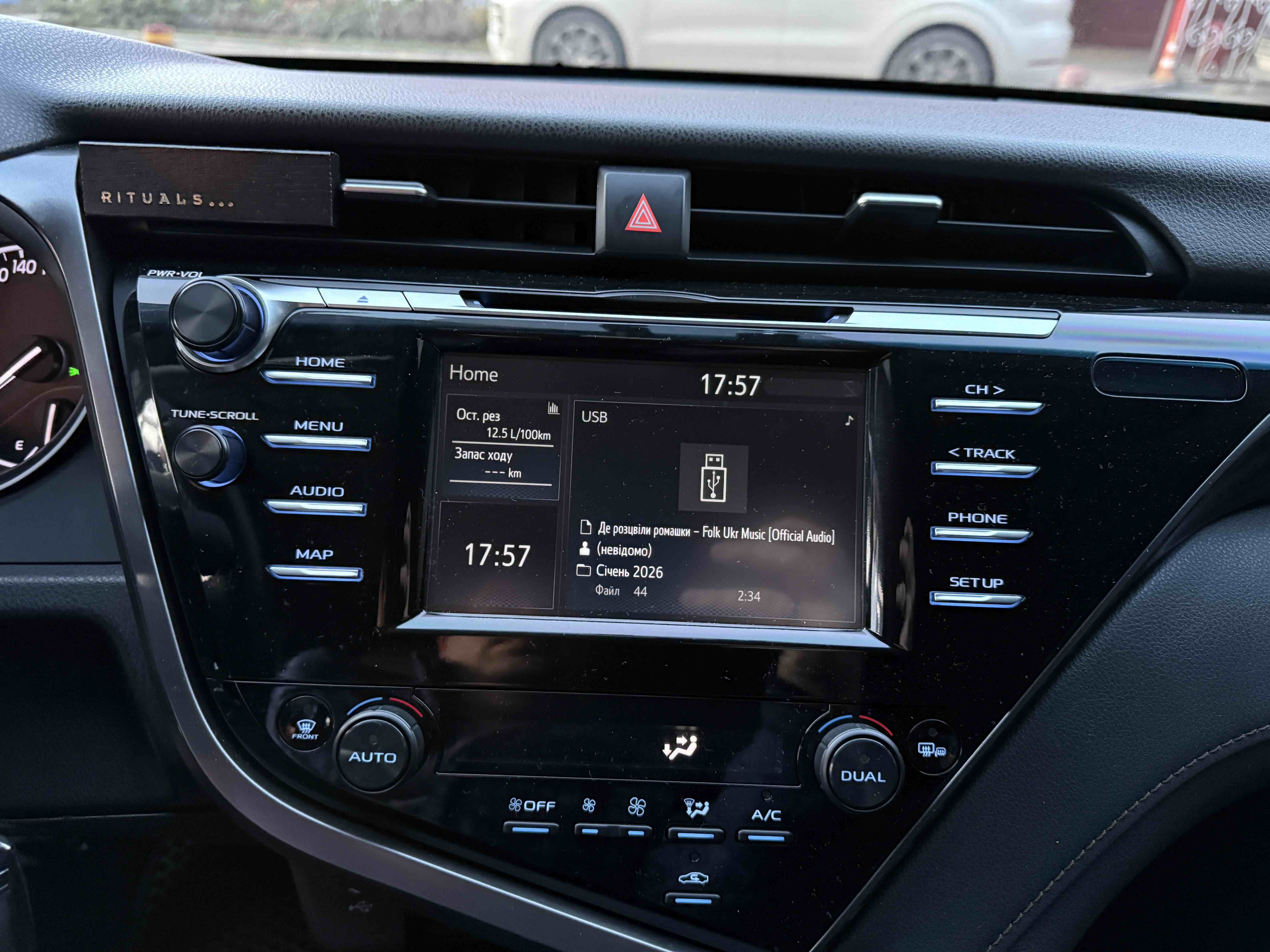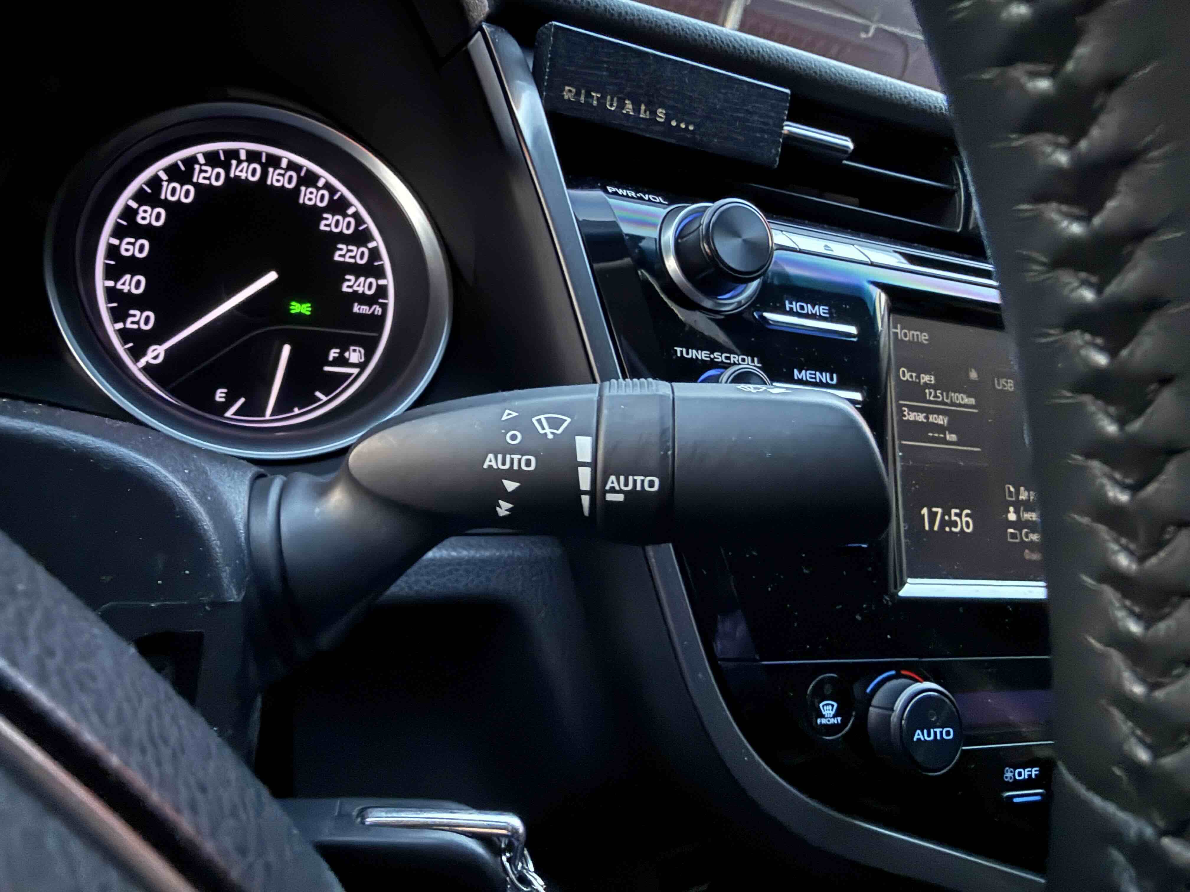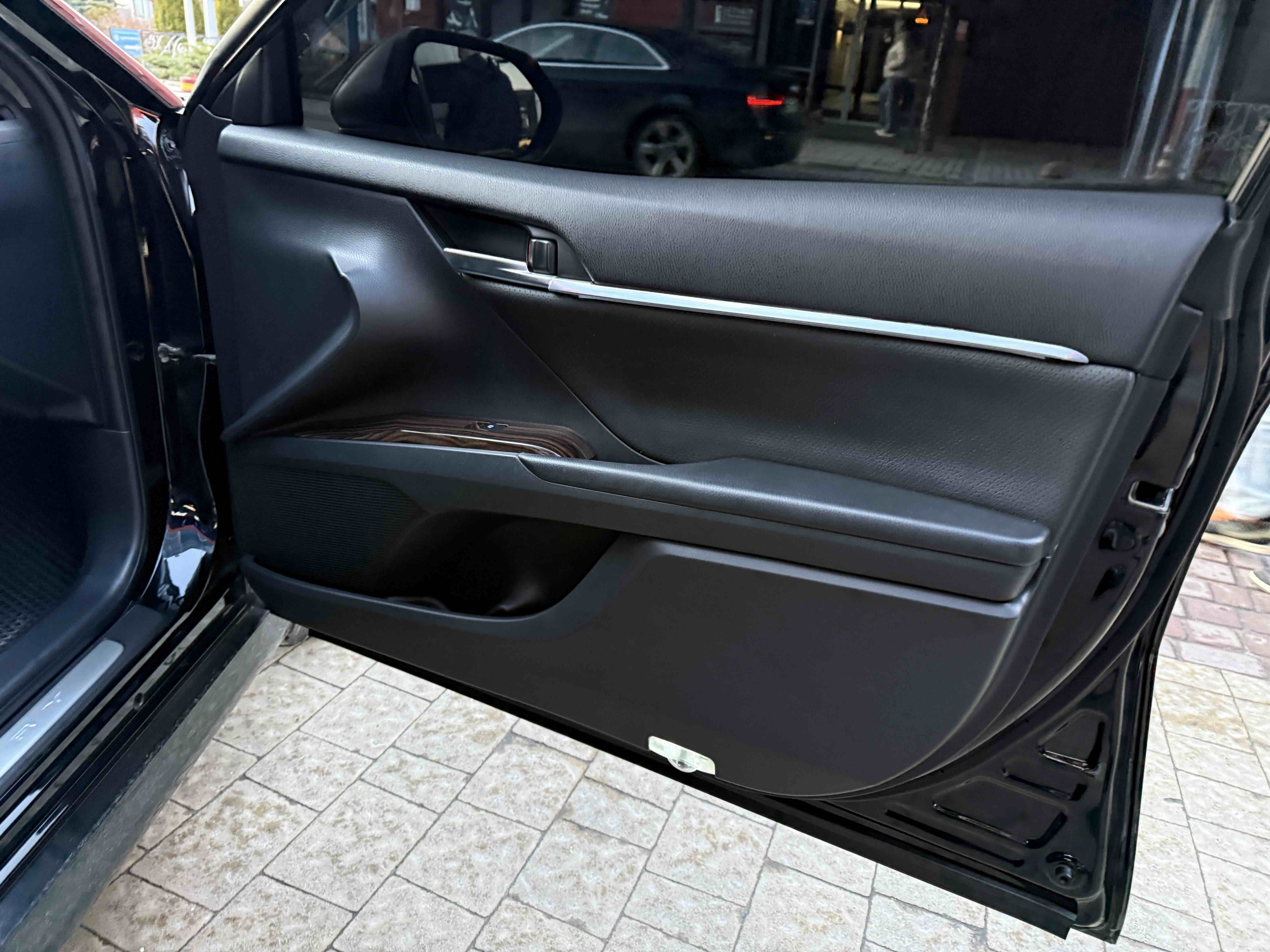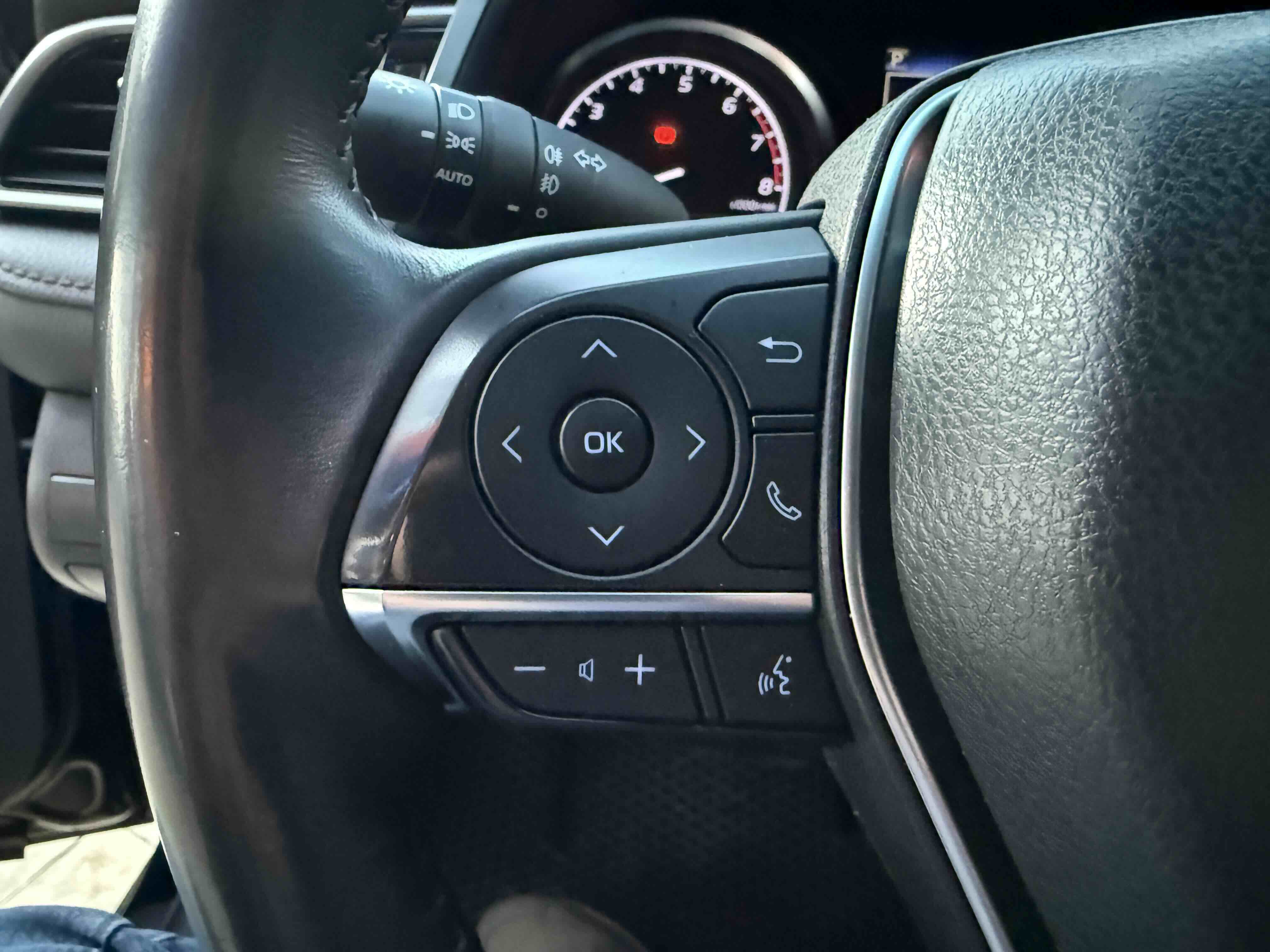 У салоні Тойота Камрі буде зацікавлювати не тільки простором, але і архітектурою - чого тільки варта асиметрична центральна консоль нахилена до водія. Також, в залежності від комплектації, на центральній консолі може красуватися як 7-дюймовий, так і 8-дюймовий сенсорний екран мультимедійної системи з акустичною системою JBL на 9 динаміків з підсилювачем і сабвуфером. В цілому ж список оснащення для Camry досить стандартний як для такого класу автомобілів: система безключового доступу, камера заднього виду, підігрів передніх / задніх сидінь, люк і т.д. Так само зросла і якість оздоблювальних матеріалів.